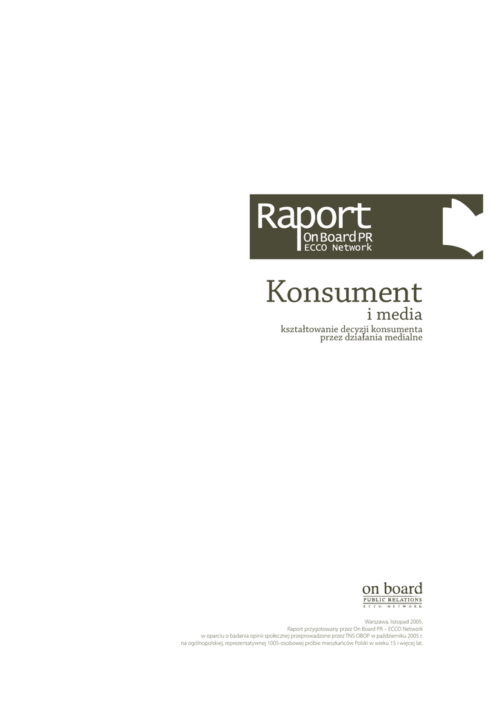 Konsument i media kształtowanie decyzji konsumenta przez działania medialne Warszawa, listopad 2005. Raport przygotowany przez On Board PR – ECCO Network w oparciu o badania opinii społecznej przeprowadzone przez TNS OBOP w październiku 2005 r. na ogólnopolskiej, reprezentatywnej 1005-osobowej próbie mieszkańców Polski w wieku 15 i więcej lat. Konsument i media Strategia komunikacyjna firmy powinna uwzględniać kluczową rolę, którą w budowaniu postaw i opinii społecznych odgrywają media. Dziennikarze są postrzegani jako źródło informacji o wysokiej wiarygodności, a wygłaszane przez nich sądy mają realny wpływ na zachowania klientów, decydując o podejmowanych przez nich decyzjach. • Lepiej zapobiegać niż leczyć. Ochrona reputacji i zagadnienia związane z media relations mają bezpośrednie przełożenie na sprzedaż. Prowadzenie działań komunikacyjnych z uwzględnieniem mediów może mieć bezpośredni wpływ na wyniki biznesowe. • Media mają znacznie większy zasięg niż wynika to z ich nakładów. Ich odbiorcy często przekazują sobie informacje zaczerpnięte z artykułów – najchętniej o katastrofach i aferach, choć niemal równie chętnie np. o wydarzeniach lokalnych. Firmy powinny uwzględniać to w swojej strategii komunikacji i kreować wydarzenia interesujące dla grup docelowych. • Największym zaufaniem społecznym cieszą się media elektroniczne: programy telewizyjne i radiowe. Dlatego w prowadzeniu kampanii informacyjnych kluczowa jest strategiczna współpraca z tymi mediami. Artykuły w prasie drukowanej plasują się za publikacjami w Internecie, jednak w przypadku Sieci ponad połowa społeczeństwa deklaruje, że w ogóle do nich nie sięga. Dlatego nie należy liczyć, że Internet stanie się w najbliższych latach podstawowym źródłem informacji dla społeczeństwa. Konsument i media Lepiej zapobiegać niż leczyć Negatywne publikacje na temat firm przekładają się bezpośrednio na sprzedaż. Artykuły lub audycje, które przedstawiają firmę lub jej produkty w niekorzystnym świetle, mają konkretny wpływ na postawy ludzkie. Dziennikarz i jego opinie są jednym z podstawowych źródeł wiarygodnej informacji. Naturalnie, negatywne opinie mediów mogą mieć różną przyczynę, a co za tym idzie – wpływać w różny sposób na zacho wania ludzkie. Na przykład reakcja odbiorców na informacje o wykorzystywaniu pracowników w mniejszym stopniu wpłynie na sprzedaż niż np. doniesienie o wykryciu wad produktu. Niemniej nie należy liczyć, że prowadzenie intensywnych działań promocyjnych przy jednoczesnym zaniechaniu ochrony dobrej reputacji jest dobrym pomysłem. Dodatkowo należy pamiętać, że różne grupy społeczne wykazują różną wrażliwość na sytuacje kryzysowe. W przypadku produktów adresowanych do najmłodszych odbiorców niekorzystne wiadomości pojawiające się w prasie mogą zniechęcić nawet 53% klientów. Stosunkowo najmniej wrażliwą grupą są najstarsi, choć nawet wśród nich aż 35% przyznaje, że informacje o oszustwach związanych z produkcją mogą wpływać na ich decyzje dotyczące zakupu produktów danej marki. Na kryzys dotykający firmę najwrażliwsi są młodzi – to oni najczęściej zrezygnują z zakupów Informacje pojawiające się w mediach mogą mieć także silny pozytywny wpływ na sprzedaż. Tu również bardziej liczą się wydarzenia związa ne z samym produktem, usługą niż z ogólnym wizerunkiem producenta czy dostawcy. Publika cja o przyznaniu firmie nagrody czy wyróżnienia np. za wysoką jakość produktów zachęca do zakupu prawie 1/3 Polaków. Korzystny wpływ podobnych doniesień jest tym większy, im wyższe jest wykształcenie odbiorców (w grupie osób z wykształceniem wyższym odsetek osób zachęconych sięga 40%). Informacje tego typu nie mają dużego znaczenia dla większości emerytów i rencistów (deklaruje to 58%) oraz dla osób w złej sytuacji materialnej. Na informacje o sukcesach firmy wrażliwsze są kobiety. Czy zdarzyło się, że podane przykłady wiadomości z telewizji lub prasy na temat firmy wpłynęły na to, że nie chciał(a) Pan(i) kupować produktów takiej firmy lub korzystać z jej usług? (odpowiedzi twierdzące) 50 % 45 % 40 % 44 % 35 % 30 % 25 % 20 % 32 % 15 % 10 % 5% 0% Informacje o wykorzy stywaniu pracowników, zwolnieniach, aferach związanych ze złym zarządzaniem firmą Informacje o wykryciu niskiej jakości produktu firmy, oszustw związanych z produkcją itp. Działalność charytatywna, społeczna firmy także wzmacnia sprzedaż, choć w zauważalnie mniej szym stopniu. Znaczenie zaangażowania społe cznego firmy rośnie wraz z wykształceniem odbiorców. Grupami najbardziej wrażliwymi na ten rodzaj działań są: osoby w wieku 20-29 lat, ludzie dobrze sytuowani, mieszkańcy dużych aglomeracji miejskich. Co oznacza to z punktu widzenia strategicznego planowania komuni kacji? Konieczność przemyślanego wyboru przedsięwzięć, które realizuje przedsiębiorstwo. Konsument i media Na przykład oferując masowy, tani produkt nie warto angażować się w programy społeczne w stopniu, w którym byłoby to wskazane w przypadku instytucji oferujących swoje usługi dla dobrze sytuowanych i wykształconych odbiorców. Z drugiej strony wskazany jest udział firmy w programach bezpośrednio podkreślających jakość produktów. Czy zdarzyło się, że podane przykłady wiadomości zachęciły Pana(ią) do zakupów produktów bądź usług? (odpowiedzi twierdzące) 50 % 45 % 40 % 35 % 30 % 25 % 20 % 15 % 10 % 23 % 30 % 5% 0% Informacje o działalności społecznej, charytatywnej prowadzonej przez firmę Informacje o przy znaniu firmie nagrody, wyróżnienia, np.za wysoką jakość produktów lub usług Działania wizerunkowe mają mniejsze znaczenie dla odbiorców masowego, taniego produktu Charakterystyczne jest, że wskazania dotyczące negatywnych reakcji (zniechęcenia do zakupu) są znacznie częst