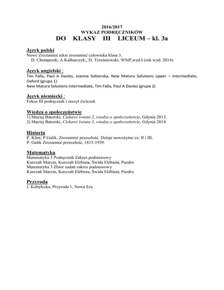 2016/2017 WYKAZ PODRĘCZNIKÓW DO KLASY III LICEUM – kl. 3a Język polski Nowe Zrozumieć tekst zrozumieć człowieka klasa 3. D. Chemperek; A.Kalbarczyk;, D. Trześniowski, WSiP,wyd.I (rok wyd. 2014) Język angielski : Tim Falla, Paul A Davies, Joanna Sobierska, New Matura Solutions upper – intermediate, Oxford (grupa 1) New Matura Solutions intermediate, Tim Falla, Paul A Davies (grupa 2) Język niemiecki : Fokus III podręcznik i zeszyt ćwiczeń Wiedza o społeczeństwie 1) Maciej Batorski, Ciekawi świata 2, wiedza o społeczeństwie, Gdynia 2013. 2) Maciej Batorski, Ciekawi świata 3, wiedza o społeczeństwie, Gdynia 2014. Historia P. Klint, P.Galik. Zrozumieć przeszłość. Dzieje nowożytne cz. II i III. P. Galik Zrozumieć przeszłość, 1815-1939. Matematyka Matematyka 3 Podręcznik Zakres podstawowy Kurczab Marcin, Kurczab Elżbieta, Świda Elżbieta, Pazdro Matematyka 3 Zbiór zadań zakres podstawowy Kurczab Marcin, Kurczab Elżbieta, Świda Elżbieta, Pazdro Przyroda J. Kobyłecka, Przyroda 1, Nowa Era 2016/2017 WYKAZ PODRĘCZNIKÓW DO KLASY III LICEUM – kl. 3b Język polski Nowe Zrozumieć tekst zrozumieć człowieka cz 2.2;3 D. Chemperek; A.Kalbarczyk; D. Trześniowski, WSiP Język angielski grupa rozszerzona: Tim Falla, Paul A Davies, Joanna Sobierska, New Matura Solutions upper – intermediate, Oxford Język angielski grupa podstawowa: Repetytorium Maturalne Oxford Język niemiecki : Fokus III podręcznik i zeszyt ćwiczeń Wiedza o społeczeństwie Wiedza o społeczeństwie 2 i 3. Podręcznik. Zakres rozszerzony. Ciekawi świata Historia i społeczeństwo Adam Balicki Rządzący i rządzeni OPERON Matematyka Matematyka 3 Podręcznik Zakres podstawowy Kurczab Marcin, Kurczab Elżbieta, Świda Elżbieta, Pazdro Matematyka 3 Zbiór zadań zakres podstawowy Kurczab Marcin, Kurczab Elżbieta, Świda Elżbieta, Pazdro Przyroda J. Kobyłecka, Przyroda 1, Nowa Era 2016/2017 WYKAZ PODRĘCZNIKÓW DO KLASY III LICEUM – kl. 3f Język polski Nowe Zrozumieć tekst zrozumieć człowieka.2.2; 3 D. Chemperek; A.Kalbarczyk; D. Trześniowski, WSiP Język angielski : Repetytorium Maturalne Oxford poziom podstawowy (grupa 1i grupa 2) Język niemiecki : Fokus III podręcznik i zeszyt ćwiczeń Biologia Bonar Emilia, Krzeszowiec-Jeleń Weronika, Czachorowski Stanisław, Biologia na czasie 3. Podręcznik / Karty pracy ucznia Zakres rozszerzony, Historia i społeczeństwo 1)Jarosław Centek, Poznać przeszłość. Wojna i wojskowość, Warszawa 2015; 2)Karol Kłodziński, Tomasz Krzemiński, Poznać przeszłość, Europa i świat, Warszawa 2015. Matematyka Matematyka 3 Podręcznik Zakres rozszerzony Kurczab Marcin, Kurczab Elżbieta, Świda Elżbieta, Pazdro Matematyka 3 Zbiór zadań zakres rozszerzony Kurczab Marcin, Kurczab Elżbieta, Świda Elżbieta, Pazdro Elementy fizyki Maria Fiałkowska, Barbara Sagnowska, Jadwiga Salach, Z fizyką w przyszłość 2, WSiP (dawniej Zamkor) Elementy chemii politechnicznej M. Litwin, S. Styka-Wlazło, J. Szymońska . To jest chemia 2 Chemia organiczna