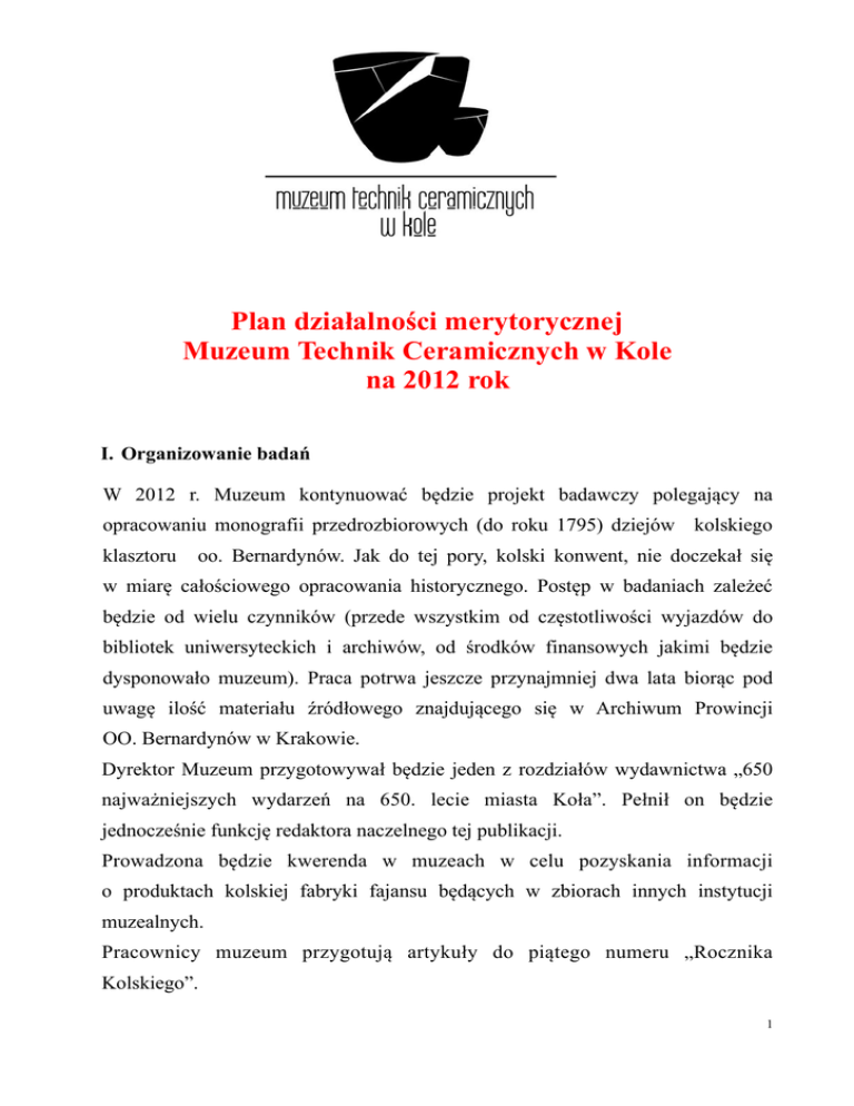 Plan działalności merytorycznej Muzeum Technik Ceramicznych w Kole na 2012 rok I. Organizowanie badań W 2012 r. Muzeum kontynuować będzie projekt badawczy polegający na opracowaniu monografii przedrozbiorowych (do roku 1795) dziejów kolskiego klasztoru oo. Bernardynów. Jak do tej pory, kolski konwent, nie doczekał się w miarę całościowego opracowania historycznego. Postęp w badaniach zależeć będzie od wielu czynników (przede wszystkim od częstotliwości wyjazdów do bibliotek uniwersyteckich i archiwów, od środków finansowych jakimi będzie dysponowało muzeum). Praca potrwa jeszcze przynajmniej dwa lata biorąc pod uwagę ilość materiału źródłowego znajdującego się w Archiwum Prowincji OO. Bernardynów w Krakowie. Dyrektor Muzeum przygotowywał będzie jeden z rozdziałów wydawnictwa „650 najważniejszych wydarzeń na 650. lecie miasta Koła”. Pełnił on będzie jednocześnie funkcję redaktora naczelnego tej publikacji. Prowadzona będzie kwerenda w muzeach w celu pozyskania informacji o produktach kolskiej fabryki fajansu będących w zbiorach innych instytucji muzealnych. Pracownicy muzeum przygotują artykuły do piątego numeru „Rocznika Kolskiego”. 1 II. Działalność edukacyjna Muzeum zorganizuje (wspólnie z Urzędem Miejskim w Kole), podobnie jak w latach poprzednich, VIII Konkurs Wiedzy Historycznej o mieście Kole. Skierowany będzie do uczniów szkół podstawowych i gimnazjów z terenu miasta. W czasie ferii zimowych i letnich muzeum zorganizuje zajęcia dla uczniów szkół podstawowych. Nadal dostępna będzie oferta lekcji muzealnych prowadzonych przy pomocy ciekawych metod i środków dydaktycznych. Oferta skierowana jest do uczniów wszystkich typów szkół. Zajęcia prowadzą pracownicy muzeum. Tematyka : - “Czy muzeum to tylko miejsce gdzie trzeba zachowywać się cicho i poważnie ?” - “Style architektoniczne na podstawie zabytków ziemi kolskiej”. - “Lokacje miast w średniowieczu na przykładzie Koła”. - “Tradycje kolskiej ceramiki”. - “Klasztor Bernardynów w Kole – jego historia i zabytki”. - “Jak to z Kołem było ?” - „Edmund Czapliński – pisarz i burmistrz Dąbia n. Nerem” - “Święty Mikołaj-prawda i legenda” - “Powstanie Wielkopolskie” - Święci karmelitańscy jako patroni kłodawskiego klasztoru Opracowanie nowych lekcji muzealnych pt: „Średniowieczne dzieje Koła” oraz „Historia i zabytki klasztornego zespołu pokarmelickiego w Kłodawie” 2 Planuje się dalszą działalność Kółka Muzealnego jakie zostało utworzone w roku 2005, przy kolskiej placówce muzealnej. Na zajęciach, dzieci zapoznają się z zagadnieniami związanymi z muzealnictwem, kolekcjonerstwem oraz historią, szczególnie ziemi kolskiej. W ramach działalności kółka, planujemy wycieczki wyjazdowe. Zorganizowanie dla uczniów kolskich placówek oświatowych kolejnych warsztatów zdobienia ceramiki. Nadal, wzorem lat ubiegłych, pracownicy muzeum oprowadzać będą zorganizowane grupy wycieczkowe po zabytkach miasta Koła. III. Działalność wystawiennicza w 2012 r. * styczeń - 7 luty –Wielkie ssaki epoki lodowcowej – wystawa ze zbiorów Muzeum Ziemi PAN w Warszawie. kwiecień – maj – Motyle Świata, czerwiec-wrzesień - Średniowieczne dzieje Koła i zamku kolskiego – wystawa z okazji 650. rocznicy lokacji miasta Koła październik – grudzień – Kolska Fabryka Fajansu - wystawa z okazji 170. rocznicy założenia fabryki. * terminy lub tematyka wystaw z przyczyn obiektywnych mogą ulec zmianie IV. Muzealia W roku 2012 kontynuowane, i prawdopodobnie zakończone, będzie ewidencjonowanie zabytków w dziale archeologicznym muzeum (założenie księgi inwentarzowej, uzupełnianie kart ewidencyjnych, konserwacja zabytków). Prowadzone będzie ewidencjonowanie i opisywanie pozyskanych muzealiów. Pracownicy muzeum będą udzielać merytorycznej pomocy oraz udostępniać materiały i zabytki osobom trzecim do celów naukowych. Nadal trwać będzie konserwacja eksponatów uszkodzonych podczas remontu. Do 3 konserwacji oddany zostanie dokument lustracji starostwa kolskiego z 1789 r. Uporządkowanie działu historycznego polegające na grupowaniu eksponatów na poszczególne grupy. V. Pozyskiwanie zbiorów Muzeum będzie nadal uzupełniać kolekcję muzealiów, głównie, w zakresie ceramiki, historii miasta Koła i powiatu kolskiego. VI. Działalność wydawnicza Planowane jest współwydanie numeru 5 „Rocznika Kolskiego” oraz, w przypadku pozyskania odpowiednich środków, wznowienie uzupełnionej i poprawionej monografii pt.: „Najdawniejsze dzieje Koła”. VII. Działalność promocyjna Uaktualnianie na bieżąco strony internetowej www.muzeum-kolo.pl oraz dalszy rozwój internetowego muzeum. VIII. Inna działalność Muzeum będzie współorganizatorem sesji popularnonaukowej poświęconej dziejom Żydów w Kole. Muzeum będzie współorganizatorem sesji popularnonaukowej, pt.: „Dzieje Koła do końca XVIII w.” organizowanej dla uczczenia obchodów 650. rocznicy lokacji miasta. Ewentualny udział pracowników muzeum w sesjach naukowych lub popularnonaukowych. Występy i prelekcje okolicznościowe, jak również udzielanie porad i wskazówek dla uczniów i studentów. Koło, dn. 16.01.2012 r. ........................................... 4