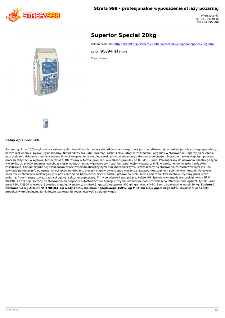 Strefa 998 - profesjonalne wyposażenie straży pożarnej Wietszyce 41 67-221 Białołęka tel: 723 895 900 Superior Special 20kg link do produktu: http://strefa998.pl/sorbenty-i-odtluszczacze/626-superior-special-20kg.html Cena: 95,94 zł brutto Stan: Nowy Pełny opis produktu Sorbent sypki, w 100% wykonany z naturalnych minerałów (nie zawiera dodatków chemicznych, nie jest modyfikowany), w postaci jasnobrązowego granulatu, o bardzo niskiej emisji pyłów. Ognioodporny. Nieszkodliwy dla ludzi, zwierząt i roślin. Lekki, łatwy w transporcie i wygodny w stosowaniu. Odporny na ścieranie przy poddaniu działaniu mechanicznemu. Po wchłonięciu płynu nie ulega rozkładowi. Wytwarzany z drobno zmielonego minerału o nazwie atapulgit, podczas procesu aktywacji w wysokiej temperaturze. Oferowany w formie granulatu o wielkości granulek od 0,6 do 1,3 mm. Przeznaczony do usuwania wszelkiego typu wycieków, od płynów przemysłowych, zawiesin wodnych, przez węglowodory (ropa, benzyna, oleje), rozpuszczalniki organiczne, do kwasów i związków zasadowych. Charakteryzuje się doskonałymi właściwościami absorpcyjnymi oraz mechanicznymi. Przeznaczony do stosowania zarówno wewnątrz jak i na zewnątrz pomieszczeń, do usuwania wycieków na drogach, placach manewrowych, spod maszyn, urządzeń, nieszczelnych pojemników i beczek. Po użyciu sorbentu i wchłonięciu rozlanego płynu powierzchnie są bezpieczne, czyste, suche i gotowe do ruchu ludzi i pojazdów. Powszechnie używany przez straż pożarną, firmy transportowe, przemysł ogólny, sektor energetyczny, firmy serwisowe i sprzątające, koleje, itd. Spełnia wymagania francuskiej normy NF P 98-190 i został dopuszczony do stosowania na drogach i autostradach we Francji. Otrzymał niemieckie dopuszczenie MPA (Material Prüfungsamt) typ IIIR oraz atest PZH, CNBOP w trakcie. Surowiec atapulgit wapienny, pH 9±0.5, gęstość nasypowa 500 g/l, granulacja 0.6-1.3 mm, opakowanie worek 20 kg. Zdolność wchłaniania wg AFNOR NF T 90-361 dla wody 150%, dla oleju napędowego 150%, wg MPA dla oleju opałowego 82%. Trwałość 5 lat od daty produkcji w oryginalnym, zamkniętym opakowaniu. Przechowywać z dala od wilgoci. 7-03-2017 1/1