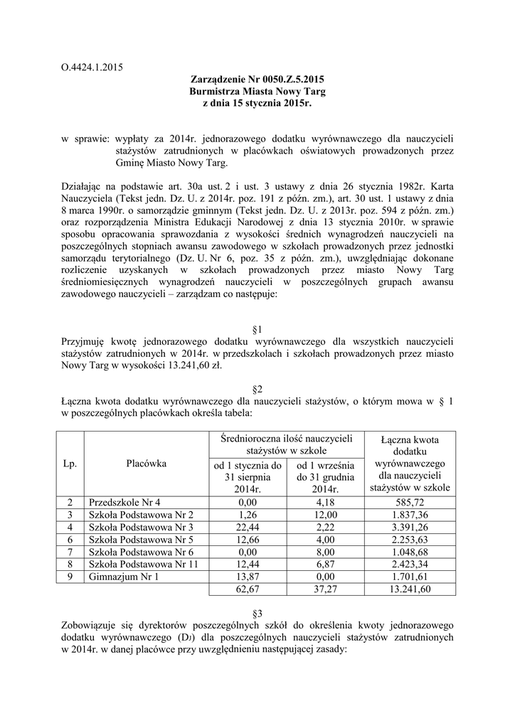 O.4424.1.2015 Zarządzenie Nr 0050.Z.5.2015 Burmistrza Miasta Nowy Targ z dnia 15 stycznia 2015r. w sprawie: wypłaty za 2014r. jednorazowego dodatku wyrównawczego dla nauczycieli stażystów zatrudnionych w placówkach oświatowych prowadzonych przez Gminę Miasto Nowy Targ. Działając na podstawie art. 30a ust. 2 i ust. 3 ustawy z dnia 26 stycznia 1982r. Karta Nauczyciela (Tekst jedn. Dz. U. z 2014r. poz. 191 z późn. zm.), art. 30 ust. 1 ustawy z dnia 8 marca 1990r. o samorządzie gminnym (Tekst jedn. Dz. U. z 2013r. poz. 594 z późn. zm.) oraz rozporządzenia Ministra Edukacji Narodowej z dnia 13 stycznia 2010r. w sprawie sposobu opracowania sprawozdania z wysokości średnich wynagrodzeń nauczycieli na poszczególnych stopniach awansu zawodowego w szkołach prowadzonych przez jednostki samorządu terytorialnego (Dz. U. Nr 6, poz. 35 z późn. zm.), uwzględniając dokonane rozliczenie uzyskanych w szkołach prowadzonych przez miasto Nowy Targ średniomiesięcznych wynagrodzeń nauczycieli w poszczególnych grupach awansu zawodowego nauczycieli – zarządzam co następuje: §1 Przyjmuję kwotę jednorazowego dodatku wyrównawczego dla wszystkich nauczycieli stażystów zatrudnionych w 2014r. w przedszkolach i szkołach prowadzonych przez miasto Nowy Targ w wysokości 13.241,60 zł. §2 Łączna kwota dodatku wyrównawczego dla nauczycieli stażystów, o którym mowa w § 1 w poszczególnych placówkach określa tabela: Lp. Placówka 2 3 4 6 7 8 9 Przedszkole Nr 4 Szkoła Podstawowa Nr 2 Szkoła Podstawowa Nr 3 Szkoła Podstawowa Nr 5 Szkoła Podstawowa Nr 6 Szkoła Podstawowa Nr 11 Gimnazjum Nr 1 Średnioroczna ilość nauczycieli stażystów w szkole od 1 stycznia do od 1 września 31 sierpnia do 31 grudnia 2014r. 2014r. 0,00 4,18 1,26 12,00 22,44 2,22 12,66 4,00 0,00 8,00 12,44 6,87 13,87 0,00 62,67 37,27 Łączna kwota dodatku wyrównawczego dla nauczycieli stażystów w szkole 585,72 1.837,36 3.391,26 2.253,63 1.048,68 2.423,34 1.701,61 13.241,60 §3 Zobowiązuje się dyrektorów poszczególnych szkół do określenia kwoty jednorazowego dodatku wyrównawczego (DJ) dla poszczególnych nauczycieli stażystów zatrudnionych w 2014r. w danej placówce przy uwzględnieniu następującej zasady: DJ = WS x SJ gdzie znaczenie poszczególnych symboli jest następujące: WS – iloraz różnicy, o której mowa w art. 30a ust. 2 ustawy Karta Nauczyciela, ustalona dla danego stopnia awansu zawodowego i sumy osobistych stawek wynagrodzenia zasadniczego nauczycieli na danym stopniu awansu zawodowego, ustalonych proporcjonalnie do okresu ich zatrudnienia – wskaźnik obliczany przez organ prowadzący. SJ – osobista stawka wynagrodzenia zasadniczego ustalona proporcjonalnie do okresu zatrudnienia danego nauczyciela. §4 Wskaźnik WS o którym mowa w § 3 zarządzenia dla nauczycieli stażystów zatrudnionych w nowotarskich placówkach oświatowych w 2014r. Wynosi – 0,738866. §5 Wypłata jednorazowego dodatku wyrównawczego dla nauczycieli stażystów winna nastąpić do dnia 31 stycznia 2015r. §6 Wykonanie zarządzania zleca się Dyrektorowi Przedszkola Nr 4 w Nowym Targu, Dyrektorowi Szkoły Podstawowej Nr 2 im. Mikołaja Kopernika w Nowym Targu, Dyrektorowi Szkoły Podstawowej Nr 3 im. Jana Pawła II w Nowym Targu, Dyrektorowi Szkoły Podstawowej Nr 5 im. Konfederacji Tatrzańskiej w Nowym Targu, Dyrektorowi Szkoły Podstawowej Nr 6 im. Józefa Rajskiego Burmistrza Nowego Targu w Nowym Targu, Dyrektorowi Szkoły Podstawowej Nr 11 im. Żołnierzy Armii Krajowej w Nowym Targu, Dyrektorowi Gimnazjum Nr 1 im. Tadeusza Kościuszki w Nowym Targu, Dyrektorowi Zespołu Obsługi Ekonomicznej Szkół i Przedszkoli w Nowym Targu, oraz Naczelnikowi Wydziału Oświaty Urzędu Miasta Nowy Targ. §7 Zarządzenie wchodzi w życie z dniem podjęcia.