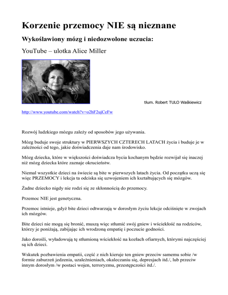 Korzenie przemocy NIE s nieznane Wyko lawiony mózg i niedozwolone uczucia: YouTube – ulotka Alice Miller tøum. Robert TULO Wa kiewicz http://www.youtube.com/watch?v=o2hF2ujCeFw Rozwój ludzkiego mózgu zale y od sposobów jego u ywania. Mózg buduje swoje struktury w PIERWSZYCH CZTERECH LATACH ycia i buduje je w zale no ci od tego, jakie do wiadczenia daje nam rodowisko. Mózg dziecka, które w wi kszo ci do wiadcza bycia kochanym b dzie rozwijaø si inaczej ni mózg dziecka które zaznaje okrucie stw. Niemal wszystkie dzieci na wiecie s bite w pierwszych latach ycia. Od pocz tku ucz si wi c PRZEMOCY i lekcja ta odciska si uzwojeniem ich ksztaøtuj cych si mózgów. adne dziecko nigdy nie rodzi si ze skøonno ci do przemocy. Przemoc NIE jest genetyczna. Przemoc istnieje, gdy bite dzieci odtwarzaj w dorosøym yciu lekcje odci ni te w zwojach ich mózgów. Bite dzieci nie mog si broni , musz wi c støumi swój gniew i w ciekøo którzy je poni aj , zabijaj c ich wrodzon empati i poczucie godno ci. Jako doro li, wyøadowuj t støumion w ciekøo s ich dzieci. na rodziców, na kozøach ofiarnych, którymi najcz ciej Wskutek pozbawienia empatii, cz z nich kieruje ten gniew przeciw samemu sobie /w formie zaburze jedzenia, uzale nieniach, okaleczaniu si , depresjach itd./, lub przeciw innym dorosøym /w postaci wojen, terroryzmu, przest pczo ci itd./. PYTANIA I ODPOWIEDZI Rodzice bij dzieci, aby staøy si posøuszne, bez zastanowienia, co robi . Nikt, poza bardzo nieliczn mniejszo ci , nie protestuje przeciw temu destrukcyjnemu zwyczajowi. Dlaczego na caøym wiecie owo logiczne nast pstwo – od bycia ogøupion ofiar do bycia ogøupionym oprawc – jest totalnie ignorowane? Dlaczego do dzi aden z papie y, odpowiedzialnych za krzewienie moralnych zachowa u milionów wiernych, nigdy nie poinformowaø ich, e bicie dzieci jest przest pstwem? Dzieje si tak DLATEGO, e niemal wszyscy byli my bici w dzieci stwie i od wczesnych lat musieli my wierzy , e te okrutne akty s czym normalnym - e s dla nas nieszkodliwe, a nawet po yteczne. Nikt nam nigdy nie powiedziaø, e to jest zbrodnia przeciw ludzko ci. Ta zøa, niemoralna i absurdalna lekcja, zostaøa wpisana w zwoje naszych mózgów i to wyja nia emocjonaln lepot , jaka rz dzi wiatem. Czy mo emy wyzwoli si z tej emocjonalnej lepoty, któr rozwijamy w dzieci stwie? Tak. Mo emy – przynajmniej w pewnym stopniu – wyzwoli si z tej emocjonalnej lepoty. Musimy tylko odwa y si poczu i uwolni støumione uczucia, ø cznie z l kiem i zabronion zøo ci do rodziców, którzy miertelnie nas przera ali, nieraz przez wszystkie lata, jakie powinny by najpi kniejszym okresem ycia. Mo emy odzyska te lata. Przyjmuj c prawd o doznanych krzywdach, mo emy, z yj cych w nas w strachu i zaprzeczaniu dzieci, przemieni si w odpowiedzialnych, wiadomych dorosøych, którzy odzyskali zdolno empatii, odebran im tak wcze nie. Staj c si lud mi czuj cymi, nie b dziemy døu ej zaprzecza , e bicie dzieci jest przest pstwem, które powinno by zabronione na caøym wiecie. WNIOSEK Troska o emocjonalne potrzeby naszych dzieci to co wi cej, ni danie im szcz liwego dzieci stwa. Oznacza takie ksztaøtowanie ich mózgów, e jako doro li b d funkcjonowa w zdrowy i racjonalny sposób, wolny od perwersji i szale stwa. Wpajana dzieciom lekcja, e bicie jest dla nich dobrodziejstwem, to najbardziej absurdalny, siej cy zam t przekaz – lekcja o skrajnie niebezpiecznych konsekwencjach. W poø czeniu z odci ciem od prawdziwych uczu , lekcja ta tworzy korzenie przemocy. http://www.youtube.com/watch?v=o2hF2ujCeFw http://www.youtube.com/watch?v=BtUAnvPudyw&playnext=1&list=PL0A58F640FAD5FFC4&feat ure=results_main DWADZIE CIA TRZY POSTULATY – Alice Miller tøum. Robert TULO Wa kiewicz 1. Dziecko jest zawsze niewinne; wszystkie teorie mówi ce cho troch inaczej, køami . 2. Ka de dziecko potrzebuje mi dzy innymi: opieki, ochrony, bezpiecze stwa, ciepøa, dotykania, troski, czuøo ci i delikatno ci. 3. Te potrzeby rzadko s speøniane w wystarczaj cym stopniu; dzieci s za to u ywane przez dorosøych do zaspokajania ich potrzeb i gromadz traum wykorzystania. 4. Nadu ycia doznane w dzieci stwie wywieraj negatywny wpøyw na caøe dalsze ycie Ofiar. 5. Spoøecze stwo stoi po stronie dorosøych, obwiniaj c dziecko za doznawane od nich krzywdy. 6. Wiktymizacja dzieci byøa negowana historycznie od zawsze – i wci stopniu jest. w wielkim 7. Zaprzeczanie to pozwala wiatu a do dzi ignorowa wykorzystywanie dzieci i jego skutki. 8. Zdradzone przez rodziców i spoøecze stwo dziecko mo e tylko zapomnie traum , støumi ból i idealizowa swoich oprawców. 9. Wyparcie to prowadzi do nerwic, psychoz, zaburze psychosomatycznych, uzale nie , autodestrukcji oraz przest pczo ci. 10. W nerwicy, dzieci ce potrzeby zostaj wyparte lub zaprzeczone; ich miejsce zajmuje l k, wstyd i poczucie winy. 11. W psychozach dawne nadu ycia przybieraj posta uroje uwa anych za zøudzenie (szale stwo lub obø d). 12. Zaburzenia psychosomatyczne pozwalaj zast pczo odczuwa dawny ból, ale jego przyczyny i pochodzenie zostaj ukryte. 13. Uzale nienia staj si namiastk dobrego rodzica, który zast pczo zaspokaja dzieci ce potrzeby. 14. Zachowania autodestrukcyjne s rekapitulacj dawnych traumatycznych prze y odgrywanych na wøasnej osobie. 15. W przest pczo ci, zam t, uwiedzenie, ból i nadu ycia z dzieci stwa s odgrywane na zewn trz. 16. Terapia mo e prowadzi pacjenta do sukcesów, je li opiera si na odkrywaniu prawdy o jego dzieci stwie, zamiast zaprzecza tej rzeczywisto ci. 17. Psychoanalityczna teoria „dzieci cej seksualno ci” chroni kazirodczych rodziców i wzmacnia spoøeczn lepot . 18. Fantazje, ukrywaj c lub minimalizuj c zbyt trudn prawd o dzieci stwie, pozwalaj dziecku przetrwa , gdy trauma zmy lona jest l ejsza od prawdziwej, któr wyparøo. 19. Fantazje zawarte w literaturze, malarstwie, filmach i snach, cz sto – nie wiadomie i w symboliczny sposób – ukazuj wczesne do wiadczenia dzieci stwa. 20. Te symboliczne wiadectwa s tolero