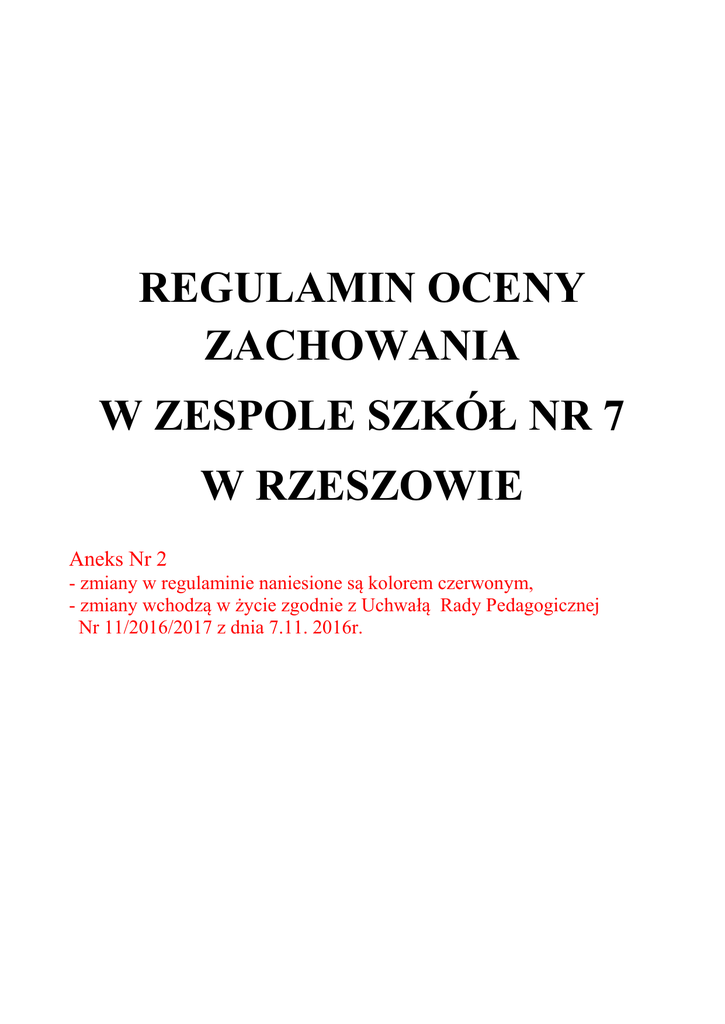 REGULAMIN OCENY ZACHOWANIA W ZESPOLE SZKÓŁ NR 7 W RZESZOWIE Aneks Nr 2 - zmiany w regulaminie naniesione są kolorem czerwonym, - zmiany wchodzą w życie zgodnie z Uchwałą Rady Pedagogicznej Nr 11/2016/2017 z dnia 7.11. 2016r. I Założenia szkolnego systemu oceniania zachowania. 1. Ocenianie zachowania ucznia polega na rozpoznawaniu przez wychowawcę klasy, nauczycieli oraz uczniów danej klasy stopnia respektowania przez ucznia zasad współżycia społecznego i norm etycznych oraz obowiązków ucznia. Obowiązki ucznia klas I – III szkoły podstawowej: a. Będę dbał o dobre imię swojej szkoły. b. Będę pilnie się uczyć. c. Będę odrabiać systematycznie zadania domowe. d. Będę prowadzić zeszyt przedmiotowy i zeszyt ćwiczeń. e. Będę aktywnie uczestniczyć w zajęciach. f. Będę grzecznie zachowywać się podczas zajęć: nie będę rozmawiać z innymi uczniami; gdy chcę zabrać głos zgłaszam się. g. Nigdy nie zapomnę słów: proszę, przepraszam, dziękuję, dzień dobry, do widzenia. h. Będę koleżeński i uprzejmy w stosunku do kolegów. i. Będę dbać o bezpieczeństwo własne i swoich kolegów. j. Będę dbać o higienę osobistą. k. Nie będę niszczyć sprzętów szkolnych. l. Nie będę spóźniać się na zajęcia szkolne. m. Będę stosować się do poleceń wszystkich pracowników szkoły. n. Nie będę jadł ani żuł gumy podczas zajęć. Obowiązki ucznia klas IV-VI szkoły podstawowej i gimnazjum: UCZEŃ POWINIEN: 2 a. Godnie reprezentować swoją szkołę w środowisku i poza nim, dbać o honor szkoły i jej dobre imię. b. Dążyć do zdobywania wiedzy i jej poszerzania. c. Przestrzegać zasad współżycia społecznego, okazywać szacunek nauczycielom, innym pracownikom szkoły, koleżankom i kolegom. d. Przeciwstawiać się przejawom brutalności, wulgarności i chuligaństwa. e. Szanować godność i wolność osobistą drugiego człowieka i jego przekonań. f. Dbać o bezpieczeństwo, higienę i zdrowie własne oraz kolegów i koleżanek. Uczeń nie może palić tytoniu, pić alkoholu, używać narkotyków i innych środków odurzających. g. Troszczyć się o mienie szkoły, ład i czystość. h. Obowiązkowo uczęszczać na wszystkie zajęcia edukacyjne. i. Regularnie i punktualnie uczęszczać na zajęcia. j. Systematycznie przygotowywać się do zajęć edukacyjnych. k. Regularnie i samodzielnie odrabiać zadania domowe. l. Kulturalnie zachowywać się podczas zajęć, czyli: spokojnie zająć wyznaczone miejsce w klasie; przygotować niezbędnie przybory, pomoce, podręczniki, zeszyty; zabierać głos po uprzednim zgłoszeniu się i za zgodą nauczyciela; nie rozmawiać z innymi uczniami; nie używać telefonu komórkowego. m. Prowadzić zeszyt przedmiotowy, zeszyt ćwiczeń. n. Pisać każdą pracę kontrolną. o. Samodzielnie i uczciwie rozwiązywać zadania na kartkówkach oraz sprawdzianach. p. Aktywnie uczestniczyć w zajęciach. q. Na miarę swoich możliwości wkładać wysiłek w wywiązywanie się z obowiązków na wychowaniu fizycznym, technice, plastyce, muzyce. r. Przestrzegać zarządzeń, postanowień oraz zaleceń dyrektora szkoły, rady pedagogicznej i rady uczniowskiej. s. Dbać o swój wygląd zewnętrzny. Wyglądać estetycznie, czysto, stosownie do swojego wieku i sytuacji, ponadto uczeń: nie farbuje włosów; nie stosuje przesadnego makijażu i nie maluje paznokci na mocne kolory. 3 2. Ocena zachowania ucznia ma charakter całościowy. W ocenianiu uwzględnia się pozytywne i negatywne aspekty funkcjonowania ucznia w Zespole Szkół Nr 7 i poza nim. System uwzględnia: funkcjonowanie ucznia w środowisku szkolnym i pozalekcyjnym, respektowanie zasad współżycia i ogólnie przyjętych norm etycznych, aktywizację społeczną. 3. Celem systemu jest takie oddziaływanie na ucznia, aby: miał świadomość popełnianych błędów i dążył do ich eliminowania poprzez ustawiczną pracę nad sobą i przezwyciężanie napotykanych trudności, potrafił krytycznie oceniać postępowanie własne oraz innych, mógł w pełni wykorzystywać i rozwijać swoje zdolności i umiejętności, 4. Nauczyciel stosuje ocenę wspierającą ucznia, docenia jego pozytywne zachowanie. 5. Uwzględnia w ocenie ogólnej nawet najmniejsze symptomy poprawy. 6. Przy ustaleniu klasyfikacyjnej oceny zachowania ucznia, u którego stwierdzono zaburzenia lub odchylenia rozwojowe, należy uwzględnić wpływ stwierdzonych zaburzeń lub odchyleń rozwojowych na jego zachowanie, na podstawie orzeczenia o potrzebie kształcenia specjalnego lub indywidualnego nauczania lub opinii poradni psychologiczno- pedagogicznej, w tym poradni specjalistycznej. II Ogólne zasady oceniania zachowania w ZS Nr 7 1. Na początku roku szkolnego wychowawca zobowiązany jest do poinformowania uczniów, rodziców (prawnych opiekunów) o zasadach oceniania zachowania. 2. W trakcie roku szkolnego nauczyciele wpisują uczniom uwagi pozytywne i negatywne w zakresie poszczególnych kategorii w e-dzienniku (w zakładce dziennik – widok dziennika – Uwagi – notatki o uczniach) i przyznają odpowiednią ilość punktów (nie dotyczy klas I – III SP). 3. O wpisach na bieżąco informowani są rodzice ucznia (poprzez e-dziennik). 4. Uczniowie mają wgląd do swoich uwag również poprzez e-dziennik. Są także na bieżąco informowani o otrzymaniu uwagi. 5. Śródroczna i roczna klasyfikacyjna ocena zachowania uwzględnia w szczególności: Wywiązywanie się z obowiązków ucznia. Postępowanie zgodne z dobrem społeczności szkolnej. 4 Godne, kulturalne zachowanie się w szkole i poza nią. Dbałość o honor i tradycje szkoły. Dbałość o piękno mowy ojczystej. Dbałość o bezpieczeństwo i zdrowie własne oraz innych osób. Okazywanie szacunku innym osobom. 5 III Tryb odwoławczy. 1. Uczeń lub jego rodzice (prawni opiekunowie) mogą zgłosić zastrzeżenia do dyrektora szkoły, jeśli uznają, że roczna ocena klasyfikacyjna zachowania została ustalona niezg