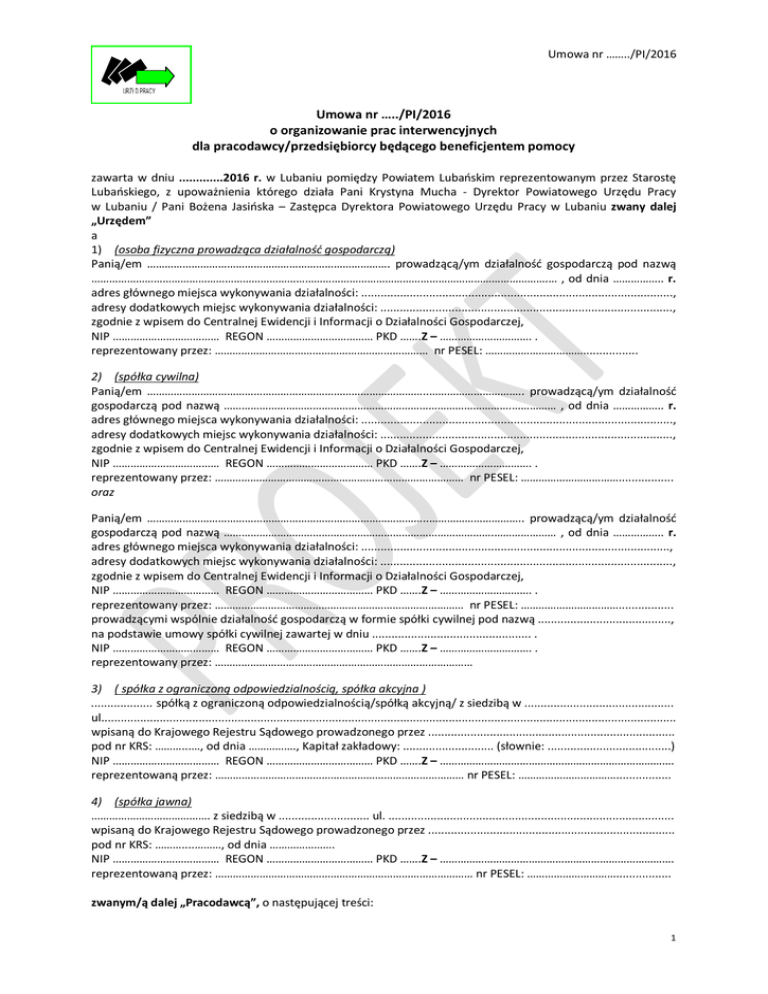 Umowa nr ……../PI/2016 URZĄD PRACY Umowa nr …../PI/2016 o organizowanie prac interwencyjnych dla pracodawcy/przedsiębiorcy będącego beneficjentem pomocy zawarta w dniu .............2016 r. w Lubaniu pomiędzy Powiatem Lubańskim reprezentowanym przez Starostę Lubańskiego, z upoważnienia którego działa Pani Krystyna Mucha - Dyrektor Powiatowego Urzędu Pracy w Lubaniu / Pani Bożena Jasińska – Zastępca Dyrektora Powiatowego Urzędu Pracy w Lubaniu zwany dalej „Urzędem” a 1) (osoba fizyczna prowadząca działalność gospodarczą) Panią/em ………………………………………………………………………. prowadzącą/ym działalność gospodarczą pod nazwą ……………………………………………………………………………………………………………………………………….… , od dnia …………….. r. adres głównego miejsca wykonywania działalności: ................................................................................................, adresy dodatkowych miejsc wykonywania działalności: .........................................................................................., zgodnie z wpisem do Centralnej Ewidencji i Informacji o Działalności Gospodarczej, NIP ……………………………… REGON ……………………………… PKD …….Z – …………………………. . reprezentowany przez: ……………………………………………………………… nr PESEL: ……………………………................. 2) (spółka cywilna) Panią/em …………………………………………………………………………………..………………………….. prowadzącą/ym działalność gospodarczą pod nazwą …………………………………………………………………………………….…………… , od dnia …………….. r. adres głównego miejsca wykonywania działalności: ................................................................................................, adresy dodatkowych miejsc wykonywania działalności: .........................................................................................., zgodnie z wpisem do Centralnej Ewidencji i Informacji o Działalności Gospodarczej, NIP ……………………………… REGON ……………………………… PKD …….Z – …………………………. . reprezentowany przez: ………………………………………………………………………… nr PESEL: ……………………………................. oraz Panią/em …………………………………………………………………………………..………………………….. prowadzącą/ym działalność gospodarczą pod nazwą ……………………………………………………………………………….………………… , od dnia …………….. r. adres głównego miejsca wykonywania działalności: ..............................................................................................., adresy dodatkowych miejsc wykonywania działalności: .........................................................................................., zgodnie z wpisem do Centralnej Ewidencji i Informacji o Działalności Gospodarczej, NIP ……………………………… REGON ……………………………… PKD …….Z – …………………………. . reprezentowany przez: ………………………………………………………………………… nr PESEL: ……………………………................. prowadzącymi wspólnie działalność gospodarczą w formie spółki cywilnej pod nazwą ........................................., na podstawie umowy spółki cywilnej zawartej w dniu ................................................. . NIP ……………………………… REGON ……………………………… PKD …….Z – …………………………. . reprezentowany przez: …………………………………………………………………………… 3) ( spółka z ograniczoną odpowiedzialnością, spółka akcyjna ) ................... spółką z ograniczoną odpowiedzialnością/spółką akcyjną/ z siedzibą w .............................................. ul................................................................................................................................................................................. wpisaną do Krajowego Rejestru Sądowego prowadzonego przez ............................................................................ pod nr KRS: ………...…, od dnia ……………., Kapitał zakładowy: ............................ (słownie: ......................................) NIP ……………………………… REGON ……………………………… PKD …….Z – ……………………………………………………………………. reprezentowaną przez: ………………………………………………………………………… nr PESEL: ……………………………................. 4) (spółka jawna) …………………………………. z siedzibą w ............................ ul. ........................................................................................ wpisaną do Krajowego Rejestru Sądowego prowadzonego przez ............................................................................ pod nr KRS: ………....………, od dnia …………………. NIP ……………………………… REGON ……………………………… PKD …….Z – ……………………………………………………………………. reprezentowaną przez: …………………………………………………………………………… nr PESEL: …………………………................. zwanym/ą dalej „Pracodawcą”, o następującej treści: 1 Umowa nr ……../PI/2016