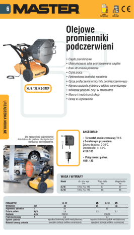 6 OLEJ NAPĘDOWY OLEJ OPAŁOWY Olejowe promienniki podczerwieni • Ciepło promieniowe • Ukierunkowane silne promieniowanie cieplne • Brak strumienia powietrza • Cicha praca • Elektroniczna kontrolka płomienia • Opcja podłączenia termostatu pomieszczeniowego • Komora spalania zrobiona z włókna ceramicznego • Wskaźnik poziomu oleju w standardzie • Mocna i trwała konstrukcja • Łatwy w użytkowaniu XL 9 / XL 9 2-STEP URZĄDZENIA MOBILNE AKCESORIA: Dla zapewnienia odpowiedniej ilości tlenu do spalania niezbędna jest wentylacja pomieszczenia. • Termostat pomieszczeniowy TH 5 z 3-metrowym przewodem. Zakres działania: 0-36°C. Dokładność: ± 1,5°C. 4150.105 • Podgrzewacz paliwa. 4031.120 WAGA I WYMIARY PARAMETRY Wydajność Pojemność zbiornika Zużycie paliwa Zasilanie Prąd znamionowy System spalania Materiał komory spalania kW l kg/h V/Hz A Model dł x sz x wys Waga netto Waga brutto (cm) (kg) (kg) XL 9E XL 9S 120 x 75 x 115 120 x 75 x 115 67 66 87 85 XL 9E 43 60 3,6 230/50 0,6 wysokociśnieniowy palnik wentylatorowy specjalna izolacja (włókno ceramiczne) I XL 9S 29 II 43 60 2,3 3,1 230/50 0,7 wysokociśnieniowy palnik wentylatorowy specjalna izolacja (włókno ceramiczne)