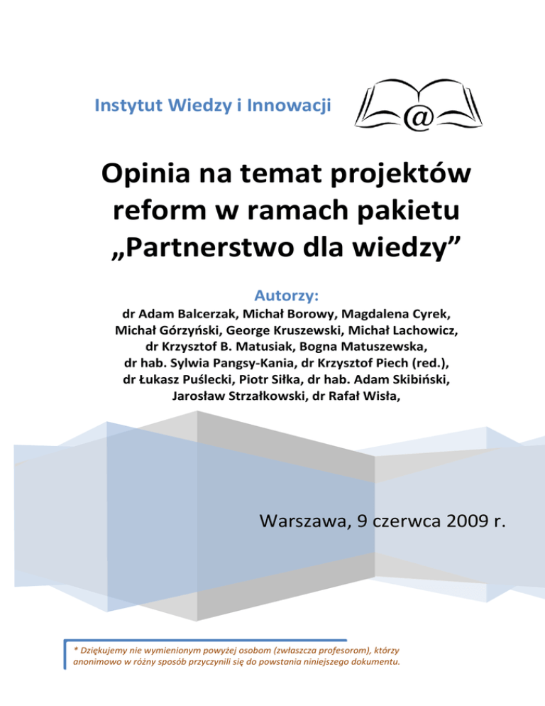 Instytut Wiedzy i Innowacji Opinia na temat projektów reform w ramach pakietu „Partnerstwo dla wiedzy” Autorzy: dr Adam Balcerzak, Michał Borowy, Magdalena Cyrek, Michał Górzyoski, George Kruszewski, Michał Lachowicz, dr Krzysztof B. Matusiak, Bogna Matuszewska, dr hab. Sylwia Pangsy-Kania, dr Krzysztof Piech (red.), dr Łukasz Puślecki, Piotr Siłka, dr hab. Adam Skibioski, Jarosław Strzałkowski, dr Rafał Wisła, dr Bartosz Witkowski, dr Gabriela Wronowska * Warszawa, 9 czerwca 2009 r. * Dziękujemy nie wymienionym powyżej osobom (zwłaszcza profesorom), którzy anonimowo w różny sposób przyczynili się do powstania niniejszego dokumentu. Opinia na temat projektów reform w ramach pakietu „Partnerstwo dla wiedzy” Wprowadzenie W 2005 r. dokonana została – w koocówce kadencji prezydenta A. Kwaśniewskiego – nowelizacja „Ustawy o szkolnictwie wyższym”. Chod dostosowała szkolnictwo wyższe do wymogów Deklaracji Bolooskiej, uregulowała relacje między uczelniami prywatnymi a publicznymi, zwiększyła rolę studentów, to – będąc popularnie nazywaną ustawą „profesorską” – konserwowała dotychczasowy system, nie odpowiadała na długookresowe wyzwania rozwojowe kraju, nie uwzględniała relacji między nauką a gospodarką (co jest oczywiste w obliczu potrzeby zbudowania narodowego systemu innowacji w Polsce). Już wtedy występowała potrzeba przygotowao do kolejnej modyfikacji systemu.1 W przedstawionych wiosną 2009 r. założeniach do reformy systemu nauki i uczelni wyższych jest wiele mechanizmów właściwie korygujących obecny system. Ogólna idea reform jest generalnie warta poparcia, jednakże co do pewnych, szczegółowych kwestii można mied wątpliwości. Proponowane reformy mają nadal charakter zbyt kosmetyczny, zbyt konserwatywny, zbyt ostrożny. Nie zwrócono zbyt dużej uwagi na potrzeby całej gospodarki i na długookresowe wyzwania rozwojowe. Przed dokonaniem głębszych zmian sugerowalibyśmy dokonanie analizy przyczyn i czynników konkurencyjności uczelni amerykaoskich (np. Stanfordu) i brytyjskich, biorąc pod uwagę, że niektórych ścieżek rozwoju (np. Oxfordu) nie da się polskim uczelniom powtórzyd. Należy umiejscowid reformę w szerszym kontekście zmian dokonujących się na uczelniach na świecie, związanych np. z otwierającym się rynkiem studentów z Chin. Wnioski należy przedyskutowad z różnymi środowiskami. Ponadto wprowadzanie reform należałoby poprzedzid stworzeniem strategii rozwoju szkolnictwa wyższego.2 Całośd reformy powinna byd opatrzona hasłem „co nie jest zabronione, to jest dozwolone”. Brakuje dotąd systemu motywacyjnego skłaniającego uczelnie do postępu, do zmian. Wciąż obecny jest strach przed współpracą z biznesem, brak klimatu przedsiębiorczości, przyzwolenia na zmiany. Jest to ważna rola do odegrania w systemach innowacji przez każde ministerstwo nauki. Wiodące współczesne uczelnie wyższe nie opierają się na XIX-wiecznej Humboldtowskiej idei jedności badao i nauczania. Do tego dodają (nawet ok. 850-letni Oxford) „trzecią nogę” – praktykę, biznes (rola uniwersytetu jako inkubatora przedsiębiorczości i innowacji).3 Uważamy, że uczelnie wyższe są normalnym elementem gospodarki kraju i ich rola sprowadzad się powinna do stymulowania jej rozwoju. Stąd przygotowując tak całościową reformę, jak przewiduje to Ministerstwo Nauki i Szkolnictwa Wyższego, należy na sektor uczelni spojrzed jak na kompleks: dostrzec rolę szkół średnich, otoczenia gospodarczego, rozwoju technologicznego (i ochrony własności intelektualnej). Sektor uczelni wyższych i jego otoczenie krajowa nauka i dydaktyka szkoły średnie szkoły wyższe – nauka naukowcy, technologie szkoły wyższe – dydaktyka studenci, biznes ROZWÓJ konkurencja międzynarodowa światowa nauka i dydaktyka potrzeby gospodarki 1 K. Piech, Nowa Ustawa o szkolnictwie wyższym a Proces Bolooski oraz konkurencyjnośd i rozwój polskiej gospodarki, [w:] M. Rocki (red.), Nowe prawo – szanse i zagrożenia dla szkolnictwa wyższego, FPAKE, Warszawa listopad 2005, s. 58-74 (też: http://www.fundacja.edu.pl/pliki/pdf/nowe_prawo.pdf). 2 Ibidem. 3 PARTNERSTWO DLA WIEDZY. Uwagi Stowarzyszenia Organizatorów Ośrodków Innowacji i Przedsiębiorczości w Polsce, Łódź/Poznao, dn. 7 maja 2009 r. 2 Opinia na temat projektów reform w ramach pakietu „Partnerstwo dla wiedzy” Szkoły średnie Popieramy zmiany związane z wprowadzeniem obowiązkowej matury z matematyki przy jednoczesnym jej upraktycznieniu, eliminując treści, które nie są w przeważającej mierze stosowane w codziennym życiu (służące jedynie przygotowaniu do studiów), wprowadzając te, które są wykorzystywane (podstawy finansów, porównywanie lokat i kredytów bankowych itp.). Dla zwiększenia porównywalności wyników między poszczególnymi przedmiotami maturalnymi popieramy rozwiązanie proponowane przez senatora prof. Marka Rockiego dotyczące przejścia z tradycyjnych ocen do wyrażenia, w jakim procencie najlepszych wyników z danego egzaminu uplasował się maturzysta.4 Wstępem do reformy szkolnictwa wyższego jest dokooczenie reform nauczania na poziomie średnim. Zwracamy tu uwagę na słabą jakośd podręczników i przygotowania nauczycieli przedmiotu „przedsiębiorczośd”. W przeważającej mierze w ramach tego przedmiotu nie uczy się przedsiębiorczości, a podstaw makro- i mikroekonomii czy ekonomiki małego przedsiębiorstwa. Jest to później barierą już dla studentów utrudniającą im zakładanie własnych firm poprzez wzbudzanie przekonania, że jest to bardzo trudne, wymaga znajomości praw makroekonomii itp. W ten sposób fałszuje się uczniowi pojęcie i potrzeby przedsiębiorczości… Dydaktyka i studenci Eksport usług edukacyjnych Polskie szkolnictwo wyższe w okresie transformacji nie potrafiło wykształcid możliwości płynących ze sprzedaży swoich usług edukacyjnych za granic