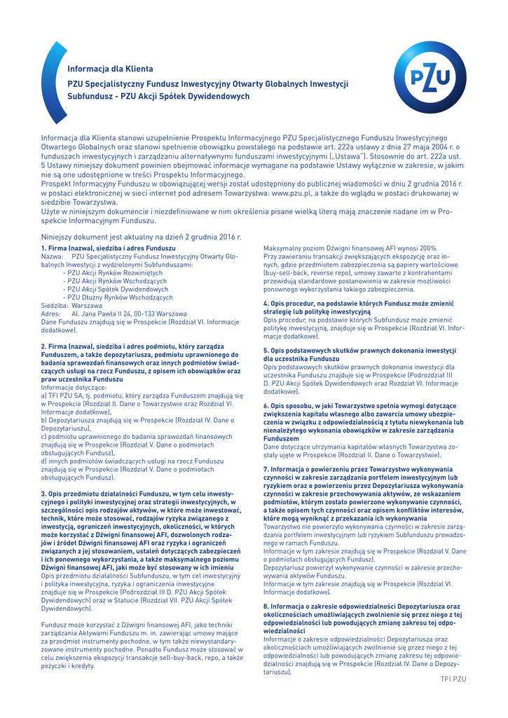 Informacja dla Klienta PZU Specjalistyczny Fundusz Inwestycyjny Otwarty Globalnych Inwestycji Subfundusz - PZU Akcji Spółek Dywidendowych Informacja dla Klienta stanowi uzupełnienie Prospektu Informacyjnego PZU Specjalistycznego Funduszu Inwestycyjnego Otwartego Globalnych oraz stanowi spełnienie obowiązku powstałego na podstawie art. 222a ustawy z dnia 27 maja 2004 r. o funduszach inwestycyjnych i zarządzaniu alternatywnymi funduszami inwestycyjnymi („Ustawa”). Stosownie do art. 222a ust. 5 Ustawy niniejszy dokument powinien obejmować informacje wymagane na podstawie Ustawy wyłącznie w zakresie, w jakim nie są one udostępnione w treści Prospektu Informacyjnego. Prospekt Informacyjny Funduszu w obowiązującej wersji został udostępniony do publicznej wiadomości w dniu 2 grudnia 2016 r. w postaci elektronicznej w sieci internet pod adresem Towarzystwa: www.pzu.pl, a także do wglądu w postaci drukowanej w siedzibie Towarzystwa. Użyte w niniejszym dokumencie i niezdefiniowane w nim określenia pisane wielką literą mają znaczenie nadane im w Prospekcie Informacyjnym Funduszu. Niniejszy dokument jest aktualny na dzień 2 grudnia 2016 r. 1. Firma (nazwa), siedziba i adres Funduszu Nazwa: PZU Specjalistyczny Fundusz Inwestycyjny Otwarty Globalnych Inwestycji z wydzielonymi Subfunduszami: - PZU Akcji Rynków Rozwiniętych - PZU Akcji Rynków Wschodzących - PZU Akcji Spółek Dywidendowych - PZU Dłużny Rynków Wschodzących Siedziba:Warszawa Adres: Al. Jana Pawła II 24, 00-133 Warszawa Dane Funduszu znajdują się w Prospekcie (Rozdział VI. Informacje dodatkowe). 2. Firma (nazwa), siedziba i adres podmiotu, który zarządza Funduszem, a także depozytariusza, podmiotu uprawnionego do badania sprawozdań finansowych oraz innych podmiotów świadczących usługi na rzecz Funduszu, z opisem ich obowiązków oraz praw uczestnika Funduszu Informacje dotyczące: a) TFI PZU SA, tj. podmiotu, który zarządza Funduszem znajdują się w Prospekcie (Rozdział II. Dane o Towarzystwie oraz Rozdział VI. Informacje dodatkowe), b) Depozytariusza znajdują się w Prospekcie (Rozdział IV. Dane o Depozytariuszu), c) podmiotu uprawnionego do badania sprawozdań finansowych znajdują się w Prospekcie (Rozdział V. Dane o podmiotach obsługujących Fundusz), d) innych podmiotów świadczących usługi na rzecz Funduszu znajdują się w Prospekcie (Rozdział V. Dane o podmiotach obsługujących Fundusz). 3. Opis przedmiotu działalności Funduszu, w tym celu inwestycyjnego i polityki inwestycyjnej oraz strategii inwestycyjnych, w szczególności opis rodzajów aktywów, w które może inwestować, technik, które może stosować, rodzajów ryzyka związanego z inwestycją, ograniczeń inwestycyjnych, okoliczności, w których może korzystać z Dźwigni finansowej AFI, dozwolonych rodzajów i źródeł Dźwigni finansowej AFI oraz ryzyka i ograniczeń związanych z jej stosowaniem, ustaleń dotyczących zabezpieczeń i ich ponownego wykorzystania, a także maksymalnego poziomu Dźwigni finansowej AFI, jaki może być stosowany w ich imieniu Opis przedmiotu działalności Subfunduszu, w tym cel inwestycyjny i polityka inwestycyjna, ryzyka i ograniczenia inwestycyjne znajduje się w Prospekcie (Podrozdział III D. PZU Akcji Spółek Dywidendowych) oraz w Statucie (Rozdział VII. PZU Akcji Spółek Dywidendowych). Fundusz może korzystać z Dźwigni finansowej AFI, jako techniki zarządzania Aktywami Funduszu m. in. zawierając umowy mające za przedmiot instrumenty pochodne, w tym także niewystandaryzowane instrumenty pochodne. Ponadto Fundusz może stosować w celu zwiększenia ekspozycji transakcje sell-buy-back, repo, a także pożyczki i kredyty. Maksymalny poziom Dźwigni finansowej AFI wynosi 200%. Przy zawieraniu transakcji zwiększających ekspozycję oraz innych, gdzie przedmiotem zabezpieczenia są papiery wartościowe (buy-sell-back, reverse repo), umowy zawarte z kontrahentami przewidują standardowe postanowienia w zakresie możliwości ponownego wykorzystania takiego zabezpieczenia. 4. Opis procedur, na podstawie których Fundusz może zmienić strategię lub politykę inwestycyjną Opis procedur, na podstawie których Subfundusz może zmienić politykę inwestycyjną, znajduje się w Prospekcie (Rozdział VI. Informacje dodatkowe). 5. Opis podstawowych skutków prawnych dokonania inwestycji dla uczestnika Funduszu Opis podstawowych skutków prawnych dokonania inwestycji dla uczestnika Funduszu znajduje się w Prospekcie (Podrozdział III D. PZU Akcji Spółek Dywidendowych oraz Rozdział VI. Informacje dodatkowe). 6. Opis sposobu, w jaki Towarzystwo spełnia wymogi dotyczące zwiększenia kapitału własnego albo zawarcia umowy ubezpieczenia w związku z odpowiedzialnością z tytułu niewykonania lub nienależytego wykonania obowiązków w zakresie zarządzania Funduszem Dane dotyczące utrzymania kapitałów własnych Towarzystwa zostały ujęte w Prospekcie (Rozdział II. Dane o Towarzystwie). 7. Informacja o powierzeniu przez Towarzystwo wykonywania czynności w zakresie zarządzania portfelem inwestycyjnym lub ryzykiem oraz o powierzeniu przez Depozytariusza wykonywania czynności w zakresie przechowywania aktywów, ze wskazaniem podmiotów, którym zostało powierzone wykonywanie czynności, a także opisem tych czynności oraz opisem konfliktów interesów, które mogą wyniknąć z przekazania ich wykonywania Towarzystwo nie powierzyło wykonywania czynności w zakresie zarządzania portfelem inwestycyjnym lub ryzykiem Subfunduszu prowadzonego w ramach Funduszu. Informacje w tym zakresie znajdują się w Prospekcie (Rozdział V. Dane o podmiotach obsługujących Fundusz). Depozytariusz powierzył wykonywanie czynności w zakresie przechowywania aktywów Funduszu. Informacje w tym zakresie znajdują się w Prospekcie (Rozdział VI. Informacje dodatkowe). 8. Informacja o zakresie odpowiedzialności Depozytariusza oraz okolicznościach umożliwiających zwolnienie s