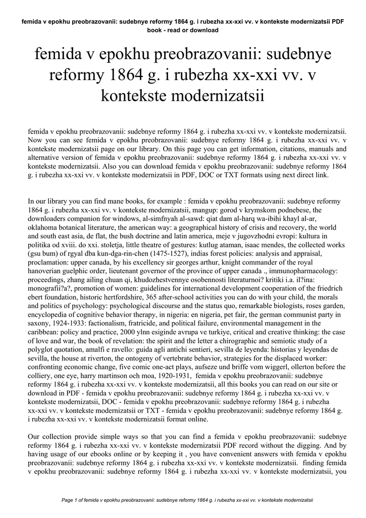 femida v epokhu preobrazovanii: sudebnye reformy 1864 g. i rubezha xx-xxi vv. v kontekste modernizatsii PDF book - read or download femida v epokhu preobrazovanii: sudebnye reformy 1864 g. i rubezha xx-xxi vv. v kontekste modernizatsii femida v epokhu preobrazovanii: sudebnye reformy 1864 g. i rubezha xx-xxi vv. v kontekste modernizatsii. Now you can see femida v epokhu preobrazovanii: sudebnye reformy 1864 g. i rubezha xx-xxi vv. v kontekste modernizatsii page on our library. On this page you can get information, citations, manuals and alternative version of femida v epokhu preobrazovanii: sudebnye reformy 1864 g. i rubezha xx-xxi vv. v kontekste modernizatsii. Also you can download femida v epokhu preobrazovanii: sudebnye reformy 1864 g. i rubezha xx-xxi vv. v kontekste modernizatsii in PDF, DOC or TXT formats using next direct link. In our library you can find mane books, for example : femida v epokhu preobrazovanii: sudebnye reformy 1864 g. i rubezha xx-xxi vv. v kontekste modernizatsii, mangup: gorod v krymskom podnebese, the downloaders companion for windows, al-simfnyah al-sawd: qiat dam al-harq wa-ibihi khayl al-ar, oklahoma botanical literature, the american way: a geographical history of crisis and recovery, the world and south east asia, de flat, the bush doctrine and latin america, meje v jugovzhodni evropi: kultura in politika od xviii. do xxi. stoletja, little theatre of gestures: kutlug ataman, isaac mendes, the collected works (gsu bum) of rgyal dba kun-dga-rin-chen (1475-1527), indias forest policies: analysis and appraisal, proclamation: upper canada, by his excellency sir georges arthur, knight commander of the royal hanoverian guelphic order, lieutenant governor of the province of upper canada ., immunopharmacology: proceedings, zhang ailing chuan qi, khudozhestvennye osobennosti literaturnoi? kritiki i.a. il?ina: monografii?a?, promotion of women: guidelines for international development cooperation of the friedrich ebert foundation, historic hertfordshire, 365 after-school activities you can do with your child, the morals and politics of psychology: psychological discourse and the status quo, remarkable biologists, roses garden, encyclopedia of cognitive behavior therapy, in nigeria: en nigeria, pet fair, the german communist party in saxony, 1924-1933: factionalism, fratricide, and political failure, environmental management in the caribbean: policy and practice, 2000 ylnn esiginde avrupa ve turkiye, critical and creative thinking: the case of love and war, the book of revelation: the spirit and the letter a chirographic and semiotic study of a polyglot quotation, amalfi e ravello: guida agli antichi sentieri, sevilla de leyenda: historias y leyendas de sevilla, the house at riverton, the ontogeny of vertebrate behavior, strategies for the displaced worker: confronting economic change, five comic one-act plays, aufseze und briffe vom wiggerl, ollerton before the colliery, one eye, harry martinson och moa, 1920-1931, femida v epokhu preobrazovanii: sudebnye reformy 1864 g. i rubezha xx-xxi vv. v kontekste modernizatsii, all this books you can read on our site or download in PDF - femida v epokhu preobrazovanii: sudebnye reformy 1864 g. i rubezha xx-xxi vv. v kontekste modernizatsii, DOC - femida v epokhu preobrazovanii: sudebnye reformy 1864 g. i rubezha xx-xxi vv. v kontekste modernizatsii or TXT - femida v epokhu preobrazovanii: sudebnye reformy 1864 g. i rubezha xx-xxi vv. v kontekste modernizatsii format online. Our collection provide simple ways so that you can find a femida v epokhu preobrazovanii: sudebnye reformy 1864 g. i rubezha xx-xxi vv. v kontekste modernizatsii PDF record without the digging. And by having usage of our ebooks online or by keeping it , you have convenient answers with femida v epokhu preobrazovanii: sudebnye reformy 1864 g. i rubezha xx-xxi vv. v kontekste modernizatsii. finding femida v epokhu preobrazovanii: sudebnye reformy 1864 g. i rubezha xx-xxi vv. v kontekste modernizatsii, you Page 1 of femida v epokhu preobrazovanii: sudebnye reformy 1864 g. i rubezha xx-xxi vv. v kontekste modernizatsii femida v epokhu preobrazovanii: sudebnye reformy 1864 g. i rubezha xx-xxi vv. v kontekste modernizatsii PDF book - read or download are find our website comprehensive assortment of femida v epokhu preobrazovanii: sudebnye reformy 1864 g. i rubezha xx-xxi vv. v kontekste modernizatsii manuals listed. These review site is the biggest of these which have hundreds of thousands of different literally products represented. So as to there are specific sites catered to different product also types or categories, brands or niche categories related with femida v epokhu preobrazovanii: sudebnye reformy 1864 g. i rubezha xx-xxi vv. v kontekste modernizatsii. So depending on what exactly you are searching, you'll be able to choose ebooks femida v epokhu preobrazovanii: sudebnye reformy 1864 g. i rubezha xx-xxi vv. v kontekste modernizatsii to fit your own needs, femida v epokhu preobrazovanii: sudebnye reformy 1864 g. i rubezha xx-xxi vv. v kontekste modernizatsii. Page 2 of femida v epokhu preobrazovanii: sudebnye reformy 1864 g. i rubezha xx-xxi vv. v kontekste modernizatsii