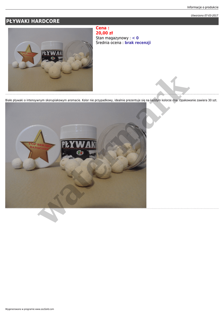 Informacje o produkcie Utworzono 07-03-2017 PŁYWAKI HARDCORE Cena : 20,00 zł er m ar k Stan magazynowy : < 0 Średnia ocena : brak recenzji w at Białe pływaki o intensywnym skorupiakowym aromacie. Kolor nie przypadkowy, idealnie prezentuje się na każdym kolorze dna. Opakowanie zawiera 30 szt. Wygenerowano w programie www.oscGold.com