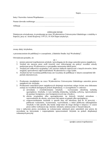 Sopot, .............................. Imię i Nazwisko Autora/Współautora ........................................................... Numer dowodu osobistego ............................................................................ Afiliacja ……………………………….......................................................... OŚWIADCZENIE Niniejszym oświadczam, że przekazuję na rzecz Wydawnictwa Uniwersytetu Gdańskiego z siedzibą w Sopocie, przy ul. Armii Krajowej 119/121, 81-824 Sopot artykuł pt.: ………….................................................................................................................................................... .................................................................................................................................................................... zwany dalej Artykułem, z przeznaczeniem do publikacji w czasopiśmie „Gdańskie Studia Azji Wschodniej”. Oświadczam ponadto, że: &1 1. jestem autorem/współautorem artykułu i przysługują mi do niego autorskie prawa majątkowe; 2. Artykuł nie narusza praw osób trzecich oraz zobowiązuję się pokryć wszelkie szkody poniesione przez Wydawnictwo w przypadku naruszenia takich praw. 3. Artykuł jest całkowicie oryginalny i nie zawiera żadnych zapożyczeń z innych utworów, które mogłyby spowodować odpowiedzialność Wydawnictwa z tego tytułu. 4. Artykuł nie był wcześniej publikowany ani wysyłany do publikacji w innym czasopiśmie lub portalu internetowym. &2 1. Przekazuję nieodpłatnie na rzecz Wydawnictwa Uniwersytetu Gdańskiego autorskie prawa majątkowe do Artykułu; 2. Przekazanie autorskich praw majątkowych obejmuje terytorium całego świata oraz dokonane zostaje na wszelkich dostępnych polach eksploatacji, w szczególności w zakresie: a) utrwalania i zwielokrotniania Artykułu – wytwarzanie określoną techniką egzemplarzy Artykułu, w tym techniką drukarską, techniką cyfrową, wprowadzenie do pamięci komputera, sieci komputerowych (np e-booki,); b) obrotu oryginałem albo egzemplarzami, na których Artykuł utrwalono – wprowadzanie do obrotu, użyczenie lub najem oryginału albo egzemplarzy; c) rozpowszechniania Artykułu w sposób inny niż określony pod lit. b) powyżej – publiczne wykonanie, wystawienie, wyświetlenie, a także publiczne udostępnianie Artykułu w taki sposób, aby każdy mógł mieć do niego dostęp w miejscu i w czasie przez siebie wybranym (np. internet, intranet), umieszczenie w bazach danych, wraz z nabyciem prawa zezwalania na wykonywanie zależnych praw autorskich oraz prawa do zezwalania na korzystanie i rozporządzanie opracowaniami Artykułu na polach eksploatacji wskazanych powyżej. ................................................................. (podpis autora/współautora)