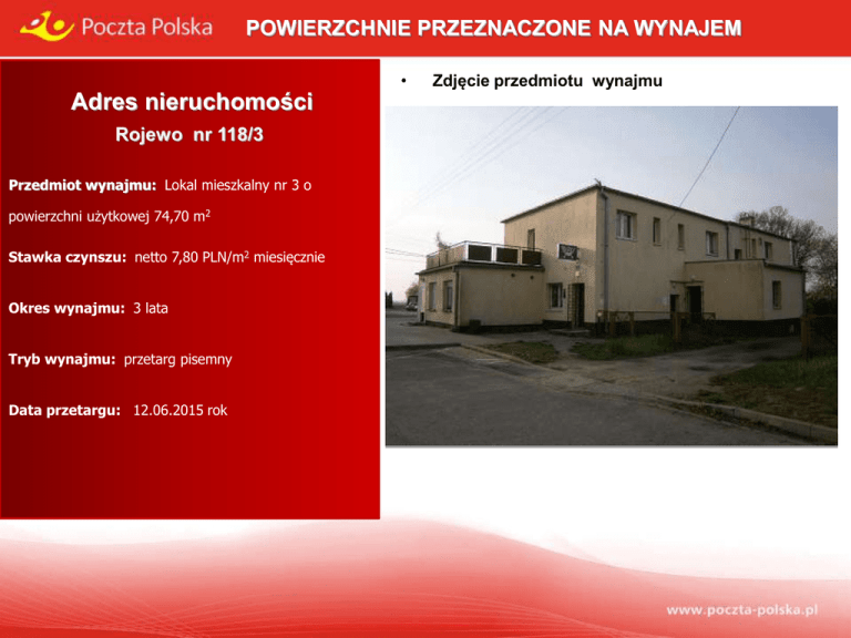 POWIERZCHNIE PRZEZNACZONE NA WYNAJEM - Adres nieruchomości Rojewo nr 118/3 Przedmiot wynajmu: Lokal mieszkalny nr 3 o powierzchni użytkowej 74,70 m2 Stawka czynszu: netto 7,80 PLN/m2 miesięcznie Okres wynajmu: 3 lata Tryb wynajmu: przetarg pisemny Data przetargu: 12.06.2015 rok • Zdjęcie przedmiotu wynajmu Kliknij i zlokalizuj na mapie Opis przedmiotu wynajmu: • Pokoje • Kuchnia i toaleta Lokal mieszkalny usytuowany jest na I piętrze budynku mieszkalnego stanowiącego własność Poczty Polskiej S.A. Składa się z 4 izb o łącznej powierzchni użytkowej 74,70 m², w tym powierzchni pokoi 52,20 m² (1 pokój 23,30 m², 2 pokój 9,60 m², 3 pokój 19,30 m²), kuchni 12,50 m², łazienki z wc 3,80 m², przedpokój 6,20 m². Lokal wyposażony jest w instalacje: elektryczną, wodnokanalizacyjną i c.o. System centralnego ogrzewania – wspólna kotłownia węglowa. W pomieszczeniach lokalu zamontowane są grzejniki żeliwne żeberkowe. Stolarka okienna PCV, oszklenie pełne. Drzwi wejściowe w stanie dobrym. Podłogi – w pokojach i kuchni panele, w łazience terakota. Lokal wyposażony w licznik energii elektrycznej. Ogólny stan techniczny określić można jako dobry. Opis nieruchomości: Miejscowość Rojewo Ulica, nr budynku 118/3 Powierzchnia budynku, w których zlokalizowany jest przedmiot wynajmu 394,54 m² Nr działki ewidencyjnej, obręb 164, Rojewo Księga wieczysta, Sąd Rejonowy, Nr Wydziału BY1I/00053335/7, prowadzoną przez Sąd Rejonowy w Inowrocławiu, V Wydział Ksiąg Wieczystych z siedzibą w Inowrocławiu. Stan prawny gruntu Użytkowanie wieczyste Poczty Polskiej S.A. Lokalizacja i dostępność komunikacyjna: Nieruchomość położona jest w m. Rojewo, w województwie kujawsko-pomorskim, w powiecie inowrocławskim, z siedzibą gminy wiejskiej. Położenie gminy w centrum województwa kujawsko-pomorskiego blisko dużych ośrodków miejskich jakimi są Bydgoszcz, Toruń oraz Inowrocław pozwala korzystać z ich dorobku gospodarczego, kulturowego i bazy sportowo-rekreacyjnej, miejsc pracy, uczelni, teatrów, basenów, itp. Niewątpliwie atutem jest także bezpośrednie sąsiedztwo z dynamicznie rozwijającymi się gminami podmiejskimi takimi jak Solec Kujawski, Wielka Nieszawka, Gniewkowo czy też Nowa Wieś Wielka. Nieruchomość położona jest w centralnej części miejscowości. Bezpośrednie otoczenie nieruchomości stanowi zabudowa mieszkaniowa, obiekty handlowe. W obrębie nieruchomości znajduje się Urząd Pocztowy. Miejscowość ma bezpośrednie połączenie z miastem Bydgoszcz, Toruń, Inowrocław, poprzez komunikację autobusową i komunikację prywatną (busy). • Mapa sytuacyjna miejscowości Opis nieruchomości: Nieruchomość zabudowana jest budynkiem głównym mieszkalnym. OBWIESZCZENIE O WYNAJMIE LOKALU MIESZKALNEGO Wynajmujący: POCZTA POLSKA S.A. z siedzibą w Warszawie, 00-940 Warszawa, ul. Stawki 2. Prowadzący wybór oferty: Poczta Polska S.A., Pion Infrastruktury, Obszar Operacyjny ds. Nieruchomości w Gdańsku, ul. Targ Rakowy 7/8, 80-940 Gdańsk. Miejsce wyboru oferty: Poczta Polska S.A. Pion Infrastruktury, Dział Administrowania Nieruchomościami i Konserwacji w Bydgoszczy, ul. Jagiellońska 6, 85-950 Bydgoszcz, pokój nr 305 Poczta Polska S.A. Pion Infrastruktury Obszar Operacyjny ds. Nieruchomości w Gdańsku ogłasza przetarg pisemny na najem lokalu mieszkalnego o powierzchni użytkowej 74,70 m², zlokalizowanego na I piętrze budynku mieszkalnego położonego w miejscowości Rojewo nr 118/3. Okres trwania umowy - 3 lata. Charakterystyka nieruchomości: Nieruchomość znajduje się w centralnej części miejscowości. W sąsiedztwie nieruchomości znajduje się zabudowa mieszkalna, usługowo-handlowa. Na parterze budynku znajduje się Urząd Pocztowy. Przedmiot najmu: Lokal mieszkalny o powierzchni użytkowej 74,70 m², składający się z 3 pokoi, kuchni, łazienki z wc, i przedpokoju. Lokal wyposażony jest w instalacje: elektryczną, wodno-kanalizacyjną i c.o. System centralnego ogrzewania – wspólna kotłownia węglowa. W pomieszczeniach lokalu zamontowane są grzejniki żeliwne żeberkowe. Stolarka okienna PCV, oszklenie pełne. Drzwi wejściowe w stanie dobrym. Podłogi – w pokojach i kuchni panele, w łazience terakota. Lokal wyposażony w licznik energii elektrycznej. Ogólny stan techniczny określić można jako dobry. Wywoławcza stawka czynszu netto: wynosi 7,80 PLN/m2 miesięcznie. Postąpienia: nie dotyczy. Wadium: 1 747,98 zł (słownie: jeden tysiąc siedemset czterdzieści siedem złotych dziewięćdziesiąt osiem groszy). Szczegółowe informacje na temat przetargu i warunków najmu zostały zawarte w projekcie umowy najmu, z którymi można się zapoznać siedzibie Pionu Infrastruktury, Obszar Operacyjny ds. Nieruchomości w Gdańsku, Wydział Zarządzania Nieruchomościami, ul. Targ Rakowy 7/8, 80-940 Gdańsk, I piętro, pokój nr 109, tel. (58) 326-61-07 lub (52) 339-57-54 w godzinach od 8:00 do 14:00. Termin i miejsce składania ofert: 12.06.2015 rok do godz. 09:30. Miejsce: Poczta Polska S.A. Pion Infrastruktury, Dział Administrowania Nieruchomościami i Konserwacji w Bydgoszczy, ul. Jagiellońska 6, 85-950 Bydgoszcz, Termin i miejsce otwarcia ofert: 12.06.2015 rok, godz. 10:30. Miejsce: Poczta Polska S.A. Pion Infrastruktury, Dział Administrowania Nieruchomościami i Konserwacji w Bydgoszczy, ul. Jagiellońska 6, 85-950 Bydgoszcz, pokój nr 305 Warunkiem przystąpienia do przetargu jest: 1. Wpłata wadium przelewem na rachunek bankowy w Banku Pocztowym S.A. w Bydgoszczy nr konta: 85 1320 0019 0099 0718 2000 0025 w terminie do dnia: 11.06.2015 roku, przy czym jako termin wpłaty rozumiany jest termin uznania wpłaty na rachunku Poczty Polskiej S.A. z dopiskiem na przelewie w rubryce tytułem: „przetarg lokal mieszkalny Rojewo 118/3”. 2. Do dnia przetargu złożenie przez Oferenta podpisanego formularza ofertowego (druk nr 1) oraz dwóch oświadczeń (druk nr 2 i druk nr 3) i zaparafowanej umowy