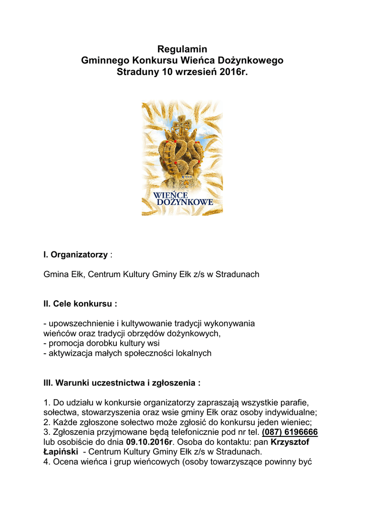 Regulamin Gminnego Konkursu Wieńca Dożynkowego Straduny 10 wrzesień 2016r. I. Organizatorzy : Gmina Ełk, Centrum Kultury Gminy Ełk z/s w Stradunach II. Cele konkursu : - upowszechnienie i kultywowanie tradycji wykonywania wieńców oraz tradycji obrzędów dożynkowych, - promocja dorobku kultury wsi - aktywizacja małych społeczności lokalnych III. Warunki uczestnictwa i zgłoszenia : 1. Do udziału w konkursie organizatorzy zapraszają wszystkie parafie, sołectwa, stowarzyszenia oraz wsie gminy Ełk oraz osoby indywidualne; 2. Każde zgłoszone sołectwo może zgłosić do konkursu jeden wieniec; 3. Zgłoszenia przyjmowane będą telefonicznie pod nr tel. (087) 6196666 lub osobiście do dnia 09.10.2016r. Osoba do kontaktu: pan Krzysztof Łapiński - Centrum Kultury Gminy Ełk z/s w Stradunach. 4. Ocena wieńca i grup wieńcowych (osoby towarzyszące powinny być w świątecznych strojach) odbędzie się około godz. 1330 – 1345 w dniu 10 września 2016r. w Stradunach na placu dożynkowym (boisko) podczas Dożynek Gminy Ełk . IV. Kryteria oceny: Organizatorzy powołają Komisję Konkursową, która oceniając wieńce będzie brała po uwagę następujące kryteria : - zgodność z tradycją ( kształt wieńca, sposób zdobienia, użycie tradycyjnych materiałów ; - ogólny wyraz artystyczny. - wszystkie wieńce powinny posiadać metryczkę ( tabliczkę z informacją o twórcy/ ach wieńca). - wieńce wykonane z innych materiałów niż tradycyjne będą oceniane w odrębnej kategorii. V. W skład Komisji Konkursowej będą wchodzić : Przedstawiciel Urzędu Gminy w Ełku; Etnograf lub plastyk; Przedstawiciel Centrum Kultury Gminy Ełk z/s w Stradunach; VI. Organizatorzy zapraszają również chętne osoby do wykonania równianek -w tej kategorii również przyznane będą nagrody rzeczowe. VII. Nagrody : Organizatorzy przewidują nagrody rzeczowe za udział w konkursie. Wszystkim uczestnikom wręczone zostaną pamiątkowe dyplomy. Wręczenie nagród nastąpi bezpośrednio po rozstrzygnięciu konkursu. Zapraszamy!!! Organizatorzy 2
