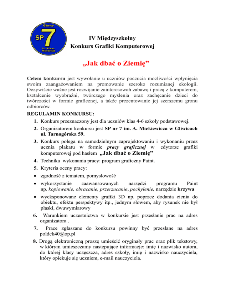 IV Międzyszkolny Konkurs Grafiki Komputerowej „Jak dbać o Ziemię” Celem konkursu jest wywołanie u uczniów poczucia możliwości wpłynięcia swoim zaangażowaniem na promowanie szeroko rozumianej ekologii. Oczywiście ważne jest rozwijanie zainteresowań zabawą i pracą z komputerem, kształcenie wyobraźni, twórczego myślenia oraz zachęcanie dzieci do twórczości w formie graficznej, a także prezentowanie jej szerszemu gronu odbiorców. REGULAMIN KONKURSU: 1. Konkurs przeznaczony jest dla uczniów klas 4-6 szkoły podstawowej. 2. Organizatorem konkursu jest SP nr 7 im. A. Mickiewicza w Gliwicach ul. Tarnogórska 59. 3. Konkurs polega na samodzielnym zaprojektowaniu i wykonaniu przez ucznia plakatu w formie pracy graficznej w edytorze grafiki komputerowej pod hasłem „Jak dbać o Ziemię” 4. Technika wykonania pracy: program graficzny Paint. 5. Kryteria oceny pracy: zgodność z tematem, pomysłowość wykorzystanie zaawansowanych narzędzi programu Paint np. kopiowanie, obracanie, przerzucanie, pochylenie, narzędzie krzywa wyeksponowane elementy grafiki 3D np. poprzez dodania cienia do obiektu, efektu perspektywy itp., jednym słowem, aby rysunek nie był płaski, dwuwymiarowy 6. Warunkiem uczestnictwa w konkursie jest przesłanie prac na adres organizatora . 7. Prace zgłaszane do konkursu powinny być przesłane na adres [email protected] 8. Drogą elektroniczną proszę umieścić oryginały prac oraz plik tekstowy, w którym umieszczamy następujące informacje: imię i nazwisko autora, do której klasy uczęszcza, adres szkoły, imię i nazwisko nauczyciela, który opiekuje się uczniem, e-mail nauczyciela. 9. Nadesłane prace nie będą zwracane. 10. Grafiki nadsyłane na konkurs muszą spełniać wszystkie kryteria PRAW AUTORSKICH, których autorzy zobowiązują się przestrzegać. 11. Za prawidłowy przebieg Konkursu odpowiedzialna jest Komisja Konkursowa powołana przez organizatora. 12. Zostaną przyznane nagrody i wyróżnienia. 13. Nagrodzone prace będą wyeksponowane na wystawie w SP nr 7 oraz na stronie WWW szkoły. 14. Nagrody rzeczowe oraz dyplomy zostaną wręczone pocztą lub osobiście. 15. Zgoda na przetwarzanie danych osobowych. TERMIN NADSYŁANIA PRAC do 15 maja 2015r. Wyniki będą ogłoszone na stronie http://sp7gliwice.pl/ do 22 maja 2015r. KONTAKT: e-mail: [email protected] Oranizatorzy: Leopold Tumidajewicz -nauczyciel zajęć komputerowych Joanna Wrześniewska -nauczyciel przyrody
