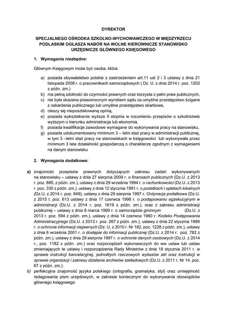 DYREKTOR SPECJALNEGO OŚRODKA SZKOLNO-WYCHOWAWCZEGO W MIĘDZYRZECU PODLASKIM OGŁASZA NABÓR NA WOLNE KIEROWNICZE STANOWISKO URZĘDNICZE GŁÓWNEGO KSIĘGOWEGO 1. Wymagania niezbędne: Głównym Księgowym może być osoba, która: a) posiada obywatelstwo polskie z zastrzeżeniem art.11 ust 2 i 3 ustawy z dnia 21 listopada 2008 r. o pracownikach samorządowych ( Dz. U. z dnia 2014 r. poz. 1202 z późn. zm.) b) ma pełną zdolność do czynności prawnych oraz korzysta z pełni praw publicznych, c) nie była skazana prawomocnym wyrokiem sądu za umyślne przestępstwo ścigane z oskarżenia publicznego lub umyślne przestępstwo skarbowe, d) cieszy się nieposzlakowaną opinią, e) posiada wykształcenie wyższe II stopnia w rozumieniu przepisów o szkolnictwie wyższym o kierunku administracja lub ekonomia, f) posiada kwalifikacje zawodowe wymagane do wykonywania pracy na stanowisku, g) posiada udokumentowany minimum 3 – letni staż pracy w administracji publicznej, w tym 3 –letni staż pracy na stanowiskach w księgowości lub wykonywała przez minimum 3 lata działalność gospodarczą o charakterze zgodnym z wymaganiami na danym stanowisku 2. Wymagania dodatkowe: a) znajomość przepisów prawnych dotyczących zakresu zadań wykonywanych na stanowisku – ustawy z dnia 27 sierpnia 2009 r. o finansach publicznych (Dz.U. z 2013 r. poz. 885, z późn. zm.), ustawy z dnia 29 września 1994 r. o rachunkowości (Dz.U. z 2013 r. poz. 330 z późn. zm.). ustawy z dnia 12 stycznia 1991 r. o podatkach i opłatach lokalnych (Dz.U. z 2014 r. poz. 849), ustawy z dnia 29 sierpnia 1997 r. Ordynacja podatkowa (Dz.U. z 2015 t. poz. 613 ustawy z dnia 17 czerwca 1996 r. o postępowaniu egzekucyjnym w administracji (Dz.U. z 2014 r. poz. 1619 z późn. zm.), oraz z zakresu administracji publicznej – ustawy z dnia 8 marca 1990 r. o samorządzie gminnym (Dz.U. z 2013 r. poz. 594 z późn. zm.), ustawy z dnia 14 czerwca 1960 r. Kodeks Postępowania Administracyjnego (Dz.U. z 2013 r. poz. 267 z późn. zm.), ustawy z dnia 22 stycznia 1999 r. o ochronie informacji niejawnych (Dz. U. z 2010 r. Nr 182, poz. 1228 z późn. zm.), ustawy z dnia 6 września 2001 r. o dostępie do informacji publicznej (Dz.U. z 2014 r. poz. 782 z późn. zm.), ustawy z dnia 29 sierpnia 1997 r. o ochronie danych osobowych (Dz.U. z 2014 r., poz. 1182 z późn. zm.) oraz rozporządzeń wykonawczych do ww ustaw lub ustaw zmieniających te ustawy i rozporządzenia Rady Ministrów z dnia 18 stycznia 2011 r. w sprawie instrukcji kancelaryjnej, jednolitych rzeczowych wykazów akt oraz instrukcji w sprawie organizacji i zakresu działania archiwów zakładowych (Dz.U. z 2011 r. Nr 14, poz. 67 z późn. zm.). b) perfekcyjna znajomość języka polskiego (ortografia, gramatyka, styl) oraz umiejętność redagowania pism urzędowych, w zakresie koniecznym do wykonywania obowiązków głównego księgowego c) biegła umiejętność obsługi komputera i aplikacji biurowych związanych z obsługa księgową jednostki d) odpowiedzialność, sumienność, rzetelność, systematyczność, komunikatywność, e) umiejętność pracy w zespole, stan zdrowia pozwala na zatrudnienie na wyżej wymienionym stanowisku 3. Zakres zadań wykonywanych na stanowisku a) prowadzenie rachunkowości jednostki w sposób zgodny z obowiązującymi przepisami prawa; b) wykonywanie dyspozycji środkami pieniężnymi oraz nadzór nad operacjami kasowymi jednostki; c) analizowanie wykorzystania środków przydzielonych z budżetu, środków pozabudżetowych i innych będących w dyspozycji jednostki; d) prowadzenie wewnętrznej kontroli finansowej (dokonywanie wstępnej kontroli zgodności operacji gospodarczych z planem finansowym oraz kompletności i rzetelności dokumentów księgowych); e) sporządzanie planów finansowych i sprawozdawczości budżetowej oraz finansowej jednostki; f) sporządzanie rozliczeń podatkowych; g) rozliczanie inwentaryzacji; h) nadzór nad prawidłowym obiegiem dokumentów księgowych; i) kontakty i współpraca z instytucjami zewnętrznymi (GUS, US,); 4. Informacje o warunkach pracy na stanowisku - Pełen etat - Umowa o pracę - Stałe wynagrodzenie - Możliwość rozwoju zawodowego (szkolenia, kursy) - planowane zatrudnienie od 01.04.2016 r. 5.Wymagane dokumenty: a) życiorys ze zdjęciem (CV) z przebiegiem nauki i pracy zawodowej – podpisany odręcznie, b) list motywacyjny – podpisany odręcznie, c) kserokopie świadectw pracy i innych dokumentów potwierdzających posiadany staż pracy - poświadczone za zgodność z oryginałem, d) kserokopie dyplomów lub innych dokumentów potwierdzających wykształcenie, dodatkowe uprawnienia, kwalifikacje – poświadczone za zgodność z oryginałem, e) oryginał kwestionariusza osobowego dla osoby ubiegającej się o zatrudnienie – podpisany odręcznie, f) kserokopia dowodu osobistego – poświadczona za zgodność z oryginałem, g) oświadczenie o pełnej zdolności do czynności prawnych oraz korzystaniu z pełni praw publicznych – podpisane odręcznie, h) oświadczenie, że kandydat nie był skazany prawomocnym wyrokiem sądu za umyślne przestępstwo ścigane z oskarżenia publicznego lub umyślne przestępstwo skarbowe – podpisane odręcznie, i) oświadczenie z klauzulą o treści: „Wyrażam zgodę na przetwarzanie moich danych osobowych zawartych w ofercie pracy dla potrzeb rekrutacji, zgodnie z ustawą z dnia 29 sierpnia 1997 r. o ochronie danych osobowych (Dz.U. z 2002 r. Nr 101, poz. 926 z późn. zm.) – podpisane odręcznie. Wyżej wymienione oświadczenia powinny zawierać klauzulę o następującej treści: „Jestem świadomy/a odpowiedzialności karnej za złożenie fałszywego oświadczenia”. Wymagane dokumenty aplikacyjne należy składać osobiście w siedzibie Specjalnego Ośrodka Szkolno – Wychowawczego lub pocztą na adres: Specjalny Ośrodek Szkolno – Wychowawczy, ul. Leśna 2A, 21-560 Międzyrzec Podlaski w kopercie z podanym imieniem i nazwiskiem, a