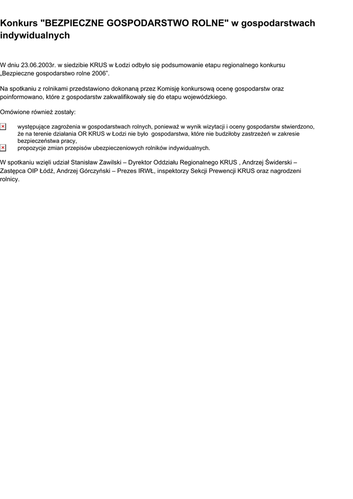 Konkurs "BEZPIECZNE GOSPODARSTWO ROLNE" w gospodarstwach indywidualnych W dniu 23.06.2003r. w siedzibie KRUS w Łodzi odbyło się podsumowanie etapu regionalnego konkursu „Bezpieczne gospodarstwo rolne 2006”. Na spotkaniu z rolnikami przedstawiono dokonaną przez Komisję konkursową ocenę gospodarstw oraz poinformowano, które z gospodarstw zakwalifikowały się do etapu wojewódzkiego. Omówione również zostały: występujące zagrożenia w gospodarstwach rolnych, ponieważ w wynik wizytacji i oceny gospodarstw stwierdzono, że na terenie działania OR KRUS w Łodzi nie było gospodarstwa, które nie budziłoby zastrzeżeń w zakresie bezpieczeństwa pracy, propozycje zmian przepisów ubezpieczeniowych rolników indywidualnych. W spotkaniu wzięli udział Stanisław Zawilski – Dyrektor Oddziału Regionalnego KRUS , Andrzej Świderski – Zastępca OIP Łódź, Andrzej Górczyński – Prezes IRWŁ, inspektorzy Sekcji Prewencji KRUS oraz nagrodzeni rolnicy.