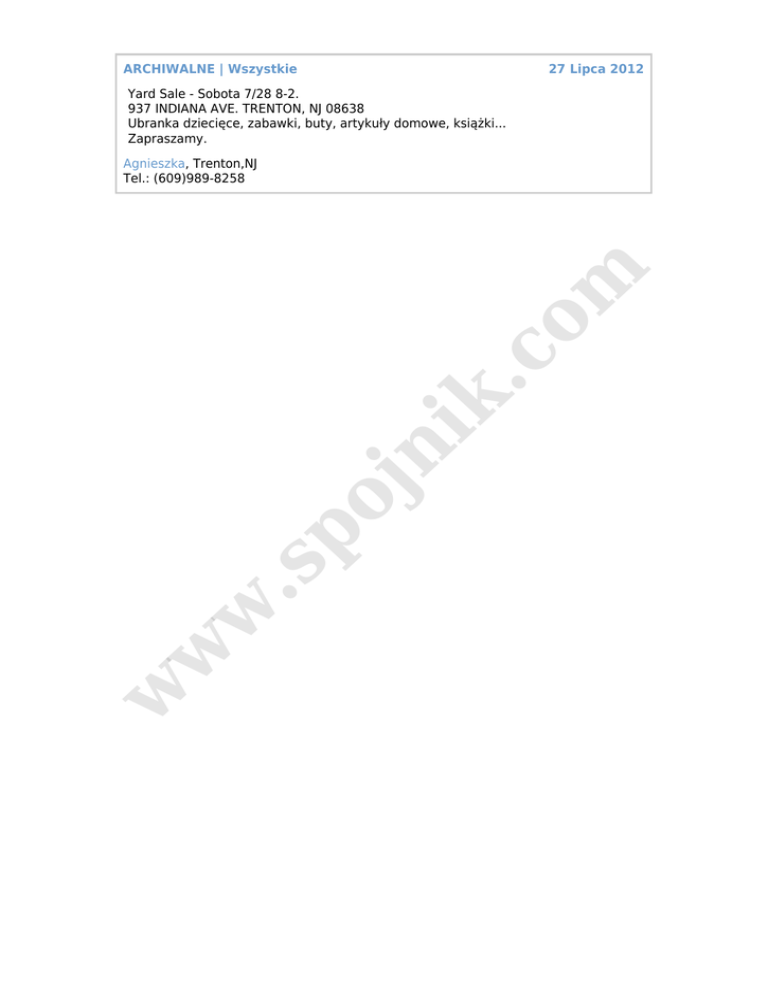 ARCHIWALNE | Wszystkie 27 Lipca 2012 Yard Sale - Sobota 7/28 8-2. 937 INDIANA AVE. TRENTON, NJ 08638 Ubranka dziecięce, zabawki, buty, artykuły domowe, książki... Zapraszamy. w w w .s po jn ik .c o m Agnieszka, Trenton,NJ Tel.: (609)989-8258