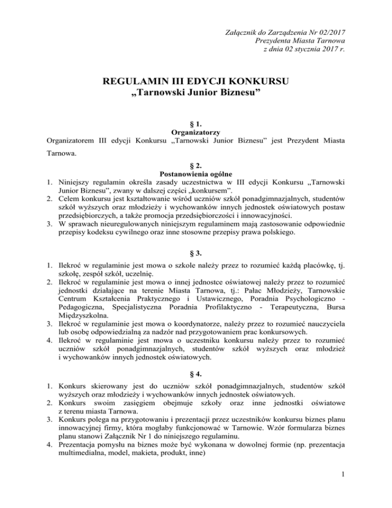 Załącznik do Zarządzenia Nr 02/2017 Prezydenta Miasta Tarnowa z dnia 02 stycznia 2017 r. REGULAMIN III EDYCJI KONKURSU „Tarnowski Junior Biznesu” § 1. Organizatorzy Organizatorem III edycji Konkursu „Tarnowski Junior Biznesu” jest Prezydent Miasta Tarnowa. § 2. Postanowienia ogólne 1. Niniejszy regulamin określa zasady uczestnictwa w III edycji Konkursu „Tarnowski Junior Biznesu”, zwany w dalszej części „konkursem”. 2. Celem konkursu jest kształtowanie wśród uczniów szkół ponadgimnazjalnych, studentów szkół wyższych oraz młodzieży i wychowanków innych jednostek oświatowych postaw przedsiębiorczych, a także promocja przedsiębiorczości i innowacyjności. 3. W sprawach nieuregulowanych niniejszym regulaminem mają zastosowanie odpowiednie przepisy kodeksu cywilnego oraz inne stosowne przepisy prawa polskiego. § 3. 1. Ilekroć w regulaminie jest mowa o szkole należy przez to rozumieć każdą placówkę, tj. szkołę, zespół szkół, uczelnię. 2. Ilekroć w regulaminie jest mowa o innej jednostce oświatowej należy przez to rozumieć jednostki działające na terenie Miasta Tarnowa, tj.: Pałac Młodzieży, Tarnowskie Centrum Kształcenia Praktycznego i Ustawicznego, Poradnia Psychologiczno Pedagogiczna, Specjalistyczna Poradnia Profilaktyczno - Terapeutyczna, Bursa Międzyszkolna. 3. Ilekroć w regulaminie jest mowa o koordynatorze, należy przez to rozumieć nauczyciela lub osobę odpowiedzialną za nadzór nad przygotowaniem prac konkursowych. 4. Ilekroć w regulaminie jest mowa o uczestniku konkursu należy przez to rozumieć uczniów szkół ponadgimnazjalnych, studentów szkół wyższych oraz młodzież i wychowanków innych jednostek oświatowych. § 4. 1. Konkurs skierowany jest do uczniów szkół ponadgimnazjalnych, studentów szkół wyższych oraz młodzieży i wychowanków innych jednostek oświatowych. 2. Konkurs swoim zasięgiem obejmuje szkoły oraz inne jednostki oświatowe z terenu miasta Tarnowa. 3. Konkurs polega na przygotowaniu i prezentacji przez uczestników konkursu biznes planu innowacyjnej firmy, która mogłaby funkcjonować w Tarnowie. Wzór formularza biznes planu stanowi Załącznik Nr 1 do niniejszego regulaminu. 4. Prezentacja pomysłu na biznes może być wykonana w dowolnej formie (np. prezentacja multimedialna, model, makieta, produkt, inne) 1 5. Pomysł na biznes powinien wpisywać się w Regionalną Strategię Innowacji Województwa Małopolskiego 2014-2020. § 5. Uczestnicy 1. Każda szkoła, inna jednostka oświatowa do konkursu może wytypować maksymalnie 3 uczestników. 2. Praca konkursowa musi mieć charakter indywidualny. Nie dopuszcza się prac zbiorowych. 3. W przypadku osób niepełnoletnich wymagana jest zgoda opiekuna prawnego (przedstawiciela ustawowego) na uczestnictwo w konkursie. Wzór oświadczenia stanowi Załącznik Nr 2 do niniejszego regulaminu. 1. 2. 3. 5. 6. 7. 1. 2. 3. 4. 5. 6. § 6. Zgłoszenia Każda szkoła, inna jednostka oświatowa, która chce wziąć udział w konkursie wyznacza koordynatora konkursu, który jest odpowiedzialny za kontakt z organizatorem przez cały czas trwania konkursu. Pełni również funkcję opiekuna wszystkich uczestników zgłoszonych ze szkoły lub innej jednostki oświatowej. Koordynator zobowiązany jest zarejestrować w konkursie szkołę lub inną jednostkę oświatową, poprzez wypełnienie formularza zgłoszeniowego, stanowiącego Załącznik Nr 3 do niniejszego regulaminu oraz dostarczyć wypełniony biznes plan III edycji Konkursu „Tarnowski Junior Biznesu”, w formie papierowej do Wydziału Rozwoju Gospodarczego Urzędu Miasta Tarnowa, pok. nr 116, ul. Mickiewicza 6, 33-100 Tarnów, w terminie do 31 marca 2017 r. Dokumentacja konkursowa wskazana w § 6 ust. 2 powinna być dostarczona w zaklejonej kopercie i opatrzona napisem: III edycja Konkursu „Tarnowski Junior Biznesu”. Do dokumentacji należy dołączyć fotografie wykonanego modelu/ makiety/ produktu, wydruk oraz wersję elektroniczną prezentacji multimedialnej na płycie CD lub na pamięci przenośnej, w przypadku wykonania prezentacji. Do dokumentacji należy dołączyć niezbędne oświadczenia, stanowiące Załączniki Nr 2, 5 i 6 do niniejszego regulaminu. Koordynator zgłaszający szkołę lub inną jednostkę oświatową podaje w formularzu zgłoszeniowym następujące dane: 1) nazwę i adres szkoły/ innej jednostki oświatowej; 2) adres e-mail szkoły/ innej jednostki oświatowej; 3) numer telefonu szkoły/ innej jednostki oświatowej; 4) imię i nazwisko dyrektora szkoły/ innej jednostki oświatowej; 5) swoje imię, nazwisko, numer telefonu oraz przedmiot nauczania; 6) imiona i nazwiska uczestników konkursu. § 7. Zasady uczestnictwa w konkursie Uczestnictwo w konkursie jest dobrowolne. Uczestnicy zobowiązują się do przestrzegania terminów konkursu. Uczestnicy konkursu podczas prezentacji indywidualnej przedstawiają wykonany model/ makietę/ produkt/ prezentację multimedialną/ inne. Koordynator zobowiązany jest stawić się wraz z uczestnikami w dniu prezentacji indywidualnej, która odbędzie się przed jury, w terminie wskazanym przez organizatora. W konkursie nie mogą wziąć udziału laureaci I i II edycji Konkursu „Tarnowski Junior Biznesu”. Uczestnictwo w konkursie jest równoznaczne z akceptacją postanowień niniejszego regulaminu. 2 7. Organizator zastrzega sobie prawo do odwołania konkursu. 8. O odwołaniu Konkursu Organizator poinformuje uczestników za pośrednictwem poczty elektronicznej oraz telefonicznie. 9. Organizator może podjąć decyzję o nieprzyznaniu nagrody, o przyznaniu nagród równorzędnych oraz o przyznaniu dodatkowych nagród niepieniężnych. 1. 2. 3. 4. 1. 2. 3. 4. 1. 2. 3. 4. § 8. Ocena prac konkursowych Oceny biznes planów oraz indywidualnych prezentacji dokonuje czteroosobowe jury powołane przez organizatora w tym: a) 2 osoby reprezentujące Urząd Miasta Tarnowa, b) 1 osoba reprezentująca wybraną każdorazowo I