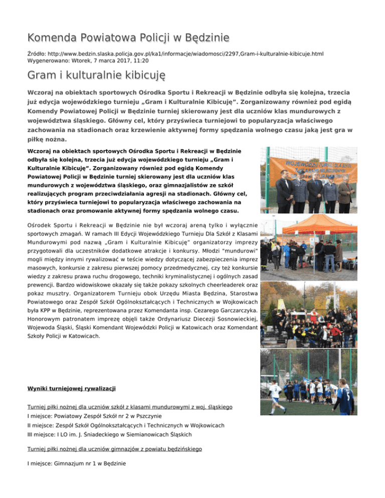 Komenda Powiatowa Policji w Będzinie Źródło: http://www.bedzin.slaska.policja.gov.pl/ka1/informacje/wiadomosci/2297,Gram-i-kulturalnie-kibicuje.html Wygenerowano: Wtorek, 7 marca 2017, 11:20 Gram i kulturalnie kibicuję Wczoraj na obiektach sportowych Ośrodka Sportu i Rekreacji w Będzinie odbyła się kolejna, trzecia już edycja wojewódzkiego turnieju „Gram i Kulturalnie Kibicuję”. Zorganizowany również pod egidą Komendy Powiatowej Policji w Będzinie turniej skierowany jest dla uczniów klas mundurowych z województwa śląskiego. Główny cel, który przyświeca turniejowi to popularyzacja właściwego zachowania na stadionach oraz krzewienie aktywnej formy spędzania wolnego czasu jaką jest gra w piłkę nożna. Wczoraj na obiektach sportowych Ośrodka Sportu i Rekreacji w Będzinie odbyła się kolejna, trzecia już edycja wojewódzkiego turnieju „Gram i Kulturalnie Kibicuję”. Zorganizowany również pod egidą Komendy Powiatowej Policji w Będzinie turniej skierowany jest dla uczniów klas mundurowych z województwa śląskiego, oraz gimnazjalistów ze szkół realizujących program przeciwdziałania agresji na stadionach. Główny cel, który przyświeca turniejowi to popularyzacja właściwego zachowania na stadionach oraz promowanie aktywnej formy spędzania wolnego czasu. Ośrodek Sportu i Rekreacji w Będzinie nie był wczoraj areną tylko i wyłącznie sportowych zmagań. W ramach III Edycji Wojewódzkiego Turnieju Dla Szkół z Klasami Mundurowymi pod nazwą „Gram i Kulturalnie Kibicuję” organizatorzy imprezy przygotowali dla uczestników dodatkowe atrakcje i konkursy. Młodzi "mundurowi" mogli między innymi rywalizować w teście wiedzy dotyczącej zabezpieczenia imprez masowych, konkursie z zakresu pierwszej pomocy przedmedycznej, czy też konkursie wiedzy z zakresu prawa ruchu drogowego, techniki kryminalistycznej i ogólnych zasad prewencji. Bardzo widowiskowe okazały się także pokazy szkolnych cheerleaderek oraz pokaz musztry. Organizatorem Turnieju obok Urzędu Miasta Będzina, Starostwa Powiatowego oraz Zespół Szkół Ogólnokształcących i Technicznych w Wojkowicach była KPP w Będzinie, reprezentowana przez Komendanta insp. Cezarego Garczarczyka. Honorowym patronatem imprezę objęli także Ordynariusz Diecezji Sosnowieckiej, Wojewoda Śląski, Śląski Komendant Wojewódzki Policji w Katowicach oraz Komendant Szkoły Policji w Katowicach. Wyniki turniejowej rywalizacji Turniej piłki nożnej dla uczniów szkół z klasami mundurowymi z woj. śląskiego I miejsce: Powiatowy Zespół Szkół nr 2 w Pszczynie II miejsce: Zespół Szkół Ogólnokształcących i Technicznych w Wojkowicach III miejsce: I LO im. J. Śniadeckiego w Siemianowicach Śląskich Turniej piłki nożnej dla uczniów gimnazjów z powiatu będzińskiego I miejsce: Gimnazjum nr 1 w Będzinie II miejsce: Gimnazjum w Rogoźniku III miejsce: Gimnazjum w Wojkowicach Wyróżnienia dla zawodników grających FAIR PLAY. W kategorii szkół mundurowych: Daniel Piekarczyk Zespół Szkół Ogólnokształcących i Technicznych w Wojkowicach, Tomasz Leszek I LO im. J. Śniadeckiego w Siemianowicach Śląskich, Paweł Zjawiński Powiatowy Zespół Szkół nr 2 w Pszczynie, Cyprian Czyż Zespół Szkół nr 1 w Myszkowie. W kategorii szkół gimnazjalnych: Marcel Sowa Gimnazjum w Wojkowicach, Michał Lis Gimnazjum nr 1 w Będzinie Turniej kulturalnego kibica. I miejsce: XIV LO im. mjr H. Sucharskiego w Katowicach II miejsce: Zespół Szkół Ogólnokształcących i Technicznych w Wojkowicach III miejsce: I LO im. J. Śniadeckiego w Siemianowicach Śląskich Pierwsza pomoc przedmedyczna - Zespół Szkół Ogólnokształcących i Technicznych w Wojkowicach Test wiedzy na temat zasad zabezpieczania imprez masowych - LO im. mjr H. Sucharskiego w Katowicach Konkursy wiedzy z zakresu prawa ruchu drogowego, techniki kryminalistycznej, ogólnych zasad prewencji - VII LO im. K. K. Baczyńskiego w Sosnowcu Zainstaluj wtyczkę Flash, aby zobaczyć odtwarzacz. pobierz film - 5.43 MB Ocena: 0/5 (0) Tweetnij
