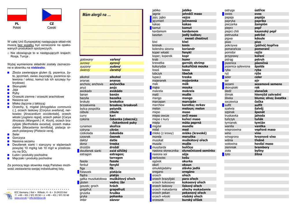 Mám alergii na … PL Polski CZ Czeski W całej Unii Europejskiej następujące skład-niki muszą bez wyjątku być oznaczone na opakowanych produktach spożywczych. o Nie obowiązuje to w następujących krajach: Rosja, Turcja . Wyżej wymienione składniki zostały zaznaczone w słowniku na niebiesko. ■ ■ ■ ■ ■ ■ ■ ■ ■ ■ ■ ■ ■ ■ Zboża zawierające gluten (tj. pszenica, żyto, jęczmień, owies zwyczajny, pszenica oplewiona / orkisz, kamut lub ich szczepy hybrydowe) Skorupiaki Jaja Ryby Orzeszki ziemne / orzeszki arachidowe Nasiona soi Mleko (łącznie z laktozą) Orzechy, tj. migdał [Amygdalus communis L.], orzech laskowy [Corylus avellana], nerkowiec [Anacardium occidentale], orzech włoski [Juglans regia], orzech pekan [Carya illinoiesis (Wangenh.) K. Koch], orzech brazylijski [Bertholletia excelsa], orzech makadamia [Macadamia ternifolia], pistacja orzech pistacjowy [Pistacia vera], Seler Gorczyca Nasiona sezamu Dwutlenek siarki i siarczyny w stężeniach powyżej 10 mg/kg lub 10 mg/l w przeliczeniu na SO2 Łubin i produkty pochodne Mięczaki i produkty pochodne Za pomocą tego słownika mają Państwo możliwość zestawienia swojej indiwidualnej listy. ------------------------------ECC Germany / Kiel y Willestr. 4 - 6 y D-24103 Kiel ℡ +49 – 431 / 971 93 50 y +49 – 431 / 971 93 60 www.evz.de y [email protected] gotowany surowy suszony świerzy vařený syrový sušený čerstvý alkohol ananas anchois; anchovis anyż awokado banan bazylia brokuły brzoskwinia bylica pospolita cebula curry cykoria alkohol ananas ančovička anýz avokádo banán bazalka brokolice broskve; broskvoň pelyněk cibule kari čekanka (obecná); čekankové puky skořice citrón čokoláda česnek datle treska droždí oxid siřičitý estragon; tarragon fazole fenykl fík pistácie platýs muškátový ořech vedro; žár hrách grapefruit hruška pohanka zázvor cynamon cytryna czekolada czosnek daktyl dorsz drożdże * dwutlenek siarki estragon fasola fenkuł figa * fistaszek flądra gałka muszkatołowa * gluten goszek; groch grejpfrut gruszka gryka imbir jabłko jagnie * jajo; jajko * jęczmień kakao * kamut kardamom kasztan kiwi kminek kolendra siewna koper włoski koper; koperek krab krewetka kukurydza łosoś lubczyk łupacz majeranek mak * mąka makrela małż mango marcepan marchew melon mięso mięso owcze mięso z kury mięta * migdał miód * mleko (z krowy) morela muszkat muszla * musztarda nasiona słonecznika * nasiona soi * nerkowiec ogórek okoń omułekjadalny oregano * orzech * orzech brazylijski orzech kokosowy * orzech laskowy * orzech makadamia * orzech pekan * orzech włoski * orzeszek jablko jehněčí maso vejce ječmenná kakao kamut kardamom jedlý kaštan; sweet chestnut kiwi kmín koriandr fenykl kopr humr garnát; shrimp kukuřičná mouka losos libeček treska majoránka mák mouka makrela mušle mango marcipán karotka; mrkev meloun; melon maso ovčí maso kuřecí maso máta peprná mandle med mléko (kravské) meruňka muškátový ořech mušle hořčice slunečnicové semínko sója kešu okurka okoun slávka jedlá oregáno ořech para ořech kokosový ořech lískový ořech ořechy makadamie pekanový ořech vlašský ořech burský oříšek ostryga * owies papaja papryka pieczarka pieprz pieprz chili pietruszka pigwa piwo pokrzywa pomarańcza pomidor przyprawy pstrąg * pszenica * pszenica oplewiona * ryba ryż * seler ser * sezami * skorupiaki śledź ślimak śliwka soczewica * sulfit szałwia szpinak truskawka tuńczyk tymianek wanilia wieprzowina wino winogrono wiśnia wołowina ziemniak zioła * żyto ústřice oves papája paprika žampión pepř kayenský pepř petržel kdoule pivo (pálivá) kopřiva pomeranč rajče koření pstruh pšeničná špalda ryba rýže celer sýr sezamové semeno rak slaneček hlemýžd zahradní bluma; sliva; švestka čočka sulfit šalvěj špenát jahoda tuňák tymián vanilka vepřové maso víno hroznové víno třešně hovězí maso brambory byliny žitná