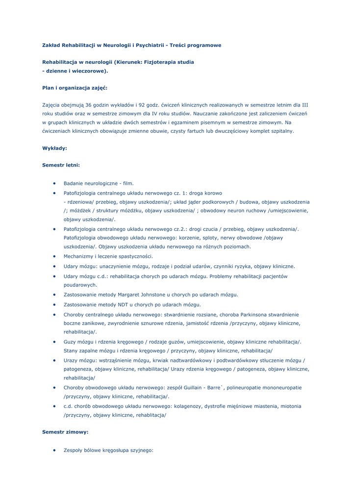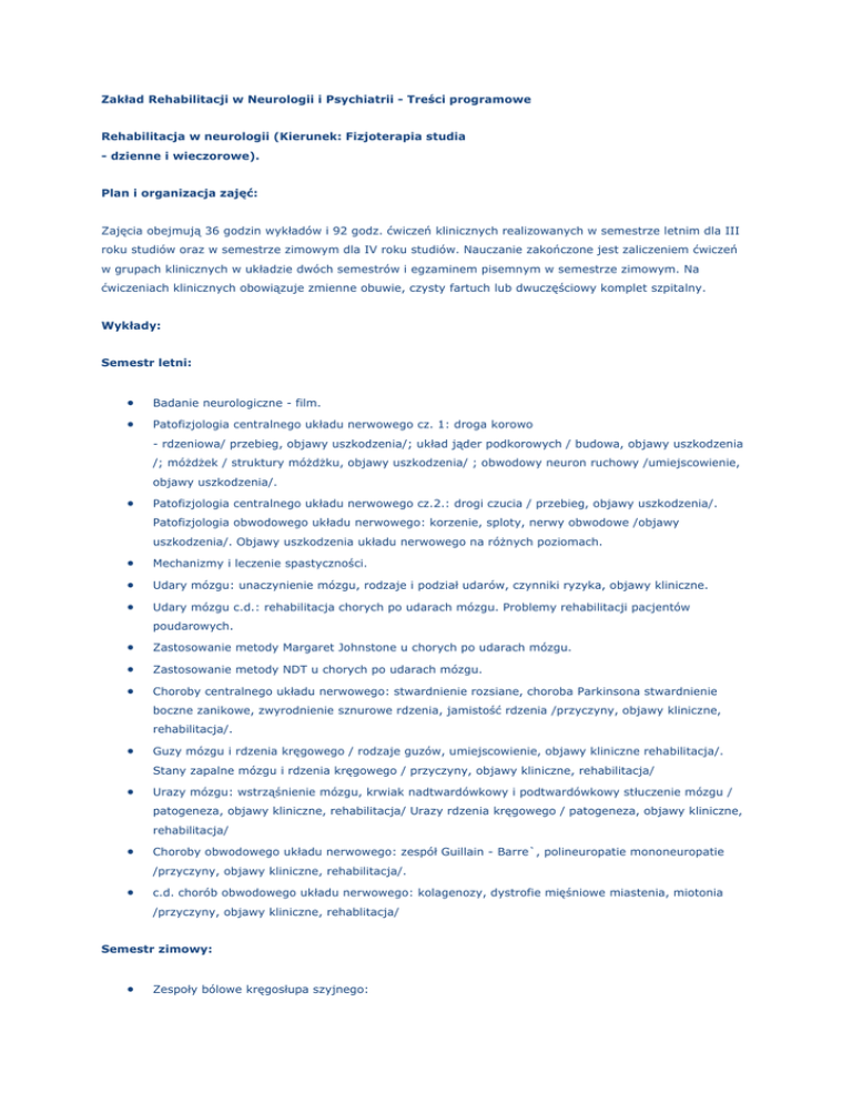 Zakład Rehabilitacji w Neurologii i Psychiatrii - Treści programowe Rehabilitacja w neurologii (Kierunek: Fizjoterapia studia - dzienne i wieczorowe). Plan i organizacja zajęć: Zajęcia obejmują 36 godzin wykładów i 92 godz. ćwiczeń klinicznych realizowanych w semestrze letnim dla III roku studiów oraz w semestrze zimowym dla IV roku studiów. Nauczanie zakończone jest zaliczeniem ćwiczeń w grupach klinicznych w układzie dwóch semestrów i egzaminem pisemnym w semestrze zimowym. Na ćwiczeniach klinicznych obowiązuje zmienne obuwie, czysty fartuch lub dwuczęściowy komplet szpitalny. Wykłady: Semestr letni: • Badanie neurologiczne - film. • Patofizjologia centralnego układu nerwowego cz. 1: droga korowo - rdzeniowa/ przebieg, objawy uszkodzenia/; układ jąder podkorowych / budowa, objawy uszkodzenia /; móżdżek / struktury móżdżku, objawy uszkodzenia/ ; obwodowy neuron ruchowy /umiejscowienie, objawy uszkodzenia/. • Patofizjologia centralnego układu nerwowego cz.2.: drogi czucia / przebieg, objawy uszkodzenia/. Patofizjologia obwodowego układu nerwowego: korzenie, sploty, nerwy obwodowe /objawy uszkodzenia/. Objawy uszkodzenia układu nerwowego na różnych poziomach. • Mechanizmy i leczenie spastyczności. • Udary mózgu: unaczynienie mózgu, rodzaje i podział udarów, czynniki ryzyka, objawy kliniczne. • Udary mózgu c.d.: rehabilitacja chorych po udarach mózgu. Problemy rehabilitacji pacjentów poudarowych. • Zastosowanie metody Margaret Johnstone u chorych po udarach mózgu. • Zastosowanie metody NDT u chorych po udarach mózgu. • Choroby centralnego układu nerwowego: stwardnienie rozsiane, choroba Parkinsona stwardnienie boczne zanikowe, zwyrodnienie sznurowe rdzenia, jamistość rdzenia /przyczyny, objawy kliniczne, rehabilitacja/. • Guzy mózgu i rdzenia kręgowego / rodzaje guzów, umiejscowienie, objawy kliniczne rehabilitacja/. Stany zapalne mózgu i rdzenia kręgowego / przyczyny, objawy kliniczne, rehabilitacja/ • Urazy mózgu: wstrząśnienie mózgu, krwiak nadtwardówkowy i podtwardówkowy stłuczenie mózgu / patogeneza, objawy kliniczne, rehabilitacja/ Urazy rdzenia kręgowego / patogeneza, objawy kliniczne, rehabilitacja/ • Choroby obwodowego układu nerwowego: zespół Guillain - Barre`, polineuropatie mononeuropatie /przyczyny, objawy kliniczne, rehabilitacja/. • c.d. chorób obwodowego układu nerwowego: kolagenozy, dystrofie mięśniowe miastenia, miotonia /przyczyny, objawy kliniczne, rehablitacja/ Semestr zimowy: • Zespoły bólowe kręgosłupa szyjnego: • - zmiany zwyrodnieniowe, • - dyskopatia, • - niestabilność, • - rwa ramienna • / przyczyny, objawy kliniczne, rehabilitacja/. • Zespoły bólowe kręgosłupa lędźwiowego: • - zmiany zwyrodnieniowe • - dyskopatia • - wąski kanał kręgowy • - rwa kulszowa i udowa • - osteoporoza • / przyczyny, objawy kliniczne, rehabilitacja/ • Inne choroby układu nerwowego / choroba Jacoba Creutzfelda, Alzheimera, AIDS, ,, kuru"./ • Rehabilitacja kompleksowa w chorobach neurologicznych. • Metoda PNF w rehabilitacji neurologicznej. Ćwiczenia: Do przystąpienia do ćwiczeń jest wymagana wiedza z zakresu: • Powtórzenie wiadomości z zakresu anatomii, fizjologii i patofizjologii układu nerwowego. • Przygotowanie teoretyczne z zakresu poszczególnych jednostek chorobowych, które będą omawiane na ćwiczeniach (według ustalonego programu ćwiczeń). • Umiejętność wykorzystania wiedzy z zakresu kinezyterapii w praktyce. Podstawa zaliczenia ćwiczeń poszczególnych semestrów: Obecność na wszystkich zajęciach; zaliczenie wszystkich jednostek ćwiczeniowych; zaliczenie kolokwium i zaliczenie kolokwium końcowego. Semestr letni Ćwiczenia kliniczne nr 1 - 4 godziny. Badanie neurologiczne. Elementy badania neurologicznego: wywiad, badanie zakresu ruchów w stawach, badanie siły mm, ocena napięcia mm, badanie czucia, badanie zborności ruchów, badanie odruchów fizjologicznych i patologicznych / Babińskiego, Rossolimo, Oppenheima/, próba Romberga, ocena chodu i rodzaje chodów patologicznych w neurologii,objawy rozciągowe / objaw Laseque'a, objaw Mackiewicza, objaw Fajersztajna- Krzemickiego, objaw Bikelesa/, objawy oponowe /sztywność karku, Brudzińskiego, Kerniga/. Ćwiczenia kliniczne nr 2 - 4 godziny. Udar mózgu: czynniki ryzyka, etiopatogeneza, podział udarów, rodzaje udarów, przebieg, objawy kliniczne udaru. Tętniak, naczyniak, krwotok podpajęczynówkowy. mówienie przypadków klinicznych Ćwiczenia kliniczne nr 3 - 4 godziny. Patofizjologia krążenia mózgowego. Regulacja przepływu krwi przez mózg, budowa anatomiczna koła tętniczego mózgu, krążenie oboczne, zespoły tętnic mózgowych. Reprezentacja ruchowa w korze mózgu. Wpływ lokalizacji ogniska uszkodzenia na zakres porażeń. Ćwiczenia kliniczne nr 4 - 4 godziny. Rehabilitacja po udarze mózgu l metoda tradycyjna /, omówienie etapów rehabilitacji /różne etapy pionizacji w zależności od rodzaju udaru /, rokowanie, zaopatrzenie ortopedyczne, funkcjonalna elektrostymulacja, czynniki obniżające wzmożone napięcie mięśniowe. Ćwiczenia kliniczne nr 5 - 4 godziny. Inne metody rehabilitacji po udarze mózgu. Ćwiczenia kliniczne nr 6 - 4 godziny. Guzy mózgu / nowotwory mózgu /, objawy kliniczne, rehabilitacja. Wgłobienia, wklinowacenia. Zaburzenia wyższych czynności psychicznych. Ćwiczenia kliniczne nr 7 - 4 godziny. Urazy mózgu. Wstrząśnienie mózgu, stłuczenie mózgu, obrzęk pourazowy, zranienie mózgu, objawy kliniczne. Cerebrastenia pourazowa, encefalopatia pourazowa. Krwiak nadtwardówkowy, krwiak podtwardówkowy: objawy kliniczne. Rehabilitacja po urazach mózgu. Twór siatkowaty: budowa, funkcje, obiawy uszkodzenia, sztywność odmóżdżeniowa, sztywność z odkorowania. Ćwiczenia kliniczne nr 8 - 4 godziny. Choroba Parkinsona. Zespół parkinsonowski. Etiologia, objawy kliniczne /wczesne i późne/, metody leczenia, pro