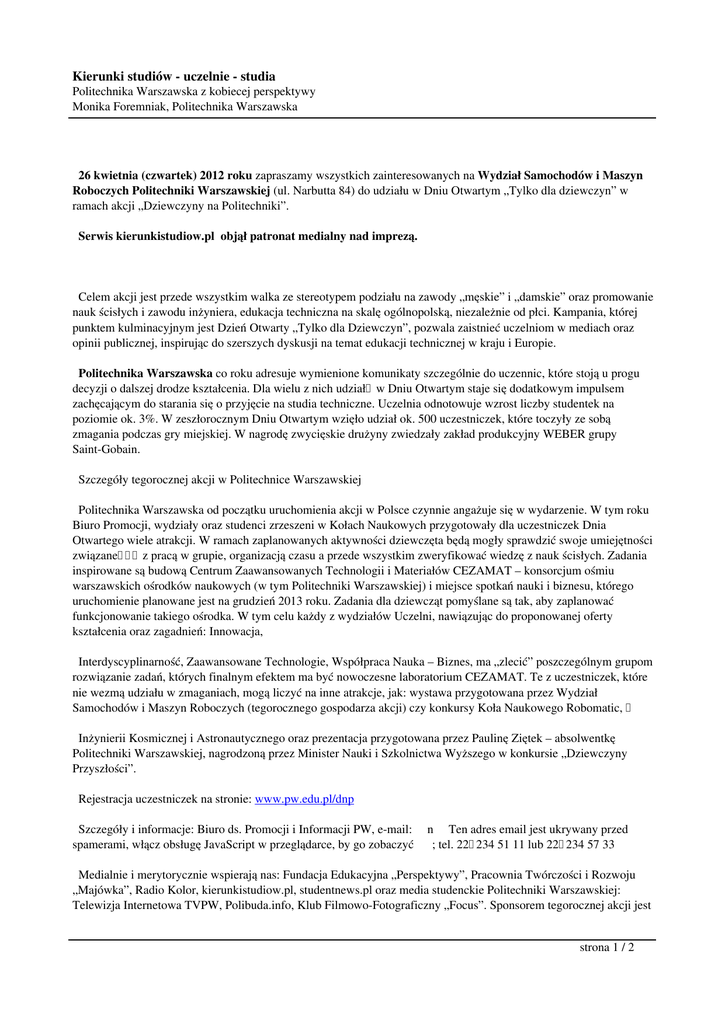 Kierunki studiów - uczelnie - studia Politechnika Warszawska z kobiecej perspektywy Monika Foremniak, Politechnika Warszawska 26 kwietnia (czwartek) 2012 roku zapraszamy wszystkich zainteresowanych na Wydział Samochodów i Maszyn Roboczych Politechniki Warszawskiej (ul. Narbutta 84) do udziału w Dniu Otwartym „Tylko dla dziewczyn” w ramach akcji „Dziewczyny na Politechniki”. Serwis kierunkistudiow.pl objął patronat medialny nad imprezą. Celem akcji jest przede wszystkim walka ze stereotypem podziału na zawody „męskie” i „damskie” oraz promowanie nauk ścisłych i zawodu inżyniera, edukacja techniczna na skalę ogólnopolską, niezależnie od płci. Kampania, której punktem kulminacyjnym jest Dzień Otwarty „Tylko dla Dziewczyn”, pozwala zaistnieć uczelniom w mediach oraz opinii publicznej, inspirując do szerszych dyskusji na temat edukacji technicznej w kraju i Europie. Politechnika Warszawska co roku adresuje wymienione komunikaty szczególnie do uczennic, które stoją u progu decyzji o dalszej drodze kształcenia. Dla wielu z nich udział w Dniu Otwartym staje się dodatkowym impulsem zachęcającym do starania się o przyjęcie na studia techniczne. Uczelnia odnotowuje wzrost liczby studentek na poziomie ok. 3%. W zeszłorocznym Dniu Otwartym wzięło udział ok. 500 uczestniczek, które toczyły ze sobą zmagania podczas gry miejskiej. W nagrodę zwycięskie drużyny zwiedzały zakład produkcyjny WEBER grupy Saint-Gobain. Szczegóły tegorocznej akcji w Politechnice Warszawskiej Politechnika Warszawska od początku uruchomienia akcji w Polsce czynnie angażuje się w wydarzenie. W tym roku Biuro Promocji, wydziały oraz studenci zrzeszeni w Kołach Naukowych przygotowały dla uczestniczek Dnia Otwartego wiele atrakcji. W ramach zaplanowanych aktywności dziewczęta będą mogły sprawdzić swoje umiejętności związane z pracą w grupie, organizacją czasu a przede wszystkim zweryfikować wiedzę z nauk ścisłych. Zadania inspirowane są budową Centrum Zaawansowanych Technologii i Materiałów CEZAMAT – konsorcjum ośmiu warszawskich ośrodków naukowych (w tym Politechniki Warszawskiej) i miejsce spotkań nauki i biznesu, którego uruchomienie planowane jest na grudzień 2013 roku. Zadania dla dziewcząt pomyślane są tak, aby zaplanować funkcjonowanie takiego ośrodka. W tym celu każdy z wydziałów Uczelni, nawiązując do proponowanej oferty kształcenia oraz zagadnień: Innowacja, Interdyscyplinarność, Zaawansowane Technologie, Współpraca Nauka – Biznes, ma „zlecić” poszczególnym grupom rozwiązanie zadań, których finalnym efektem ma być nowoczesne laboratorium CEZAMAT. Te z uczestniczek, które nie wezmą udziału w zmaganiach, mogą liczyć na inne atrakcje, jak: wystawa przygotowana przez Wydział Samochodów i Maszyn Roboczych (tegorocznego gospodarza akcji) czy konkursy Koła Naukowego Robomatic, Inżynierii Kosmicznej i Astronautycznego oraz prezentacja przygotowana przez Paulinę Ziętek – absolwentkę Politechniki Warszawskiej, nagrodzoną przez Minister Nauki i Szkolnictwa Wyższego w konkursie „Dziewczyny Przyszłości”. Rejestracja uczestniczek na stronie: www.pw.edu.pl/dnp Szczegóły i informacje: Biuro ds. Promocji i Informacji PW, e-mail: spamerami, włącz obsługę JavaScript w przeglądarce, by go zobaczyć n Ten adres email jest ukrywany przed ; tel. 22 234 51 11 lub 22 234 57 33 Medialnie i merytorycznie wspierają nas: Fundacja Edukacyjna „Perspektywy”, Pracownia Twórczości i Rozwoju „Majówka”, Radio Kolor, kierunkistudiow.pl, studentnews.pl oraz media studenckie Politechniki Warszawskiej: Telewizja Internetowa TVPW, Polibuda.info, Klub Filmowo-Fotograficzny „Focus”. Sponsorem tegorocznej akcji jest strona 1 / 2 Kierunki studiów - uczelnie - studia Politechnika Warszawska z kobiecej perspektywy Monika Foremniak, Politechnika Warszawska firma Robert Bosch Sp. z o.o. strona 2 / 2