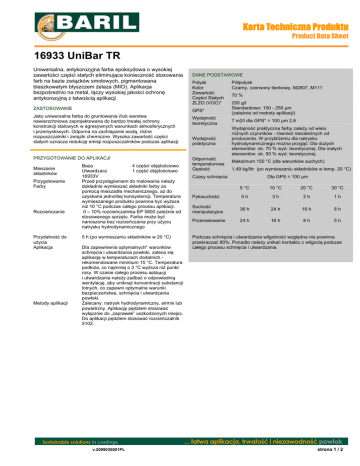 G GGGGGGGGGGGGGGGGG Karta Techniczna Produktu Product Data Sheet G G 16933 UniBar TR Uniwersalna, antykorozyjna farba epoksydowa o wysokiej zawartoci czci staych eliminujca konieczno stosowania farb na bazie zwizków smoowych, pigmentowana blaszkowatym byszczem elaza (MIO). Aplikacja bezporednio na metal, czy wysokiej jakoci ochron antykorozyjn z atwoci aplikacji DANE PODSTAWOWE Poysk Kolor Zawarto Czci Staych ZLZO (VOC)* Pópoysk Czarny, czerwony tlenkowy, M2807, M111 70 % 250 g/l Standardowo: 100 - 250 m (zalenie od metody aplikacji) ZASTOSOWANIE GPS* Jako uniwersalna farba do gruntowania i/lub warstwa nawierzchniowa zaprojektowana do bardzo trwaej ochrony konstrukcji stalowych w agresywnych warunkach atmosferycznych i przemysowych. Odporna na zachlapanie wod, róne rozpuszczalniki i zwizki chemiczne. Wysoka zawarto czci staych oznacza redukcj emisji rozpuszczalników podczas aplikacji. Wydajno teoretyczna 7 m2/l dla GPS* = 100 m 2,8 Wydajno praktyczna Wydajno praktyczna farby zaley od wielu rónych czynników - równie niezalenych od producenta. W przyblieniu dla natrysku hydrodynamicznego mona przyj: Dla duych elementów: ok. 70 % wyd. teoretycznej. Dla maych elementów: ok. 50 % wyd. teoretycznej. PRZYGOTOWANIE DO APLIKACJI Odporno temperaturowa Gsto Mieszanie skadników Przygotowanie Farby Rozcieczanie Przydatno do uycia Aplikacja Metody aplikacji Baza 4 czci objtociowo Utwardzacz 1 cz objtociowo 16933V Przed przystpieniem do malowania naley dokadnie wymiesza skadniki farby za pomoc mieszada mechanicznego, a do uzyskana jednolitej konsystencji. Temperatura wymieszanego produktu powinna by wysza ni 10 °C podczas caego procesu aplikacji. 0 – 10% rozcieczalnika EP 5800 zalenie od stosowanego sprztu. Farba moe by nanoszona bez rozcieczania przy uyciu natrysku hydrodynamicznego 5 h (po wymieszaniu skadników w 20 °C) Dla zapewnienia optymalnych* warunków schnicia i utwardzania powoki, zaleca si aplikacj w temperaturach dodatnich rekomendowane minimum 15 °C. Temperatura podoa, co najmniej o 3 °C wysza ni punkt rosy. W czasie caego procesu aplikacji i utwardzania naley zadba o odpowiedni wentylacj, aby unikn koncentracji substancji lotnych, co zapewni optymalne warunki bezpieczestwa, schnicia i utwardzania powoki. Zalecany: natrysk hydrodynamiczny, airmix lub powietrzny. Aplikacj pdzlem stosowa wycznie do „zaprawek” uszkodzonych miejsc. Do aplikacji pdzlem stosowa rozcieczalnik 5102. Sustainable solutions in coatings v.2009030001PL Maksimum 150 °C (dla warunków suchych) 1,49 kg/litr (po wymieszaniu skadników w temp. 20 °C) Czasy schnicia: Dla GPS = 100 m 5 °C 10 °C 20 °C 30 °C Pyosucho 5h 3h 2h 1h Sucho manipulacyjna 36 h 24 h 16 h 8h Przemalowanie 24 h 16 h 8h 5h Podczas schnicia i utwardzania wilgotno wzgldna nie powinna przekracza 80%. Ponadto naley unika kontaktu z wilgoci podczas caego procesu schnicia i utwardzania. ... atwa aplikacja, trwao i niezawodno powok strona 1 / 2 GGG GGGGGGGGGGGGGGGGG Karta Techniczna Produktu Product Data Sheet G G16933 UniBar TR INFROMACJE DOTYCZCE BEZPIECZESTWA ZALECENIA APLIKACYJNE Oznaczenia Hydrodynamicznie Airmix Rozcieczalnik Zalecana ilo Rozmiar dyszy Cinienie robocze GPS* EP5800 0-10 % obj. 0,015-0,017 cala 150-175 bar 100-250 μm EP5800 5-10 %obj. 0,015 - 0,017 cala 70-100 bar 100-250 μm Natrysk Powietrzny Pdzel/Waek Rozcieczalnik Zalecana ilo Rozmiar dyszy Cinienie robocze GPS* EP5800 5-10 %obj. 2,0-2,5 mm 3-4 bar 100-250 μm EP5800/S5102 0-5 % obj. Szkodliwy i dranicy w kontakcie ze skór, oczami i drogami oddechowymi. W przypadku kontaktu z oczami, natychmiast przemy du iloci czystej wody i skontaktowa si z lekarzem. Nie je, nie pi oraz nie pali tytoniu podczas aplikacji. UN O szczegóowe / indywidualne rekomendacje dotyczce szczególnych zastosowa oraz przygotowania powierzchni prosimy skontaktowa si z konsultantem Baril Coatings. 1263 DANE UZUPENIAJCE Opakowania Puszki 20 litrowe lub beczki 200 litrów. Rozcieczalnik w kanistrach 25 litrów lub beczkach 200 litrowych. Okres przechowywania W szczelnych oryginalnych opakowaniach 12 miesicy, przechowywane w temperaturach pomidzy 5 °C i 40 °C. Dodatkowe informacje dotyczce bezpieczestwa zawarte s w Karcie Charakterystyki Niebezpiecznego Preparatu Chemicznego: UniBar TR [16933] Uwagi * GPS = Grubo Powoki na Sucho * ZLZO (VOC) = Zawarto Lotnych Zwizków Organicznych (VOC) * Optymalne warunki schnicia = brak lub minimalna ilo rozcienczalnika do mieszaniny, najwysza moliwe do aplikacji GSP, najlepsze waciwoci tiksotropowe, brak czasu indukcji dla mieszaniny itp. 100 μm Pdzel/Waek - do aplikacji farb dwuskadnikowych. Czyszczenie narzdzi: Niezwocznie po aplikacji z uyciem rozcieczalnika EP5800. Zgodnie z wytycznymi EU nr 67/548/EEG GWARANCJA I OGRANICZENIA ODPOWIEDZIALNOCI Dane techniczne oraz inne publikowane informacje przedstawione przez producenta s prawdziwe i odpowiadaj naszej najlepszej wiedzy o produkcie. Dla produktu deklarujemy udzielenie gwarancji w myl gwarancji o ograniczonej odpowiedzialnoci. Odpowiedzialno, jeeli zaistnieje jej wymagalno ogranicza si do wymiany lub dostarczenia wadliwego materiau w myl ograniczenia odpowiedzialnoci producenta za dostarczony materia. Wzór umowy gwarancyjnej moe przedstawi tylko Baril Coatings. Umowa Gwarancyjna okrela warunki i zakres odpowiedzialnoci za produkt. Modyfikacja jakiegokolwiek punktu umowy gwarancyjnej powoduje uniewanienie gwarancji chyba, e zostaa uzgodniona w formie pisemnej z Baril Coatings. adne inne formy czy wzory umowy gwarancyjnej nie bd stosowane i respektowane. Produkty i informacje techniczne zostay opracowane dla uytkowników profesjonalnych o odpowiednim poziomie technicznym i kwalifikacjach. W zwizku z powyszym za ostateczne okrelenie przydatnoci produktu dla konkretnego zastosowania odpowiada uytkownik kocowy. Baril Coatings nie odpowiada za stan przygotowania powierzchni przygotowanej do aplikacji ani za inne powizane czynniki w trakcie nanoszenia powok i wiele innych w zwizku z czym nie ponosi odpow