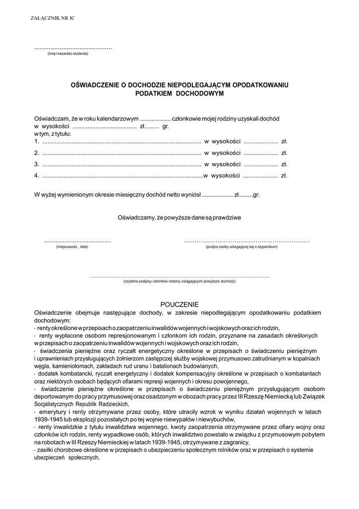 ZAŁĄCZNIK NR IC ........................................... (imię i nazwisko studenta) OŚWIADCZENIE O DOCHODZIE NIEPODLEGAJĄCYM OPODATKOWANIU PODATKIEM DOCHODOWYM Oświadczam, że w roku kalendarzowym ................... członkowie mojej rodziny uzyskali dochód w wysokości ....................................... zł......... gr. w tym, z tytułu: 1. ............................................................................................ w wysokości .................... zł. 2. ............................................................................................ w wysokości .................... zł. 3. ............................................................................................ w wysokości .................... zł. 4. .............................................................................................w wysokości .................... zł. W wyżej wymienionym okresie miesięczny dochód netto wyniósł ................... zł.........gr. Oświadczamy, że powyższe dane są prawdziwe ....................................... …………………………………………………… (miejscowość, data) (podpis osoby ubiegającej się o stypendium) .......................................................................................................................................................... (czytelne podpisy członków rodziny osiągających powyższe dochody) POUCZENIE Oświadczenie obejmuje następujące dochody, w zakresie niepodlegającym opodatkowaniu podatkiem dochodowym: - renty określone w przepisach o zaopatrzeniu inwalidów wojennych i wojskowych oraz ich rodzin, - renty wypłacone osobom represjonowanym i członkom ich rodzin, przyznane na zasadach określonych w przepisach o zaopatrzeniu inwalidów wojennych i wojskowych oraz ich rodzin, - świadczenia pieniężne oraz ryczałt energetyczny określone w przepisach o świadczeniu pieniężnym i uprawnieniach przysługujących żołnierzom zastępczej służby wojskowej przymusowo zatrudnianym w kopalniach węgla, kamieniołomach, zakładach rud uranu i batalionach budowlanych, - dodatek kombatancki, ryczałt energetyczny i dodatek kompensacyjny określone w przepisach o kombatantach oraz niektórych osobach będących ofiarami represji wojennych i okresu powojennego, - świadczenie pieniężne określone w przepisach o świadczeniu pieniężnym przysługującym osobom deportowanym do pracy przymusowej oraz osadzonym w obozach pracy przez III Rzeszę Niemiecką lub Związek Socjalistycznych Republik Radzieckich, - emerytury i renty otrzymywane przez osoby, które utraciły wzrok w wyniku działań wojennych w latach 1939-1945 lub eksplozji pozostałych po tej wojnie niewypałów i niewybuchów, - renty inwalidzkie z tytułu inwalidztwa wojennego, kwoty zaopatrzenia otrzymywane przez ofiary wojny oraz członków ich rodzin, renty wypadkowe osób, których inwalidztwo powstało w związku z przymusowym pobytem na robotach w III Rzeszy Niemieckiej w latach 1939-1945, otrzymywane z zagranicy, - zasiłki chorobowe określone w przepisach o ubezpieczeniu społecznym rolników oraz w przepisach o systemie ubezpieczeń społecznych, - środki bezzwrotnej pomocy zagranicznej otrzymywane od rządów państw obcych, organizacji międzynarodowych lub międzynarodowych instytucji finansowych, pochodzące ze środków bezzwrotnej pomocy przyznanych na podstawie jednostronnej deklaracji lub umów zawartych z tymi państwami, organizacjami lub instytucjami przez Radę Ministrów, właściwego ministra lub agencje rządowe, w tym również w przypadkach, gdy przekazanie tych środków jest dokonywane za pośrednictwem podmiotu upoważnionego do rozdzielania środków bezzwrotnej pomocy zagranicznej na rzecz podmiotów, którym służyć ma ta pomoc, - należności ze stosunku pracy lub z tytułu stypendium osób fizycznych mających miejsce zamieszkania na terytorium Rzeczypospolitej Polskiej, przebywających czasowo za granicą - w wysokości odpowiadającej równowartości diet z tytułu podróży służbowej poza granicami kraju ustalonych dla pracowników zatrudnionych w państwowych lub samorządowych jednostkach sfery budżetowej na podstawie ustawy z dnia 26 czerwca 1974 r. Kodeks pracy (Dz. U. z 1998 r. Nr 21, poz. 94, z późn. zm.), - należności pieniężne wypłacone policjantom, żołnierzom, celnikom i pracownikom jednostek wojskowych i jednostek policyjnych użytych poza granicami państwa w celu udziału w konflikcie zbrojnym lub wzmocnienia sił państwa albo państw sojuszniczych, misji pokojowej, akcji zapobieżenia aktom terroryzmu lub ich skutkom, a także należności pieniężne wypłacone żołnierzom, policjantom, celnikom i pracownikom pełniącym funkcje obserwatorów w misjach pokojowych organizacji międzynarodowych i sił wielonarodowych, - należności pieniężne ze stosunku służbowego otrzymywane w czasie służby kandydackiej przez funkcjonariuszy Policji, Państwowej Straży Pożarnej, Straży Granicznej i Biura Ochrony Rządu, obliczone za okres, w którym osoby te uzyskały dochód, - dochody członków rolniczych spółdzielni produkcyjnych z tytułu członkostwa w rolniczej spółdzielni produkcyjnej, - alimenty na rzecz dzieci, - kwoty diet nieopodatkowane podatkiem dochodowym od osób fizycznych, otrzymywane przez osoby wykonujące czynności związane z pełnieniem obowiązków społecznych i obywatelskich, - należności pieniężne otrzymywane z tytułu wynajmu pokoi gościnnych w budynkach mieszkalnych położonych na terenach wiejskich w gospodarstwie rolnym osobom przebywającym na wypoczynku oraz uzyskane z tytułu wyżywienia tych osób, - dodatki za tajne nauczanie określone w ustawie z dnia 26 stycznia 1982 r. - Karta Nauczyciela (Dz. U. z 2003 r. Nr 118, poz. 1112 z późn. zm.), - dochody uzyskane z działalności gospodarczej prowadzonej na podstawie zezwolenia na terenie specjalnej strefy ekonomicznej określonej w przepisach o s