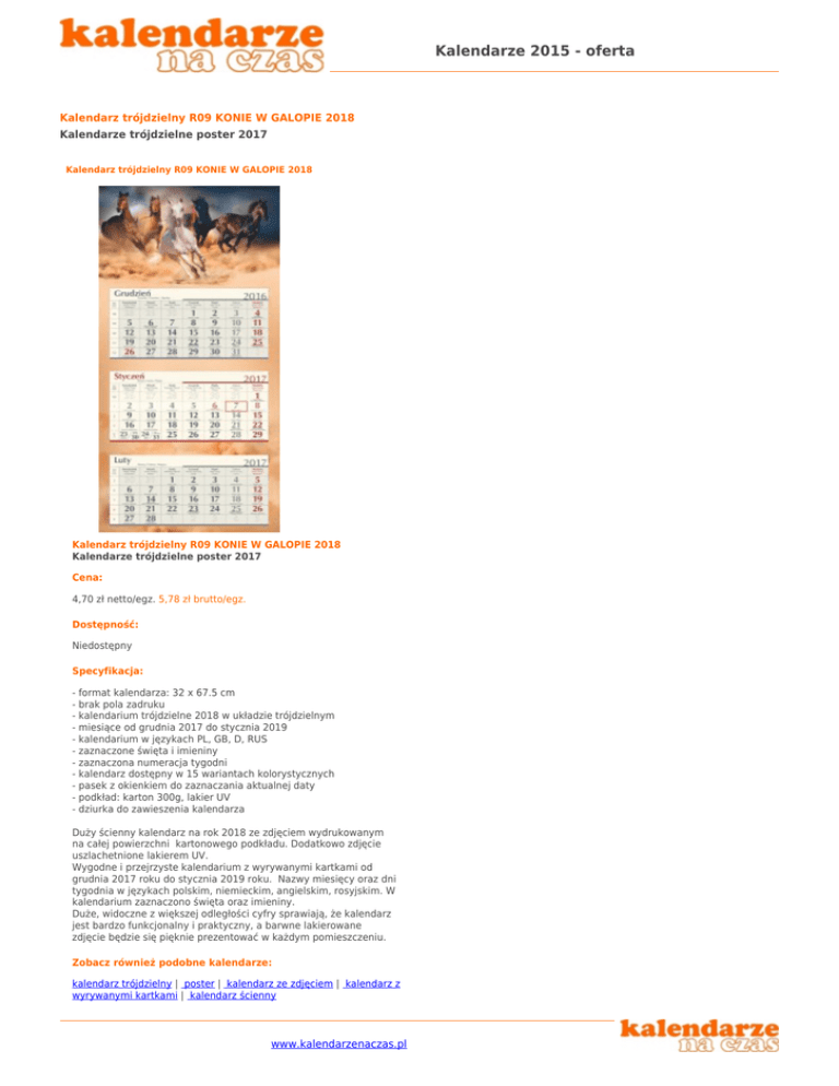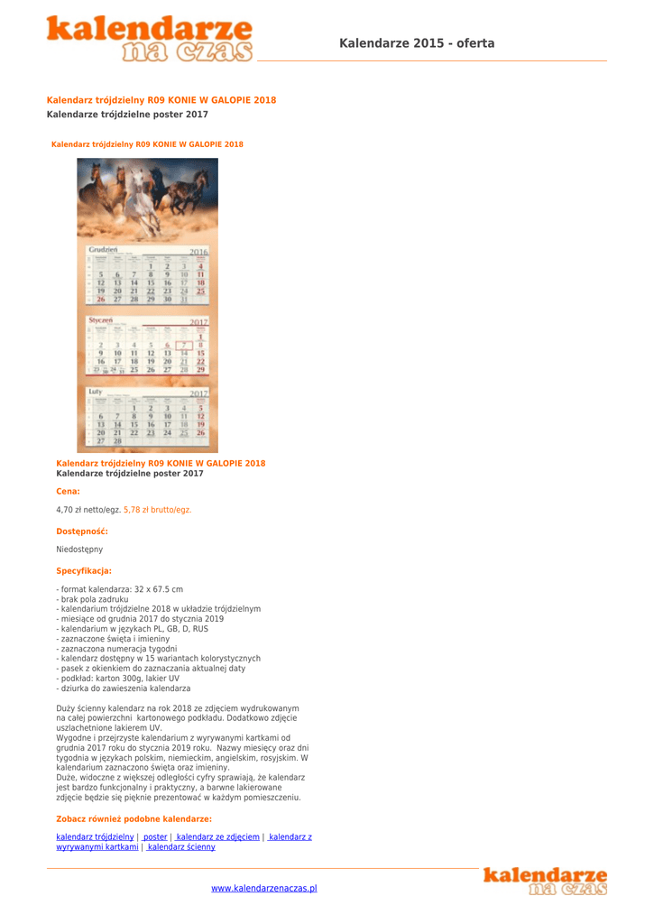 Kalendarz trójdzielny R09 KONIE W GALOPIE 2017