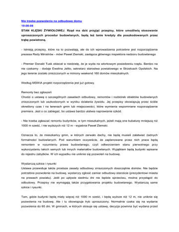 Nie trzeba pozwolenia na odbudowę domu 19-08-08 STAN KLĘSKI śYWIOŁOWEJ. Rząd ma dziś przyjąć przepisy, które umoŜliwią stosowanie uproszczonych procedur budowlanych, będą teŜ tanie kredyty dla poszkodowanych przez trąbę powietrzną. - Istnieją przepisy, które na to pozwalają, ale do ich wprowadzenia potrzebne jest rozporządzenie prezesa Rady Ministrów - mówi Paweł Ziemski, zastępca głównego inspektora nadzoru budowlanego - Premier Donald Tusk obiecał w niedzielę, Ŝe je wyda na wtorkowym posiedzeniu rządu. Bardzo na nie czekamy - dodaje Ewelina Jelito, sekretarz starostwa powiatowego w Strzelcach Opolskich. Na jego terenie zostało zniszczonych w miniony weekend 160 domów mieszkalnych. Według MSWiA projekt rozporządzenia jest juŜ gotowy. Remonty bez zgłoszeń Chodzi o ustawę o szczególnych zasadach odbudowy, remontów i rozbiórek obiektów budowlanych zniszczonych lub uszkodzonych w wyniku działania Ŝywiołu. Jej przepisy obowiązują przez ściśle określony czas i na terenach gmin lub miejscowości, które wymienia wspomniane rozporządzenie premiera. Jest o co zabiegać, bo ustawa bardzo ułatwia naprawianie szkód. - Nie trzeba zgłaszać remontu budynków, w tym mieszkalnych, jeŜeli mają one kubaturę mniejszą niŜ 1000 m sześć, i nie wyŜszych niŜ 12 m - wyjaśnia Paweł Ziemski. Oznacza to, Ŝe mieszkańcy gmin, w których zerwało dachy, nie będą musieli załatwiać Ŝadnych formalności budowlanych. Pod warunkiem oczywiście, Ŝe zaplanowane przez nich prace będą remontem w rozumieniu prawa budowlanego, czyli odtworzeniem stanu pierwotnego przy wykorzystaniu takich samych lub innych materiałów budowlanych. Wyjątkiem będą budynki wpisane do rejestru zabytków. W ich wypadku nie uniknie się pozwoleń na budowę. Wystarczą szkice i rysunki Ustawa przewiduje takŜe prostsze zasady odbudowy zniszczonych doszczętnie domów. Nie będzie potrzebne pozwolenie na budowę, wystarczy zgłosić zamiar odbudowy staroście (prezydentowi miasta na prawach powiatu). Jeśli po upływie siedmiu dni nie będzie sprzeciwu, moŜna przystąpić do odbudowy. Przepisy nie wymagają takŜe przygotowania projektu budowlanego. Wystarczą same szkice i rysunki. Tam, gdzie budynki będą miały więcej niŜ 1000 m sześć, i będą wyŜsze niŜ 12 m, nie uniknie się pozwolenia na budowę. Ale i tu obowiązuje tryb uproszczony. Normalnie czeka się na wydanie pozwolenia do 65 dni. W gminach, w których stosuje się ustawę, decyzja powinna być wydana przed upływem 14 dni. Ma ona teŜ rygor natychmiastowej wykonalności, czyli nie trzeba będzie czekać, aŜ stanie się ostateczna. Preferencyjne kredyty Przy starostach będą tworzone teŜ specjalne zespoły, w którym zasiądą przedstawiciele instytucji nie zbędnych do zaopiniowania projektów budowanych, czyli takich jak np. nadzór budowlany. Rząd zapowiada teŜ wprowadzenie kredytów preferencyjnych dla poszkodowanych na odbudowę i remonty infrastruktury mieszkaniowej i gospodarczej. RóŜnice między realnym oprocentowaniem a spłacanym przez kredytobiorcę pokryje Skarb Państwa. Poszkodowani dostają teŜ zapomogi, zabezpieczono na razie na ten cel 5 min zł. Będą teŜ dotacje celowe dla gmin. Strzelce Opolskie chcą takŜe zwalniać z opłat administracyjnych oraz skarbowych, które się wnosi, załatwiając formalności budowlane. Rzecznik o wsparciu poszkodowanych „Trzeba pilnie wprowadzić na terenie gmin poszkodowanych przez nawałnice przepisy ustawy z 11 sierpnia 2001 r. o szczególnych zasadach odbudowy, remontów i rozbiórek obiektów budowlanych zniszczonych w wyniku działania Ŝywiołu" - pisze do premiera Janusz Kochanowski, rzecznik praw obywatelskich. Pozwoliłoby to na zredukowanie formalności prawnoadministracyjnych przy odbudowie i remontach zniszczonych budynków. Rzecznik popiera utworzenie specjalnego funduszu pomocowego. Ma on wspierać odtwarzanie struktury mieszkalnej i gospodarczej zniszczonej w wyniku nawałnic. Niezbędne będzie dofinansowanie urzędów poszkodowanych gmin, które zostały obarczone dodatkowymi kosztami. Trzeba teŜ opracować system wczesnego ostrzegania oraz informowania o nadchodzących gwałtownych burzach i huraganach. Renata Krupa-Dąbrowska źródło: Rzeczpospolita