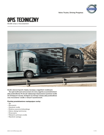 Volvo Trucks. Driving Progress OPIS TECHNICZNY Siodło wraz z mocowaniem Siodło stanowi łącznik między naczepą a ciągnikiem siodłowym. Na ogół siodło jest zamocowane do ramy ciągnika za pośrednictwem płyty podsiodłowej. W celu jak najlepszego dopasowana wysokości siodła do istniejących naczep, dostępne są różnego rodzaju płyty podsiodłowe oraz mocowania i siodła o różnych wysokościach. Poniżej przedstawiono następujące cechy: – Typ – Mocowanie – Wysokość siodła – Średnica sworznia królewskiego – Zakres obsługi technicznej – Smarowanie – Wskaźnik zamknięcia siodła – Wysokość sprzęgu 2014-12-15 POL Version 05 1 (11) OPIS TECHNICZNY Siodło wraz z mocowaniem TYP (warianty przedstawiono czcionką pogrubioną) 5WT-JO8 Siodło żeliwne Jost JSK 37C. Wyposażone w łożysko gumowe. Nadaje się do użytkowania na drogach o złej jakości. Dostępne w wersjach o różnym wzniosie ponad ramą podwozia, zależnie od zastosowanego typu mocowania i wysokości siodła. 5WT-JO9 Siodło żeliwne Jost JSK 42 o małej masie. Łożysko z tworzywa sztucznego, podatne w kierunku wzdłużnym, absorbuje poprzeczne ruchy siodła, chroniąc ramę podwozia. Dostępne w wersjach o różnym wzniosie ponad ramą podwozia, zależnie od zastosowanego typu mocowania i wysokości siodła. 5WT-JO10 Siodło stalowe tłoczone JSK 36 Łożysko przegubowe, podatne w kierunku wzdłużnym, absorbuje poprzeczne ruchy siodła. Dostępne w wersjach o różnym wzniosie ponad ramą podwozia, zależnie od zastosowanego typu mocowania i wysokości siodła. 5WT-JO11 Siodło żeliwne Jost JSK 38G dla dużych obciążeń. Łożysko kardanowe pozwala na wzajemne przemieszczenia naczepy i ciągnika siodłowego podczas jazdy w terenie. Przegub poprzeczny można zablokować na czas jazdy po drodze utwardzonej. Dostosowane do sworznia królewskiego o średnicy 90 mm (3,5''). 5WT-JOHD Siodło żeliwne Jost JSK 38C dla dużych obciążeń. Wyposażone w łożysko gumowe. Nadaje się do użytkowania na drogach o złej jakości. Dostępne w dwóch wersjach: dla sworznia królewskiego o średnicy 50 mm (2'') lub dla sworznia królewskiego o dużej wytrzymałości, o średnicy 90 mm (3,5''). 2014-12-15 POL Version 05 2 (11) OPIS TECHNICZNY Siodło wraz z mocowaniem 5WT-FO14 Siodło stalowe tłoczone Fontaine 150SP2. Mocowane do kątowników, których półki są odgięte na zewnątrz. Mała masa własna. Dostępne w wersjach o różnym wzniosie ponad ramą podwozia, zależnie od zastosowanego typu mocowania i wysokości siodła. 5WT-FO15 Siodło żeliwne Fontaine serii 3000, sterowane pneumatycznie. Dla obciążeń standardowych, użytkowanie w 100% na drogach utwardzonych o dobrej jakości. Wyjątkowo duża powierzchnia styku sworznia królewskiego z płytą siodła (blisko 360° po zamknięciu zamka) zmniejsza zużycie, polepsza właściwości jezdne i zmniejsza podatność zestawu drogowego na przechyły boczne. 5WT-SH Siodło żeliwne SAF-Holland/+GF+ SK-S 36.20. Bezobsługowe łożysko z gumową tuleją. Pasuje do mocowania 5WM-LPRO, zapewniając małą masę własną sprzęgu. Dostępne w wersjach o różnym wzniosie ponad ramą podwozia, zależnie od zastosowanego typu mocowania i wysokości siodła. 5WT-SH2 Siodło żeliwne SAF-Holland/+GF+ SK-HD 38.36 dla dużych obciążeń. Bezobsługowe łożysko z gumową tuleją. Dostępne w dwóch wersjach: dla sworznia królewskiego o średnicy 50 mm (2'') lub dla sworznia królewskiego o dużej wytrzymałości, o średnicy 90 mm (3,5''). 2014-12-15 POL Version 05 3 (11) OPIS TECHNICZNY Siodło wraz z mocowaniem Typ – dane techniczne Wariant Producent Typ 5WT-JOHD 5WT-FO14 5WT-FO15 Jost Jost Fontaine Fontaine JSK 36 JSK 38G JSK 38C 150SP2 3000 5WT-JO8 5WT-JO9 5WT-JO10 5WT-JO11 Jost Jost Jost JSK 37C JSK 42 5WT-SH 5WT-SH2 SAF-Holland SK-S 36.20 SAF-Holland SK-HD 38.36 Wartość D kN 152 152 1521/1352 260 260/170 152 150 152 260/162 Wartość U t 20 20 201/182 36 36/28 20 20 20 36/23 Masa kg (orient.) 150 125 125 275 200 120 120 150 185 50 50 50 90 90/50 50 50 50 90/50 Wyposażenie dodatkowe Wyposażenie dodatkowe – – – – – Wyposażenie dodatkowe – Mały Wyposażenie dodatkowe Wyposażenie dodatkowe – – – – – Wyposażenie dodatkowe – Podstawowy Wyposażenie dodatkowe Wyposażenie dodatkowe Wyposażenie dodatkowe Wyposażenie dodatkowe Wyposażenie dodatkowe Wyposażenie dodatkowe Wyposażenie dodatkowe Wyposażenie dodatkowe Wyposażenie dodatkowe Mechanizm zamka Wyposażenie dodatkowe Wyposażenie dodatkowe – – – – – Wyposażenie dodatkowe – Mechanizm zamka i płyta nośna Wyposażenie dodatkowe Wyposażenie dodatkowe – – – – – – – Średnica sworznia mm królewskiego Wskaźnik zamknięcia siodła Zakres obsługi technicznej Smarowanie 1 Dla mocowań 5WM-ISOL, 5WM-ISOM, 5WM-ASL i 5WM-ASM. 2 Dla mocowania 5WM-LPRO. 2014-12-15 POL Version 05 4 (11) OPIS TECHNICZNY Siodło wraz z mocowaniem MOCOWANIE (warianty przedstawiono czcionką pogrubioną) 5WM-ISOL Płyta podsiodłowa przykręcona do dwóch kątowników o małej wysokości, których półki są odgięte na zewnątrz. Pasuje do wszystkich rodzajów siodeł. Wariant ten nie obejmuje ślizgów najazdowych. 5WM-ISOM Łoże z dwiema poprzecznicami i dwiema płytami wzdłużnymi, przykręcone do dwóch kątowników o średniej wysokości, których półki są odgięte na zewnątrz. Nadaje się do wszystkich zastosowań. Wariant ten nie obejmuje ślizgów najazdowych. 5WM-ISOH Łoże z dwiema poprzecznicami i dwiema płytami wzdłużnymi, przykręcone do dwóch zetowników o dużej wysokości, zamocowanych do podłużnic ramy podwozia, których górne półki są odgięte na zewnątrz. Zoptymalizowane pod kątem pojazdów z tylnym zawieszeniem T-Ride. Wariant ten nie obejmuje ślizgów najazdowych. 5WM-ISHD Łoże składające się z płyty wykonanej z wysokogatunkowej stali i dwóch poprzecznic przykręconych do dwóch zetowników o dużej wyso