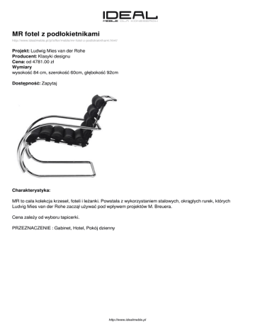 MR fotel z podłokietnikami http://www.idealmeble.pl/pl/offer/meble/mr-fotel-z-podlokietnikami.html/ Projekt: Ludwig Mies van der Rohe Producent: Klasyki designu Cena: od 4781.00 zł Wymiary wysokość 84 cm, szerokość 60cm, głębokość 92cm Dostępność: Zapytaj Charakterystyka: MR to cała kolekcja krzeseł, foteli i leżanki. Powstała z wykorzystaniem stalowych, okrągłych rurek, których Ludvig Mies van der Rohe zaczął używać pod wpływem projektów M. Breuera. Cena zależy od wyboru tapicerki. PRZEZNACZENIE : Gabinet, Hotel, Pokój dzienny http://www.idealmeble.pl http://www.idealmeble.pl Zdjęcia produktu: http://www.idealmeble.pl Powered by TCPDF (www.tcpdf.org)