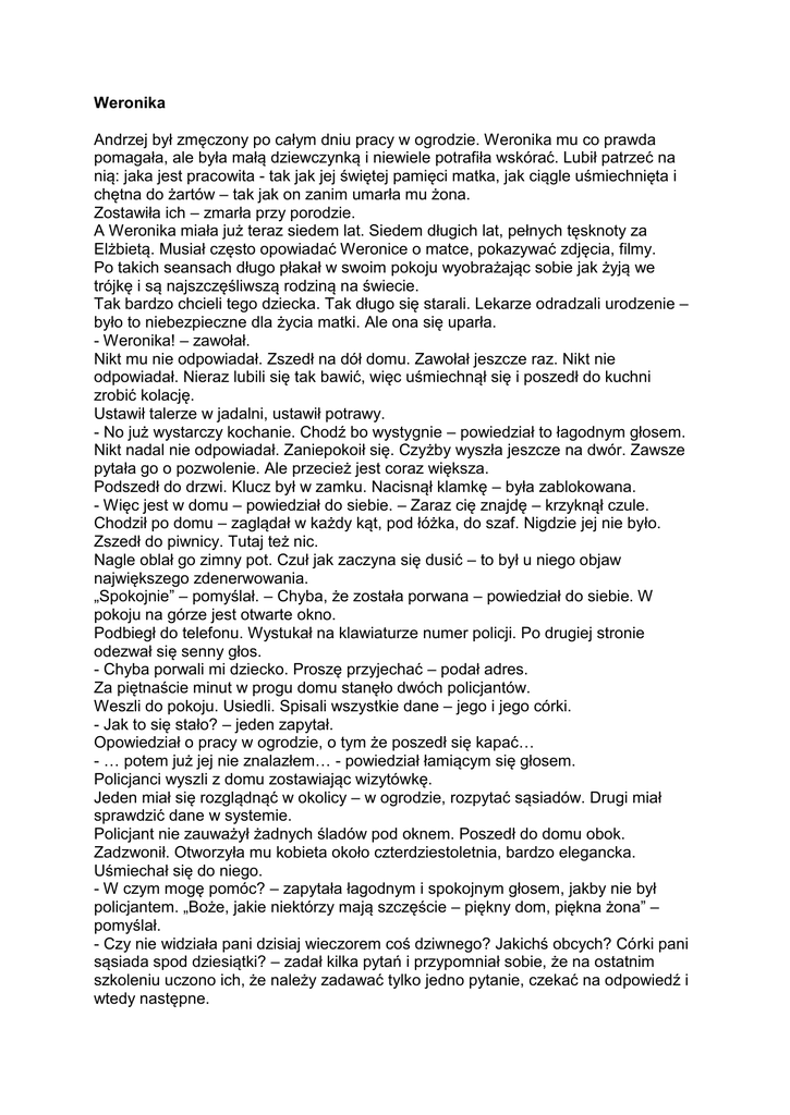 Weronika Andrzej był zmęczony po całym dniu pracy w ogrodzie. Weronika mu co prawda pomagała, ale była małą dziewczynką i niewiele potrafiła wskórać. Lubił patrzeć na nią: jaka jest pracowita - tak jak jej świętej pamięci matka, jak ciągle uśmiechnięta i chętna do żartów – tak jak on zanim umarła mu żona. Zostawiła ich – zmarła przy porodzie. A Weronika miała już teraz siedem lat. Siedem długich lat, pełnych tęsknoty za Elżbietą. Musiał często opowiadać Weronice o matce, pokazywać zdjęcia, filmy. Po takich seansach długo płakał w swoim pokoju wyobrażając sobie jak żyją we trójkę i są najszczęśliwszą rodziną na świecie. Tak bardzo chcieli tego dziecka. Tak długo się starali. Lekarze odradzali urodzenie – było to niebezpieczne dla życia matki. Ale ona się uparła. - Weronika! – zawołał. Nikt mu nie odpowiadał. Zszedł na dół domu. Zawołał jeszcze raz. Nikt nie odpowiadał. Nieraz lubili się tak bawić, więc uśmiechnął się i poszedł do kuchni zrobić kolację. Ustawił talerze w jadalni, ustawił potrawy. - No już wystarczy kochanie. Chodź bo wystygnie – powiedział to łagodnym głosem. Nikt nadal nie odpowiadał. Zaniepokoił się. Czyżby wyszła jeszcze na dwór. Zawsze pytała go o pozwolenie. Ale przecież jest coraz większa. Podszedł do drzwi. Klucz był w zamku. Nacisnął klamkę – była zablokowana. - Więc jest w domu – powiedział do siebie. – Zaraz cię znajdę – krzyknął czule. Chodził po domu – zaglądał w każdy kąt, pod łóżka, do szaf. Nigdzie jej nie było. Zszedł do piwnicy. Tutaj też nic. Nagle oblał go zimny pot. Czuł jak zaczyna się dusić – to był u niego objaw największego zdenerwowania. „Spokojnie” – pomyślał. – Chyba, że została porwana – powiedział do siebie. W pokoju na górze jest otwarte okno. Podbiegł do telefonu. Wystukał na klawiaturze numer policji. Po drugiej stronie odezwał się senny głos. - Chyba porwali mi dziecko. Proszę przyjechać – podał adres. Za piętnaście minut w progu domu stanęło dwóch policjantów. Weszli do pokoju. Usiedli. Spisali wszystkie dane – jego i jego córki. - Jak to się stało? – jeden zapytał. Opowiedział o pracy w ogrodzie, o tym że poszedł się kapać… - … potem już jej nie znalazłem… - powiedział łamiącym się głosem. Policjanci wyszli z domu zostawiając wizytówkę. Jeden miał się rozglądnąć w okolicy – w ogrodzie, rozpytać sąsiadów. Drugi miał sprawdzić dane w systemie. Policjant nie zauważył żadnych śladów pod oknem. Poszedł do domu obok. Zadzwonił. Otworzyła mu kobieta około czterdziestoletnia, bardzo elegancka. Uśmiechał się do niego. - W czym mogę pomóc? – zapytała łagodnym i spokojnym głosem, jakby nie był policjantem. „Boże, jakie niektórzy mają szczęście – piękny dom, piękna żona” – pomyślał. - Czy nie widziała pani dzisiaj wieczorem coś dziwnego? Jakichś obcych? Córki pani sąsiada spod dziesiątki? – zadał kilka pytań i przypomniał sobie, że na ostatnim szkoleniu uczono ich, że należy zadawać tylko jedno pytanie, czekać na odpowiedź i wtedy następne. - Nikogo nie widziałam. Ale… powiedział pan, że córki… sąsiada – była wyraźnie zdziwiona. – Jakiej córki? - Jak to jakiej? Weroniki – był speszony. - Mój sąsiad nie ma córki – powiedziała z pewnością w głosie kobieta. Policjant zadzwonił do kolegi. Usłyszał od niego, że ten sprawdzał w systemie i taka dziewczynka nie istnieje. Roześmiali się obaj. Andrzej siedział w fotelu. Rozmyślał o Elżbiecie. Nagle drzwi do pokoju się uchyliły i stanęła w nich Weronika. - Jesteś na mnie zły, tatusiu? – zaszczebiotała. – Ale dobrze się schowałam, prawda? – zarzuciła mu ręce na szyję. Przytulił ją mocno. - Ale więcej mi tego nie rób – powiedział czule. – Bo mam cię tylko jedną.