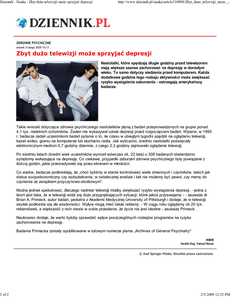 Dziennik - Nauka - Zbyt dużo telewizji może sprzyjać depresji 1 of 2 http://www.dziennik.pl/nauka/article310898/Zbyt_duzo_telewizji_moze_... ZDROWIE PSYCHICZNE wtorek 3 lutego 2009 15:17 Zbyt dużo telewizji może sprzyjać depresji Nastolatki, które spędzają długie godziny przed telewizorem mają większe szanse zachorować na depresję w dorosłym wieku. To samo dotyczy siedzenia przed komputerem. Każda dodatkowa godzina tego rodzaju aktywności może zwiększać ryzyko wystąpienia zaburzenia - ostrzegają amerykańscy badacze. Takie wnioski dotyczące zdrowia psychicznego nastolatków płyną z badań przeprowadzonych na grupie ponad 4,1 tys. nieletnich ochotników. Żaden nie wykazywał oznak depresji przed rozpoczęciem badań. Wpierw, w 1995 r. badacze zadali uczestnikom badań pytanie o to, ile czasu w ubiegłym tygodni spędzili na oglądaniu telewizji, kaset wideo, graniu na komputerze lub słuchaniu radia. Jak wyliczono, średnio nastolatki poświęcały elektronicznym mediom 5,7 godziny dziennie, z czego 2,3 godziny zajmowało oglądanie telewizji. Po siedmiu latach (średni wiek uczestników wynosił wówczas ok. 22 lata) u 308 badanych stwierdzono symptomy wskazujące na depresję. Co ciekawe, przypadki zaburzeń zdrowia psychicznego były powiązane z ilością godzin, jakie przesiadywało się przez ekranem w młodości. Co ważne, badacze podkreślają, że „choć byliśmy w stanie kontrolować wiele zmiennych i czynników, takich jak status socjoekonomiczny czy wykształcenie, w ostatecznej analizie i tak nie możemy być pewni, czy mamy do czynienia ze związkiem przyczynowo-skutkowym". Można jednak spekulować, dlaczego nadmiar telewizji miałby zwiększać ryzyko wystąpienia depresji. - jedna z teorii jest taka, że w telewizji widzi się dużo przygnębiających sytuacji, które jakoś przyswajamy - - zauważa dr Brian A. Primack, autor badań, pediatra z Akademii Medycznej University of Pittsburgh i dodaje, że w telewizji zwykle podkreśla się złe wiadomości. Wpływ mogą mieć także reklamy. - W ciągu roku oglądamy ok 20 tys. reklamówek, a większość z nich niesie w sobie przesłanie, że życie nie jest idealne - zauważa Primack. Naukowiec dodaje, że warto byłoby sprawdzić wpływ poszczególnych rodzajów programów na ryzyko zachorowania na depresję. Badania Primacka zostały opublikowane w lutowym numerze pisma „Archives of General Psychiatry" mint Health Day, Yahoo! News © Axel Springer Polska. Wszelkie prawa zastrzeżone. 2/5/2009 12:23 PM Dziennik - Nauka - Zbyt dużo telewizji może sprzyjać depresji 2 of 2 http://www.dziennik.pl/nauka/article310898/Zbyt_duzo_telewizji_moze_... http://www.dziennik.pl/nauka/310898.html 2/5/2009 12:23 PM