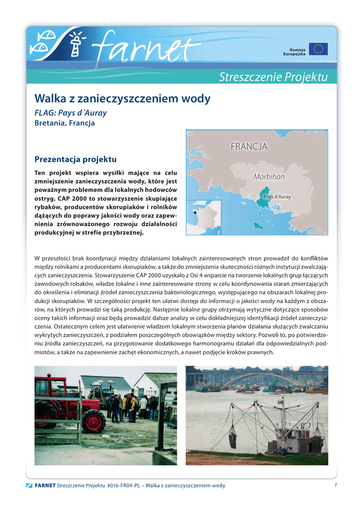 Komisja Europejska Streszczenie Projektu Walka z zanieczyszczeniem wody FLAG: Pays d´Auray Bretania, Francja Francja Prezentacja projektu Ten projekt wspiera wysiłki mające na celu zmniejszenie zanieczyszczenia wody, które jest poważnym problemem dla lokalnych hodowców ostryg. CAP 2000 to stowarzyszenie skupiające rybaków, producentów skorupiaków i rolników dążących do poprawy jakości wody oraz zapewnienia zrównoważonego rozwoju działalności produkcyjnej w strefie przybrzeżnej. Morbihan Pays d’Auray W przeszłości brak koordynacji między działaniami lokalnych zainteresowanych stron prowadził do konfliktów między rolnikami a producentami skorupiaków, a także do zmniejszenia skuteczności różnych instytucji zwalczających zanieczyszczenia. Stowarzyszenie CAP 2000 uzyskało z Osi 4 wsparcie na tworzenie lokalnych grup łączących zawodowych robaków, władze lokalne i inne zainteresowane strony w celu koordynowania starań zmierzających do określenia i eliminacji źródeł zanieczyszczenia bakteriologicznego, występującego na obszarach lokalnej produkcji skorupiaków. W szczególności projekt ten ułatwi dostęp do informacji o jakości wody na każdym z obszarów, na których prowadzi się taką produkcję. Następnie lokalne grupy otrzymają wytyczne dotyczące sposobów oceny takich informacji oraz będą prowadzić dalsze analizy w celu dokładniejszej identyfikacji źródeł zanieczyszczenia. Ostatecznym celem jest ułatwienie władzom lokalnym stworzenia planów działania służących zwalczaniu wykrytych zanieczyszczeń, z podziałem poszczególnych obowiązków między sektory. Pozwoli to, po potwierdzeniu źródła zanieczyszczeń, na przygotowanie dodatkowego harmonogramu działań dla odpowiedzialnych podmiotów, a także na zapewnienie zachęt ekonomicznych, a nawet podjęcie kroków prawnych. FARNET Streszczenie Projektu #016-FR04-PL – Walka z zanieczyszczeniem wody 1 Najważniejsze doświadczenia >> Zbieżność z tematami FARNET: Ochrona środowiska i współpraca/koordynacja między sektorem rybackim a innymi lokalnymi publicznymi i prywatnymi zainteresowanymi stronami. >> Wyniki: Jest jeszcze zbyt wcześnie, aby móc mówić o wynikach w ograniczeniu zanieczyszczenia bakteriologicznego. Można już jednak dostrzec wśród lokalnych zainteresowanych stron głębsze zrozumienie przyczyn zanieczyszczenia środowiska w tym obszarze, a także coraz większą wśród rybaków świadomość roli, jaką mogą odegrać w zakresie identyfikacji i ograniczania takich zanieczyszczeń. Co bardzo ważne, dzięki temu projektowi rybaków zaczęto traktować na równi z innymi lokalnymi podmiotami, w tym z organami publicznymi, tradycyjnie zaangażowanymi w walkę z zanieczyszczeniami, a ponadto uwidacznia on wartość (zarówno dla sektora rybackiego, jak i sektora publicznego) lepszej komunikacji, współpracy i wspólnego rozwiązywania problemów. >> Możliwość przenoszenia doświadczeń w inne warunki: Kwestie jakości wody są istotne dla wielu rejonów związanych z rybołówstwem w całej Europie. Ten projekt stanowi wzór dla rejonów cierpiących wskutek zanieczyszczenia wody, a w szczególności obszarów, w których pod względem odpowiedzialności za ocenę jakości wody brakuje systematycznej koordynacji i zaangażowania zainteresowanych stron. >> Komentarz końcowy: W ramach tego projektu udało się zmobilizować międzysektorowe partnerstwo nacechowane poczuciem solidarności i gotowością do zmiany utartych i nieskoordynowanych praktyk roboczych. Łączny koszt i wkład EFR >> >> >> >> Łączny koszt projektu: 14 400 € Oś 4 z EFR: 7 200 € Współfinansowanie krajowe: 3 200 € Inne/Prywatne: 3 200 € (1 600 € Région Bretagne, 1 600 € Conseil Général du Morbihan) Informacje o projekcie Tytuł: Walka z zanieczyszczeniem wody Czas trwania: W toku od kwietnia 2011 r. Data przygotowania studium przypadku: Grudzień 2011 r. Promotor projektu Stowarzyszenie CAP 2000 Pierre-Yves Roussel [email protected] +33 2 97 40 34 66 www.cap2000.jimdo.com Informacje dotyczące FLAG Pays d´Auray, Francja [email protected] +33 2 97 56 41 74 www.pays-auray.com Opis FLAG Wydawca: Komisja Europejska, Dyrekcja Generalna ds. Gospodarki Morskiej i Rybołówstwa, Dyrektor Generalny. Zastrzeżenie: Dyrekcja Generalna ds. Gospodarki Morskiej i Rybołówstwa odpowiada za całościowe wydanie niniejszego dokumentu, jednak nie odpowiada za jego treść ani nie gwarantuje poprawności danych. FARNET Streszczenie Projektu #016-FR04-PL – Walka z zanieczyszczeniem wody 2