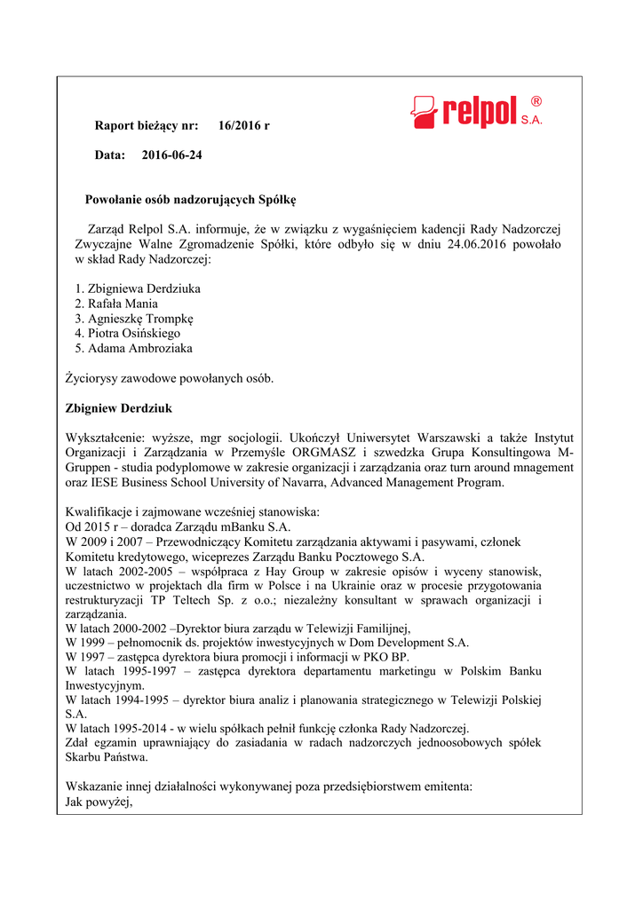 Raport bieżący nr: Data: 16/2016 r 2016-06-24 Powołanie osób nadzorujących Spółkę Zarząd Relpol S.A. informuje, że w związku z wygaśnięciem kadencji Rady Nadzorczej Zwyczajne Walne Zgromadzenie Spółki, które odbyło się w dniu 24.06.2016 powołało w skład Rady Nadzorczej: 1. Zbigniewa Derdziuka 2. Rafała Mania 3. Agnieszkę Trompkę 4. Piotra Osińskiego 5. Adama Ambroziaka Życiorysy zawodowe powołanych osób. Zbigniew Derdziuk Wykształcenie: wyższe, mgr socjologii. Ukończył Uniwersytet Warszawski a także Instytut Organizacji i Zarządzania w Przemyśle ORGMASZ i szwedzka Grupa Konsultingowa MGruppen - studia podyplomowe w zakresie organizacji i zarządzania oraz turn around mnagement oraz IESE Business School University of Navarra, Advanced Management Program. Kwalifikacje i zajmowane wcześniej stanowiska: Od 2015 r – doradca Zarządu mBanku S.A. W 2009 i 2007 – Przewodniczący Komitetu zarządzania aktywami i pasywami, członek Komitetu kredytowego, wiceprezes Zarządu Banku Pocztowego S.A. W latach 2002-2005 – współpraca z Hay Group w zakresie opisów i wyceny stanowisk, uczestnictwo w projektach dla firm w Polsce i na Ukrainie oraz w procesie przygotowania restrukturyzacji TP Teltech Sp. z o.o.; niezależny konsultant w sprawach organizacji i zarządzania. W latach 2000-2002 –Dyrektor biura zarządu w Telewizji Familijnej, W 1999 – pełnomocnik ds. projektów inwestycyjnych w Dom Development S.A. W 1997 – zastępca dyrektora biura promocji i informacji w PKO BP. W latach 1995-1997 – zastępca dyrektora departamentu marketingu w Polskim Banku Inwestycyjnym. W latach 1994-1995 – dyrektor biura analiz i planowania strategicznego w Telewizji Polskiej S.A. W latach 1995-2014 - w wielu spółkach pełnił funkcję członka Rady Nadzorczej. Zdał egzamin uprawniający do zasiadania w radach nadzorczych jednoosobowych spółek Skarbu Państwa. Wskazanie innej działalności wykonywanej poza przedsiębiorstwem emitenta: Jak powyżej, Nie uczestniczy w spółce lub innej osobie prawnej, która prowadzi działalność konkurencyjną w stosunku do Relpol S.A. jako wspólnik lub członek organów. Nie figuruje w Rejestrze Dłużników prowadzonym na podstawie ustawy o Krajowym Rejestrze Sądowym. Rafał Mania Wykształcenie: wyższe, inżynier geodezji. Posiada tytuł MBA University of Montreal, ukończył również AMP na IESE Business School. Kwalifikacje i zajmowane wcześniej stanowiska: Od 2008 i obecnie udziałowiec spółek Estate Fellows oraz Altus TFI S.A., gdzie pełni funkcje członka Rady Nadzorczej. W latach 2008 – 2009 był Prezesem Zarządu spółek zarządzanych przez NFI Progress S.A., najpierw Supernova Management Sp. z o.o., a następnie Equity Fellows Sp. z o.o. W latach 2003 – 2007 był Prezesem Zarządu BPH TFI S.A. W latach 2001 – 2003 pracował w F&C w Londynie jako dyrektor odpowiedzialny za integrację przejmowanych podmiotów. W latach 2000 – 2001 był Członkiem Zarządu PZU S.A. odpowiedzialnym za zarządzanie aktywami. Rafał Mania był również Dyrektorem Zarządzającym w PKO BP S.A. W latach 1999-2000 był Dyrektorem Departamentu Nadzoru i Prywatyzacji w Ministerstwie Skarbu Państwa. W latach 1998 – 1999 był Członkiem Zarządu i Dyrektorem ds. inwestycji w PTE Razem. W latach 1995 – 1998 był zastępcą Dyrektora Zarządzania Aktywami w CDM Pekao S.A. Wcześniej zatrudniony był w BIG Domu Maklerskim na stanowisku zarządzającego. Posiada tytuł CFA, licencję doradcy inwestycyjnego oraz maklera papierów wartościowych. Był członkiem Zarządu Związku Maklerów i Doradców. Od początku do chwili obecnej zasiada w Zarządzie CFA Society of Poland. Wskazanie innej działalności wykonywanej poza przedsiębiorstwem emitenta: Jak powyżej, Nie uczestniczy w spółce lub innej osobie prawnej, która prowadzi działalność konkurencyjną w stosunku do Relpol S.A. jako wspólnik lub członek organów. Nie figuruje w Rejestrze Dłużników prowadzonym na podstawie ustawy o Krajowym Rejestrze Sądowym. Agnieszka Trompka Wykształcenie: wyższe. Ukończona Akademia Humanistyczna w Pułtusku, wydział Administracji. Studia podyplomowe z rachunkowości i finansów przedsiębiorstwa w Szkole Głównej Handlowej. Kwalifikacje i zajmowane wcześniej stanowiska: od 2013- obecnie- główna księgowa PW SEA Adam Ambroziak W latach 2011 do 2013- główna księgowa w RRC Poland Sp. z o.o. W latach 2004 do 2013- główna księgowa w Detalia Sp. z o.o. W latach 2003 do 2004- główna księgowa w Konsant Sp. z o.o. W latach 1997 do 2003- główna księgowa w Kwapisz i S-ka Sp. z o.o. W latach 1995 do 1997- księgowa w Szkole Biznesu i Języków Obcych W latach 1994 do 1995- księgowa w TB Europol Wskazanie innej działalności wykonywanej poza przedsiębiorstwem emitenta: brak Nie uczestniczy w spółce lub innej osobie prawnej, która prowadzi działalność konkurencyjną w stosunku do Relpol S.A. jako wspólnik lub członek organów. Nie figuruje w Rejestrze Dłużników prowadzonym na podstawie ustawy o Krajowym Rejestrze Sądowym. Piotr Osiński Wykształcenie: wyższe, licencjat z ekonomii w Wyższej Szkole EkonomicznoInformatycznej w Warszawie, kierunek ekonomia, specjalizacja bankowość komercyjna. Kwalifikacje i zajmowane wcześniej stanowiska: Od kwietnia 2012 roku do chwili obecnej w Przedsiębiorstwie Wielobranżowym SEA w Piasecznie, handlowiec, pozyskiwanie nowych klientów kluczowych, obsługa klientów strategicznych. Wskazanie innej działalności wykonywanej poza przedsiębiorstwem emitenta: brak Nie uczestniczy w spółce lub innej osobie prawnej, która prowadzi działalność konkurencyjną w stosunku do Relpol S.A. jako wspólnik lub członek organów. Nie figuruje w Rejestrze Dłużników prowadzonym na podstawie ustawy o Krajowym Rejestrze Sądowym. Adam Ambroziak Wykształcenie: średnie. Kwalifikacje i zajmowane wcześniej stanowiska: Od 2000 r. i obecnie – Unia Hurtowni Elektrycznych El- Pl