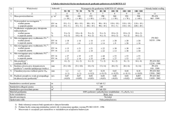 1.Tabela właściwości fizyko-mechanicznych geotkanin poliestrowych KORTEX GT Lp. Właściwości 1 1. 2 Masa powierzchniowa 2. Wytrzymałość na rozciąganie 1) : - wzdłuż pasma - w poprzek pasma Wydłużenie względne przy obciążeniu maksymalnym : - wzdłuż pasma - w poprzek pasma Siła rozciągająca przy wydłużeniu 2% 2) : - wzdłuż pasma - w poprzek pasma Siła rozciągająca przy wydłużeniu 3% 2) : - wzdłuż pasma - w poprzek pasma Siła rozciągająca przy wydłużeniu 5%2) : - wzdłuż pasma - w poprzek pasma Siła przebicia1) : ( metoda CBR ) Średnica otworu przy dynamicznym przebiciu1) ( metoda spadajacego stożka ) Charakterystyczna wielkość porów O90 3. 4. 5. 6. 7. 8. 9. Jednostki Wymagania dla geotkaniny KORTEX GT odmian : 70 / 30 70 / 70 80 / 80 100 / 50 100 / 100 5 6 7 8 9 180 235 290 260 350 ( ± 40 ) ( ± 40 ) ( ± 45 ) ( ± 50 ) ( ± 70 ) Metody badań według 3 g / m2 50 / 50 4 190 ( ± 30 ) kN / m kN / m 55 (- 5 ) 55 (- 5 ) 80 (- 10 ) 35 (- 5 ) 80 (- 10 ) 80 (- 10 ) 90 (- 10 ) 90 (- 10 ) 110 (- 10 ) 55 (- 5 ) 110 (- 10 ) 110 (- 10 ) 110 (- 10 ) 220 (- 20 ) % % 9 (± 3) 9 (± 3) 10 (± 4) 10 (± 4) 9 (± 2) 9 (± 2) 9 (± 3) 9 (± 3) 10 (± 2) 10 (± 2) 10 (± 2) 9 (± 2) 10 (± 2) 10 (± 2) kN / m kN / m ≥ 10 ≥9 ≥ 14 ≥6 ≥ 14 ≥ 13 ≥ 15 ≥ 14 ≥ 20 ≥9 ≥ 20 ≥ 20 ≥ 20 ≥ 16 kN / m kN / m ≥ 15 ≥ 13 ≥ 21 ≥8 ≥ 21 ≥ 19 ≥ 22 ≥ 22 ≥ 30 ≥ 13 ≥ 30 ≥ 30 ≥ 30 ≥ 30 kN / m kN / m kN ≥ 27 ≥ 27 4 (- 2) ≥ 35 ≥ 14 4 (- 2) ≥ 35 ≥ 35 6 (- 2) ≥ 40 ≥ 40 7 (- 2) ≥ 53 ≥ 27 6 (- 2) ≥ 53 ≥ 53 8 (- 3) ≥ 53 ≥ 53 14 (- 4) mm 25 (+10) 25 (+10) 18 (+5) 15 (+4) 20 (+5) 20 (+4) 8 (+4) mm 1,3 (± 1) 0,07 (-0,03) 1,3 (± 1) 0,07 (-0,05) 0,5 (± 0,2) 0,08 (-0,03) 0,38 (± 0,15) 0,08 (-0,03) 0,65 (± 0,25) 0,08 (-0,03) 0,44 (± 0,11) 0,04 (-0,02) 0,10 (± 0,05) 0,007 (-0,002) 10. Prędkość przepływu wody prostopadłego do płaszczyzny geotkaniny1) m/s Standardowa szerokość pasma m Standardowa długość pasma Standardowa powierzchnia pasma Materiał geotkaniny Kolor standardowy Sposób nawinięcia Opakowanie rolki m m2 4,5 lub 5,2 100 450 lub 520 100% poliester ( polyethylene terephthalate - /C10 H8 O4 / n ) Biały, inny Na tuleji Folia polietylenowa 1) Brak tolerancji oznacza brak ograniczeń w danym kierunku 2) Podane liczby oznaczają minimalną wartość siły wyznaczonej zgodnie z normą PN ISO 10319 : 1996 * Mocowanie w szczękach jest niemożliwe w standardowym urządzeniu badawczym 100 / 200 10 590 ( ± 60 ) 11 PN-EN 965 : 1999 PN ISO 10319 : 1996 PN-EN ISO 12236 : 1998 PN-EN 918 : 1999 PN-EN ISO 12956 : 2002 PN-EN ISO 11058 : 2002 2.Tabela właściwości fizyko-mechanicznych geotkanin poliestrowych KORTEX GT Lp. Właściwości 1 1. 2 Masa powierzchniowa 2. Wytrzymałość na rozciąganie 1) : - wzdłuż pasma - w poprzek pasma Wydłużenie względne przy obciążeniu maksymalnym : - wzdłuż pasma - w poprzek pasma Siła rozciągająca przy wydłużeniu 2% 2) : - wzdłuż pasma - w poprzek pasma Siła rozciągająca przy wydłużeniu 3% 2) : - wzdłuż pasma - w poprzek pasma Siła rozciągająca przy wydłużeniu 5%2) : - wzdłuż pasma - w poprzek pasma Siła przebicia1) : ( metoda CBR ) Średnica otworu przy dynamicznym przebiciu1) ( metoda spadajacego stożka ) Charakterystyczna wielkość porów O90 3. 4. 5. 6. 7. 8. 9. Jednostki 3 g / m2 100 / 300 4 680 ( ± 70 ) Wymagania dla geotkaniny KORTEX GT odmian : 100 / 400 120 / 120 150 / 50 150 / 150 200 / 50 5 6 7 8 9 1170 390 340 500 450 ( ± 120 ) ( ± 70 ) ( ± 75 ) ( ± 100 ) ( ± 90 ) 200 / 200 10 770 ( ± 100 ) kN / m kN / m 110 (- 10 ) 330 (-30 ) 110 (- 10 ) 440 (- 40 ) 130 (- 10 ) 130 (- 10 ) 160 (- 10 ) 55 (- 5 ) 160 (- 10 ) 160 (- 10 ) 220 (- 20 ) 55 (- 5 ) 220 (- 20 ) 220 (- 20 ) 10 (± 3) 10 (± 3) 10 (± 3 ) 10 (± 3 ) 10 (± 2) 10 (± 3) 11 (± 3) 10 (± 2) 10 (± 2) 10 (± 2) 10 (± 2,5) 10 (± 2,5) 10 (± 3) 10 (± 3) kN / m kN / m ≥ 20 ≥ 35 ≥ 20 ≥ 40 ≥ 18 ≥ 18 ≥ 32 ≥ 11 ≥ 26 ≥ 25 ≥ 35 ≥9 ≥ 35 ≥ 35 kN / m kN / m ≥ 30 ≥ 60 ≥ 30 ≥ 70 ≥ 28 ≥ 28 ≥ 50 ≥ 17 ≥ 38 ≥ 38 ≥ 55 ≥ 14 ≥ 55 ≥ 55 kN / m kN / m kN ≥ 53 ≥ 100 12 (- 5) ≥ 53 ≥ 130 18 (- 6) ≥ 60 ≥ 60 10 (-4) ≥ 93 ≥ 27 7 (-2) ≥ 73 ≥ 72 16 (-5) ≥ 100 ≥ 26 11 (-3) ≥ 90 ≥ 90 17 (-5) mm 15 (+5) 17 (+6) 10 (+8) 27 (+7) 12(+3) 13 (+7) 10 (+5) mm 0,2 (± 0,1) 0,02 (-0,01) 0,20 (± 0,1) 0,006 (-0,003) 0,6 (± 0,3) 0,05 (-0,02) 0,8 (± 0,3) 0,04 (-0,02) 0,4 (± 0,2) 0,02 (-0,01) 0,4 (± 0,2) 0,04 (-0,02) 0,46 (± 0,13) 0,02 (-0,01) % % 10. Prędkość przepływu wody prostopadłego do płaszczyzny geotkaniny1) m/s Standardowa szerokość pasma m Standardowa długość pasma Standardowa powierzchnia pasma Materiał geotkaniny Kolor standardowy Sposób nawinięcia Opakowanie rolki m m2 4,5 lub 5,2 100 450 lub 520 100% poliester ( polyethylene terephthalate - /C10 H8 O4 / n ) Biały, inny Na tuleji Folia polietylenowa 1) Brak tolerancji oznacza brak ograniczeń w danym kierunku 2) Podane liczby oznaczają minimalną wartość siły wyznaczonej zgodnie z normą PN ISO 10319 : 1996 * Mocowanie w szczękach jest niemożliwe w standardowym urządzeniu badawczym Metody badań według 11 PN-EN 965 : 1999 PN ISO 10319 : 1996 PN-EN ISO 12236 : 1998 PN-EN 918 : 1999 PN-EN ISO 12956 : 2002 PN-EN ISO 11058 : 2002 3.Tabela właściwości fizyko-mechanicznych geotkanin poliestrowych KORTEX GT Lp. Właściwości 1 1. 2 Masa powierzchniowa 2. Wytrzymałość na rozciąganie 1) : - wzdłuż pasma - w poprzek pasma Wydłużenie względne przy obciążeniu maksymalnym : - wzdłuż pasma - w poprzek pasma Siła rozciągająca przy wydłużeniu 2% 2) : - wzdłuż pasma - w poprzek pasma Siła rozciągająca przy wydłużeniu 3% 2) : - wzdłuż pasma - w poprzek pasma Siła rozciągająca przy wydłużeniu 5%2) : - wzdłuż pasma - w poprzek pasma Siła przebicia1) : ( metoda CBR ) Średnica otworu przy dynamicznym przebiciu1) ( metoda