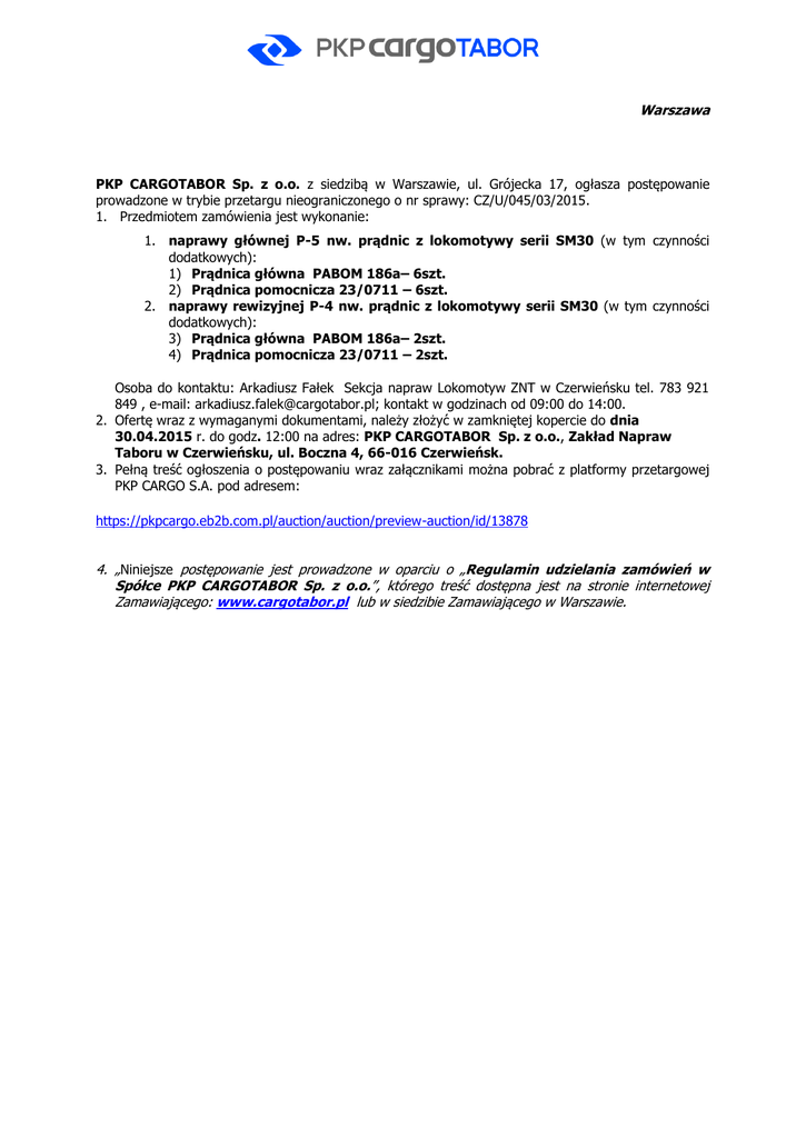 Warszawa PKP CARGOTABOR Sp. z o.o. z siedzibą w Warszawie, ul. Grójecka 17, ogłasza postępowanie prowadzone w trybie przetargu nieograniczonego o nr sprawy: CZ/U/045/03/2015. 1. Przedmiotem zamówienia jest wykonanie: 1. naprawy głównej P-5 nw. prądnic z lokomotywy serii SM30 (w tym czynności dodatkowych): 1) Prądnica główna PABOM 186a– 6szt. 2) Prądnica pomocnicza 23/0711 – 6szt. 2. naprawy rewizyjnej P-4 nw. prądnic z lokomotywy serii SM30 (w tym czynności dodatkowych): 3) Prądnica główna PABOM 186a– 2szt. 4) Prądnica pomocnicza 23/0711 – 2szt. Osoba do kontaktu: Arkadiusz Fałek Sekcja napraw Lokomotyw ZNT w Czerwieńsku tel. 783 921 849 , e-mail: [email protected]; kontakt w godzinach od 09:00 do 14:00. 2. Ofertę wraz z wymaganymi dokumentami, należy złożyć w zamkniętej kopercie do dnia 30.04.2015 r. do godz. 12:00 na adres: PKP CARGOTABOR Sp. z o.o., Zakład Napraw Taboru w Czerwieńsku, ul. Boczna 4, 66-016 Czerwieńsk. 3. Pełną treść ogłoszenia o postępowaniu wraz załącznikami można pobrać z platformy przetargowej PKP CARGO S.A. pod adresem: https://pkpcargo.eb2b.com.pl/auction/auction/preview-auction/id/13878 4. „Niniejsze postępowanie jest prowadzone w oparciu o „Regulamin udzielania zamówień w Spółce PKP CARGOTABOR Sp. z o.o.”, którego treść dostępna jest na stronie internetowej Zamawiającego: www.cargotabor.pl lub w siedzibie Zamawiającego w Warszawie.