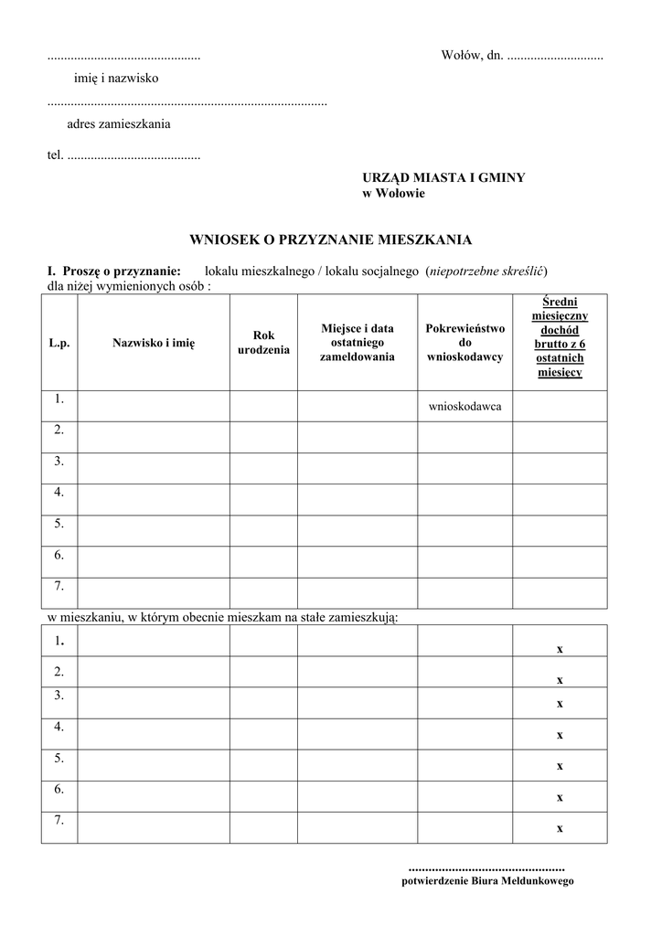 .............................................. Wołów, dn. ............................. imię i nazwisko .................................................................................... adres zamieszkania tel. ........................................ URZĄD MIASTA I GMINY w Wołowie WNIOSEK O PRZYZNANIE MIESZKANIA I. Proszę o przyznanie: lokalu mieszkalnego / lokalu socjalnego (niepotrzebne skreślić) dla niŜej wymienionych osób : L.p. Nazwisko i imię Rok urodzenia Miejsce i data ostatniego zameldowania 1. Pokrewieństwo do wnioskodawcy Średni miesięczny dochód brutto z 6 ostatnich miesięcy wnioskodawca 2. 3. 4. 5. 6. 7. w mieszkaniu, w którym obecnie mieszkam na stałe zamieszkują: 1. 2. 3. 4. 5. 6. 7. x x x x x x x ............................................... potwierdzenie Biura Meldunkowego Prośbę swoją motywuję następująco (proszę opisać sytuację mieszkaniową, rodzinną, materialną) : ............................................................................................................................................................................................................ ............................................................................................................................................................................................................ ............................................................................................................................................................................................................ ............................................................................................................................................................................................................ ............................................................................................................................................................................................................ ............................................................................................................................................................................................................ ............................................................................................................................................................................................................ ............................................................................................................................................................................................................ ............................................................................................................................................................................................................ ............................................................................................................................................................................................................ ............................................................................................................................................................................................................ ............................................................................................................................................................................................................ *Jednocześnie informuję, Ŝe najemcą / właścicielem*) mieszkania (domu), w którym mieszkam jest Pan/i .................................................................., zamieszkały/a w ......................................................................................... Uprzedzony/a o odpowiedzialności karnej wynikającej z art.233 § 1 Kodeksu karnego (ustawa z dnia 6 czerwca 1997r. - Kodeks karny Dz.U. z 1997r. Nr 88, poz.553 ze zm.) o ś w i a d c z a m, Ŝe wyszczególnione we wniosku osoby nie posiadają tytułów prawnych do innych lokali lub domów oraz, Ŝe wszystkie zamieszczone dane są zgodne z prawdą. .......................................................... czytelny podpis wnioskodawcy II. Wypełnia administrator budynku lub właściciel lokalu, w którym mieszka wnioskodawca Mieszkanie, w którym mieszka wnioskodawca, o pow. uŜytkowej …….. połoŜone jest w budynku mieszkalnym / niemieszkalnym / przeznaczonym do rozbiórki*) i składa się z ........ pokoi o powierzchni kaŜdego pokoju : 1 - ......... m2, 2 - ..........m2, 3 - .............m2, 4- .............m2, 5- ...........m2, oraz kuchni, łazienki, wc *) Ponadto potwierdzam zgodność danych dotyczących warunków zamieszkiwania wnioskodawcy ubiegającego się o przydział mieszkania komunalnego. Potwierdzenie administratora albo właściciela lokalu/domu .................................................... data i podpis (pieczęć) III. Wypełnia Komisja Mieszkaniowa : 1. Powierzchnia mieszkalna ......... m2 - przypadająca na 1 członka rodziny ..............m2. 2. Razem miesięczne dochody brutto ..................... zł., z czego na 1 członka rodziny przypada ................ zł. 3. Posiadanie tytułu prawnego do innego lokalu lub domu ............. Opinia Komisji ............................................................................................................................................. ....................................................................................................................................................................... *) – niepotrzebne skreślić