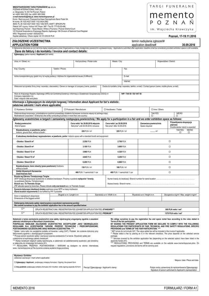 MIĘDZYNARODOWE TARGI POZNAŃSKIE sp. z o. o. POZNAŃ INTERNATIONAL FAIR Ltd. ul. Głogowska 14, 60-734 Poznań, Poland tel +48/61 869 2000; fax +48/61 869 2999 e-mail:[email protected]; www.mementopoznan.pl Konto / Bank account: Powszechna Kasa Oszczędności Bank Polski SA Nr konta: 38 1020 4027 0000 1102 0424 2962 IBAN: PL 46 1020 4027 0000 1402 1092 9075, SWIFT: BPKOPLPW Płatnik VAT czynny / Active VAT Payer, NIP / Tax ID: 777-00-00-488 Sąd Rejonowy Poznań – Nowe Miasto i Wilda w Poznaniu / Poznan District Court VIII Wydział Gospodarczy Krajowego Rejestru Sądowego / 8th Division of National Court Register KRS / Registered number: 0000202703 Kapitał zakładowy / Share capital: 42 310 200,00 PLN Poznań, 17-19.11.2016 ZGŁOSZENIE UCZESTNICTWA APPLICATION FORM termin nadsyłania zgłoszeń# application deadline# 30.09.2016 # Zgłoszenia dokonane po tym terminie będą rozpatrywane przez Organizatora w miarę dostępności powierzchni wystawienniczej. / Applications submitted after application deadline shall be considered provided exhibition space is still available. Dane do faktury i do kontaktu / Invoice and contact details: Zgłaszający (pełna nazwa) / Applicant (full name): Ulica, nr / Street, no.: Kod pocztowy / Postal code: Kraj / Country: Miasto / City: Telefon / Phone: Województwo / District: Fax: Adres korespondencyjny (jeżeli inny niż wyżej podany) / Address for organizational issues (if different): E-mail: Internet: Właściciel lub dyrektor firmy (imię i nazwisko, stanowisko) / Owner or manager of company (name, position): Osoba do kontaktu (imię i nazwisko, telefon, e-mail) / Contact person (name, mobile phone, e-mail): Wpis do Krajowego Rejestru Sądowego (KRS) lub Centralnej Ewidencji i Informacji o Działalności Gospodarczej CEIDG) nr Company registration no: Data i miejsce/ date and place: NIP / TAX ID / EU VAT ID: Informacje o Zgłaszającym do statystyki targowej / Information about Applicant for fair’s statistic: (właściwe zakreślić / mark where applicable) Wystawca / Exhibitor Producent / Manufacturer Handlowiec / Trader Inne / Others Wielonarodowa korporacja / przedsiębiorca (podmiot prowadzący działania biznesowe na terenie więcej niż jednego kraju) Multinational Corporation / Enterprise (the entity conducting business in more than one country) TAK/YES NIE/NO Zgłaszamy uczestnictwo w targach i zamawiamy następującą powierzchnię / We apply for a participation in a fair and we order exhibition space as follows: Rodzaj powierzchni Kind of space Cena netto* do 30.09.2016 włącznie Net price* until 30.09.2016, inclusive Niezabudowana, w pawilonie, parter : Indoors, ground floor, without a booth : Cena netto* po 30.09.2016 Net price* after 30.09.2016 220 PLN / m2 Zamawiana powierzchnia Space required 225 PLN / m2 .......... m2 Przewidywana ekspozycja piętrowa Double-decker stand is expected TAK/YES NIE/NO Z zabudową standardową i wyposażeniem, w pawilonie, parter: Indoors space with a standard booth and equipment: • Stoisko / Stand 6 m2 2.250 PLN 2.700 PLN • Stoisko / Stand 9 m2 3.100 PLN 3.600 PLN • Stoisko / Stand 12 m2 3.960 PLN 4.320 PLN m2 4.845 PLN 5.250 PLN • Stoisko / Stand 20 m2 6.200 PLN 6.800 PLN 160 PLN / m2 460 PLN / 1 samochód/ 1 car • Stoisko / Stand 15 Niezabudowana, teren otwarty (poza pawilonem) Outdoors 130 PLN / m2 without a booth Giełda Używanych Karawanów 460 PLN / 1 samochód/ 1 car Used hearses mart Branża wg Zakresu Tematycznego Targów (MTP lokalizują ekspozycje wystawców w układzie branżowym. Prosimy o podanie wyłącznie 1 branży na podstawie Zakresu Tematycznego) Branch acc. To Thematic Scope (PIF allocate space by branches. Please indicate only one branch acc. to Thematic Scope) Życzenia dotyczące lokalizacji stoiska spełniane przez MTP w miarę możliwości Stand location requirements to be fulfilled by PIF if possibile Dane o największym eksponacie Dimensions of the biggest exhibit Długość w m / Length in m Numer branży do lokalizacji / Branch number for stand location: ………………………………………………………… Nazwa branży / Branch name: ……………………………………………………………………………………………….. Szerokość w m / Width in m Wysokość w m / Height in m Obciążenie w kg/m2 / Max. weight in kg/m2 Deklarujemy dokonanie opłaty rejestracyjnej w wysokości zaznaczonej poniżej: We commit ourselves to pay the exhibitor application fee in the amount specified below: ** OPŁATA REJESTRACYJNA / REGISTRATION FEE (EXHIBITOR APPLICATION FEE) STANDARD*** 800 PLN netto / net* ** OPŁATA REJESTRACYJNA / REGISTRATION FEE (EXHIBITOR APPLICATION FEE) PREMIUM*** 1370 PLN netto / net* Należność z tytułu zamówienia powierzchni oraz opłaty rejestracyjnej uregulujemy zgodnie z zasadami płatności określonymi w Warunkach Uczestnictwa. PODPISUJĄC NINIEJSZE ZGŁOSZENIE UCZESTNICTWA AKCEPTUJEMY JAKO OBOWIĄZUJACE: REGULAMIN DLA UCZESTNIKÓW TARGÓW, PRZEPISY TECHNICZNE I PRZECIWPOŻAROWE, POSTANOWIENIA SZCZEGÓŁOWE ORAZ WARUNKI UCZESTNICTWA. **** * Opłata / cena netto nie uwzględnia podatku od towarów i usług (VAT). Podatek ten zostanie doliczony przy fakturowaniu zgodnie z obowiązującymi przepisami. ** Proszę wybrać wysokość opłaty i zaznaczyć poprzez postawienie X w karcie. Wysokość opłaty jest uzależniona od wybranego pakietu świadczeń. *** Wykaz świadczeń objętych opłatą rejestracyjną, w zależności od zadeklarowanej wysokości, jest określony w załączniku do niniejszego formularza (A1). **** REGULAMIN, PRZEPISY, POSTANOWIENIA i WARUNKI są dostępne na stronie internetowej www. mementopoznan.pl/ Na życzenie zostaną wysłane drogą pocztową. We oblige ourselves to pay the registration fee and space rental fees according to the rules stated in Terms of the fair participation. BY SIGNING THE PRESENT APPLICATION FORM WE DECLARE TO COMPLY WITH THE FOLLOWING: REGULATIONS FOR PARTICIP