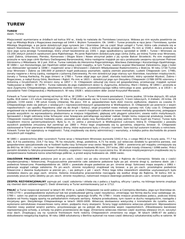 TUREW TUREW dawn. Turwia Miejscowość wymieniana w źródłach od końca XIV w., kiedy to należała do Tomisława Leszczyca. Wdowa po nim wyszła powtórnie za mąż za Mikołaja Bryla z Rogaczewa zwanego od 1444 r. Brylem Turewskim. Ok. 1448 r. Turew przeszła w ręce Jana i Tomisława, synów Mikołaja Słupskiego, a po Janie dziedziczyli jego synowie Jan i Stanisław. Jan za część Słupi ustąpił z Turwi, która cała znalazła się w rękach Stanisława. Po nim dziedziczyli jego synowie Jan i Maciej, z których Maciej przejął majątek. Po nim w 1546 r. dobra przeszły w ręce jego syna Jerzego Turewskiego, który zmarł bezdzietnie po 1591 r. Jego spadkobiercy sprzedali w 1608 r. Turew i Wronowo za 23.200 złotych polskich opiekunom Jana Rąbińskiego. Po Janie Rąbińskim dziedziczyła jego córka Zofia, po której Turew oraz Wronowo, część Żabna, Urbanowo, Piersko, Komorowo i Długie Stare i Nowe otrzymał jeden z jej synów Balcer Strzelecki. Po nim majętność przeszła w ręce jego córki Barbary Daćbogowej Baranowskiej, która następnie majątek po ojcu przekazała swojemu ojczymowi Piotrowi Górskiemu z Miłosławia. W 2 poł. XVII w. Turew należała do Hieronima Pogorzelskiego, Wacława Zaleskiego i Konstantego Opalińskiego. W 1684 r. syn Konstantego, Jan Opaliński oddał swoją część majątku, w tym Turew, swemu wujowi Wacławowi Zaleskiemu. Jego z kolei syn Aleksander sprzadał w 1698 r. majętność wraz z Wronowem i Żabnem Władysławowi Radomickiemu z Białcza. W roku 1730 Turew oraz Wronowo i Żabno za 190.000 zł polskich kupił podczaszy poznański, sędzia ziemski poznański, Ludwik Chłapowski (zm. 1748), żonaty najpierw z Anną Lipską, następnie z Julianną Zakrzewską. Po nim dziedziczył jego starszy syn Stanisław, kasztelan międzyrzecki, żonaty z Teresą Kwilecką. Po jego śmierci w 1780 r. Turew objął jego syn Józef, starosta kościański, który sprzedał Wyskoć, Żabno i Rogaczewo, a nabył Kurzą Górę, Bonikowo i Rąbiń. Po nim w 1821 r. dziedziczył jego syn Dezydery Chłapowski (1788-1879) ożeniony z Antoniną z Grudzińskich. Po śmierci żony w 1857 r. D. Chłapowski odsunął się nieco od gospodarstwa, przekazując majątek synowi Tadeuszowi w 1860 r. W 1879 r. Turew należała do jego małoletnich dzieci tj. Zygmunta, Antoniny, Marii i Heleny. W 1893 r. przeszła w ręce Zygmunta Chłapowskiego, absolwenta studiów rolniczych, przewodniczącego kółka rolniczego w pow. gostyńskim, a w 1919 r. w posiadanie Tekli Chłapowskiej z Mańkowskich. W roku 1928 r. właścicielem dóbr został Krzysztof Morawski. Folwark w Turwi istniał co najmniej od końca XVI w. W 1599 r. w Turwi i Wronowie posiadano 2 konie jezdne, 19 krów dojnych, 65 sztuk bydła, 818 owiec i 23 sztuki nierogacizny. W roku 1748 znajdowało się tu 5 koni karecianych, 5 koni roboczych, 4 źrebaki, 20 krów, 29 jałówek, 1150 owiec i 99 sztuk trzody chlewnej. Na pocz. XIX w. gospodarstwo było dość mocno zadłużone, dopiero za czasów D. Chłapowskiego stało się jednym z wiodących i najnowocześniejszych gospodarstw w Wielkopolsce. D. Chłapowski po powrocie z wojen napoleońskich i po upadku Napoleona udał się do Anglii i Szkocji, skąd przywiózł nowe metody uprawy roli. Cały czas D. Chłapowski angażował się w działalność polityczną. Zastosował on w swoich majątkach całkowicie nowe metody gospodarki folwarcznej, polegające przede wszystkim na wprowadzeniu płodozmianu w miejsce trójpolówki, głębszej orki pługami szkockimi, siewie roślin motylkowych. Sprowadził z Anglii odmianę krów Schwyzer oraz Szwajcara potrafiącego wyrabiać nabiał. Dzięki temu rozpoczął produkcję masła. D. Chłapowski rozwinął również hodowlę owiec, posiadał całe stado rasy Rambouillet o grubej wełnie, które kupił we Francji. Turew była majątkiem mocno uprzemysłowionym. Była tu m. in. jedna z pierwszych w Wielkopolsce cukrowni, którą D. Chłapowski z powodu wysokich podatków zmuszony był zamknąć po 1860 r. Prócz tego znajdowała się tu gorzelnia, olejarnia, browar. D. Chłapowski zastosował w Turwi pierwsze w Wielkopolsce dreny, które wykonane były z chrustu i kamieni. Sam też był autorem traktatu o rolnictwie. Folwark Turew był największy w majętności. Tutaj znajdowały się domy administracji i warsztaty, a kolejka polna dochodziła do prawie wszyskich pól majątku. W 1881 r. powierzchnia dóbr rycerskich Turew wraz z folwarkiem Wronowo wynosiła 1342,4 ha, z czego 962,8 ha liczyły pola, 77,7 ha łąki, 6,4 ha pastwiska, 214,7 ha lasy, 76 ha nieużytki, drogi, podwórza, 4,71 ha wody. Już wówczas działała tu gorzelnia parowa, zaś gospodarstwo specjalizowało się w hodowli bydła rasy Schwyzer oraz owiec Negretti. W 1896 r. powierznia pól majątku zmniejszyła się do 843 ha. W 1913 r. na terenie Turwi i Wronowa prowadzono hodowlę 95 koni, 257 krów, 282 sztuk trzody chlewnej i 1098 owiec. Prócz gorzelni działała tu fabryka prasowanych drożdży, cegielnia i maszyna do czyszczenia lnu. W okresie międzywojennym znajdowała się tu zarejestrowana hodowla konia szlachetnego półkrwi, a przed wojną hodowano ok. 2800 owiec. ZAŁOŻENIE PAŁACOWE położone jest w pn.-zach. części wsi po obu stronach drogi z Rąbinia do Czempinia. Składa się z części rezydencjonalnej i folwarcznej. Przypuszczalnie pierwotnie całe założenie położone było po pd. stronie drogi tj. zarówno dwór, jak i podwórze folwarczne. Prawdopodobnie ok. 1830 r. powstało drugie podwórze po pn. stronie drogi. Szkicowa mapa zespołu z 1861 r. pokazuje wygląd całego założenia. Po pn.-wsch. stronie rezydencji znajdował się browar, a po pn.-zach. prostokątne podwórze folwarczne z dwoma budynkami w pierzei pn., i po jednym z pd. i wsch. Prócz tego kilka niewielkich obiektów usytuowanych było niedaleko dworu po jego zach. stronie. Kolonia mieszkalna pracowników rozciągała się wzdłuż drogi do Rąbinia. W ko
