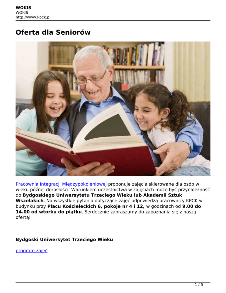 WOKIS WOKIS http://www.kpck.pl Oferta dla Seniorów Pracownia Integracji Międzypokoleniowej proponuje zajęcia skierowane dla osób w wieku późnej dorosłości. Warunkiem uczestnictwa w zajęciach może być przynależność do Bydgoskiego Uniwersytetu Trzeciego Wieku lub Akademii Sztuk Wszelakich. Na wszystkie pytania dotyczące zajęć odpowiedzą pracownicy KPCK w budynku przy Placu Kościeleckich 6, pokoje nr 4 i 12, w godzinach od 9.00 do 14.00 od wtorku do piątku. Serdecznie zapraszamy do zapoznania się z naszą ofertą! Bydgoski Uniwersytet Trzeciego Wieku program zajęć 1/5 WOKIS WOKIS http://www.kpck.pl Akademia Sztuk Wszelakich program zajęć Grupa Plastyczna Zajęcia odbywają się w piątki od godziny 10.30 do 16.30 w budynku Uniwersytetu Kazimierza Wielkiego w Bydgoszczy przy placu Kościeleckich 8 w sali nr 24. Zajęcia prowadzą: Katarzyna Wolska i Karolina Drzycimska Kontakt: Galeria Sztuki Ludowej i Nieprofesjonalnej przy KPCK tel. 52 585 15 01 Grupa Tańca Nowoczesnego „noWa” Zajęcia odbywają się we wtorki i czwartki od godziny 11.00 do 13.00 w Szkole Tańca "Bohema" przy ul. Dworcowej 51 w Bydgoszczy. Kontakt: Małgorzata Wójcik tel. 601 448 045 lub 600 227 962 Zespół Wokalny „Tercja” Zajęcia odbywają się we wtorki od godziny 11.00 do 13.00 w Osiedlowym Domu Kultury ORION przy ul. 16 Pułku Ułanów Wielkopolskich 1 w Bydgoszczy. Zajęcia prowadzi: Roman Fieberg 2/5 WOKIS WOKIS http://www.kpck.pl Kontakt: Teresa Macioszek tel. 660 482 111 Chór Kameralny „Belcanto” Zajęcia odbywają się w piątki od godziny 13.00 do 15.00 w budynku Uniwersytetu Kazimierza Wielkiego w Bydgoszczy przy ul. Jagiellońskiej 11 w sali nr 1. Zajęcia prowadzi: Dyrygent Łukasz Hermanowicz Kontakt: Pracownicy KPCK tel. 52 585 15 01 Teatr Form Różnych „Nasza Klasa” Zajęcia odbywają się w piątki od godziny 10.00 do 12.00 w budynku Uniwersytetu Kazimierza Wielkiego w Bydgoszczy przy ul. Jagiellońskiej 11 w sali nr 1. Zajęcia prowadzi: Teresa Wądzińska-Szpecht Kontakt: Pracownicy KPCK tel. 52 585 15 01 Dyskusyjny Klub Filmowy KAKADU Zajęcia odbywają się w poniedziałki o godzinie 10.00 w Klubie Kancelaria przy ul. Przesmyk 1 w Bydgoszczy. Zajęcia prowadzi: Julian Waszak 3/5 WOKIS WOKIS http://www.kpck.pl Kontakt: Pracownicy KPCK tel. 52 585 15 01 Lektorat języków obcych Szkoła Języków Obcych English Pro Academy przy ul. 3-go Maja 8/1 w Bydgoszczy. Kontakt: tel. 52 349 38 88 lub 516 081 202 Polskie Towarzystwo Turystyczno-Krajoznawcze Spotkania odbywają się w piątki od godziny 10.00 do 12.00 w sali nr 12 w budynku KPCK przy placu Kościeleckich 6 w Bydgoszczy. Kontakt: Alicja Porażka tel. 52 361 80 62, Teresa Płaczkowska tel. 52 582 69 80 ZAJĘCIA SPORTOWO – REHABILITACYJNE Prosimy o kontakt we własnym zakresie. Pracownia Integracji Międzypokoleniowej nie prowadzi zapisów na gimnastykę i Nordic Walking. Park Aktywnej Rehabilitacji i Sportu „PARIS” Centrum Onkologii, Bydgoszcz, ul. Romanowskiej 2 Kontakt: tel. 52 374 32 30 4/5 WOKIS WOKIS http://www.kpck.pl Centrum Rehabilitacji i Odnowy Biologicznej „REWITAL” Wyższa Szkoła Gospodarki, Bydgoszcz, ul. Garbary 2 Kontakt: tel. 52 567 07 91 Zajęcia Gimnastyczne W Szkole Tańca „Bohema” Bydgoszcz, ul. Dworcowa 51 Kontakt: Natalia Lewandowska, tel. 607 788 786 NORDIC WALKING w Leśnym Parku Kultury i Wypoczynku Kontakt: Natalia Lewandowska, tel. 607 788 786 Bella Line Wellness Centrum Bydgoszcz Bydgoszcz, ul. Toruńska 59 Kontakt: tel. 52 345 21 45 lub 667 661 654 Julian Waszak [email protected] tel. 52 585 15 01 Up: JW23.03.15 A: JW10.04.15 5/5 Powered by TCPDF (www.tcpdf.org)
