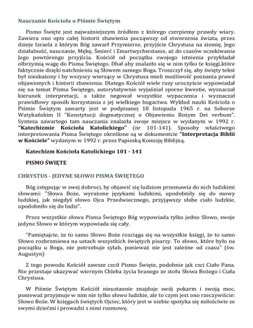 Nauczanie Kościoła o Piśmie Świętym Pismo Święte jest najważniejszym źródłem z którego czerpiemy prawdy wiary. Zawiera ono opis całej historii zbawienia począwszy od stworzenia świata, przez dzieje Izraela z którym Bóg zawarł Przymierze, przyjście Chrystusa na ziemię, Jego działalność, nauczanie, Mękę, Śmierć i Zmartwychwstanie, aż do czasów oczekiwania Jego powtórengo przyjścia. Kościół od początku swojego istnienia przykładał olbrzymią wagę do Pisma Świętego. Dbał aby znalazło się w nim tylko te księgi,które faktycznie dzięki natchnieniu są Słowem samego Boga. Troszczył się, aby święty tekst był nieskażony i by wszyscy wierzący w Chrystusa mieli możliwość poznania prawd objawionych i historii zbawienia. Dlatego Kościół wiele razy uroczyście wypowiadał się na temat Pisma Świętego, autorytatywnie wyjaśniał sporne kwestie, wyznaczał kierunek interpretacji, a także negował wszystkie wypaczenia i wyznaczał prawidłowy sposób korzystania z jej wielkiego bogactwa. Wykład nauki Kościoła o Piśmie Świętym zawarty jest w podpisanej 18 listopada 1965 r. na Soborze Watykańskim II "Konstytucji dogmatycznej o Objawieniu Bożym Dei verbum". Synteza zawartego tam nauczania znalazła swoje miejsce w wydanym w 1992 r. "Katechizmie Kościoła Katolickiego" (nr 101-141). Sposoby właściwego interpretowania Pisma Świętego określone są w dokumentcie "Interpretacja Biblii w Kościele" wydanym w 1992 r. przez Papieską Komisję Biblijną. Katechizm Kościoła Katolickiego 101 - 141 PISMO ŚWIĘTE CHRYSTUS - JEDYNE SŁOWO PISMA ŚWIĘTEGO Bóg zstępując w swej dobroci, by objawić się ludziom przemawia do nich ludzkimi słowami: "Słowa Boże, wyrażone językami ludzkimi, upodobniły się do mowy ludzkiej, jak niegdyś słowo Ojca Przedwiecznego, przyjąwszy słabe ciało ludzkie, upodobniło się do ludzi". Przez wszystkie słowa Pisma Świętego Bóg wypowiada tylko jedno Słowo, swoje jedyne Słowo w którym wypowiada się cały. "Pamiętajcie, że to samo Słowo Boże rozciąga się na wszystkie księgi, że to samo Słowo rozbrzmiewa na ustach wszystkich świętych pisarzy. To słowo, które było na początku u Boga, nie potrzebuje sylab, ponieważ nie jest zależne od czasu" (św. Augustyn) Z tego powodu Kościół zawsze czcił Pismo Święte, podobnie jak czci Ciało Pana. Nie przestaje ukazywać wiernym Chleba życia branego ze stołu Słowa Bożego i Ciała Chrystusa. W Piśmie Świętym Kościół nieustannie znajduje swój pokarm i swoją moc, ponieważ przyjmuje w nim nie tylko słowo ludzkie, ale to czym jest ono rzeczywiście: Słowo Boże. W księgach świętych Ojciec, który jest w niebie spotyka się miłościwie ze swymi dziećmi i prowadzi z nimi rozmowę. NATCHNIENIE I PRAWDA PISMA ŚWIĘTEGO Bóg jest autorem Pisma Świętego. Prawdy przez Boga objawione, które są zawarte i wyrażone w Piśmie Świętym, spisane zostały pod natchnieniem Ducha Świętego. Święta Matka Kościół uważa, na podstawie wiary apostolskiej, księgi tak Starego, jak Nowego Testamentu, w całości ze wszystkimi ich częściami za święte i kanoniczne, dlatego, że spisane pod natchnieniem Ducha Świętego, Boga mają za Autora i jako takie zostały Kościołowi przekazane". Bóg natchnął ludzkich autorów ksiąg świętych. Do sporządzenia ksiąg świętych Bóg wybrał ludzi, którymi posłużył się jako używającymi swoich zdolności i sił, by dzięki Jego działaniu w nich i przez nich oni sami jako prawdziwi autorzy przekazali na piśmie to wszystko, i tylko to, czego On chciał. Księgi natchnione nauczają prawdy. Ponieważ wszystko, co twierdzą autorzy natchnieni, czyli hagiografowie, powinno być uważane za stwierdzone przez Ducha Świętego, należy zatem uznawać, że księgi biblijne w sposób pewny, wiernie i bez błędu uczą prawdy, jaka z woli Bożej miała być przez Pismo Święte utrwalona dla naszego zbawienia. Wiara chrześcijańska nie jest jednak "religią Księgi". Chrześcijaństwo jest religią "Słowa" Bożego, nie spisanego i milczącego, ale Słowa Wcielonego i żywego. Aby słowa Pisma Świętego nie pozostawały martwą literą, trzeba, by Chrystus, wieczne Słowo Boga żywego, przez Ducha Świętego oświecił nasze umysły, abyśmy "rozumieli Pana" (Łk 24,25). Duch Święty - "Interpretator" Pisma Świętego W Piśmie Świętym Bóg mówi do człowieka w sposób ludzki. Aby dobrze interpretować Pismo Święte, trzeba więc zwracać uwagę na to, co autorzy ludzcy rzeczywiście zamierzali powiedzieć i co Bóg chciał nam ukazać przez ich słowa. W celu zrozumienia intencji autorów świętych trzeba uwzględnić okokliczności ich czasu i kultury, rodzaje literackie używane w danej epoce, a także przyjęte sposoby myślenia, mówienia i opowiadania. Inaczej bowiem ujmuje się i wyraża prawdę w różnego rodzaju tekstach historycznych, prorockich, poetyckich czy w innych rodzajach literackich. Ponieważ Pismo Święte jest natchnione, istnieje druga zasada poprawnej interpretacji, nie mniej ważna niż poprzednia, bez której Pismo Święte byłoby martwą literą: "Pismo Święte powinno być czytane i interpretowane w tym samym Duchu, w jakim zostało napisane". Sobór Watykański II wskazuje na trzy kryteria interpretacji Pisma Świętego, odpowiadające Duchowi, który je natchnął: Zwracać uwagę przede wszystkim na "treść i jedność całego Pisma Świętego" Jakkolwiek byłyby zróżnicowane księgi, z których składa się Pismo Święte, to jest ono jednak jedno ze względu na jedność Bożego zamysłu, którego Jezus Chrystus jest ośrodkiem i sercem, otwartym po wypełnieniu Jego Paschy. Czytać Pismo Święte w "żywej Tradycji całego Kościoła". Według powiedzenia Ojców Kościoła "Pismo Święte jest bardziej wypisane na serecu Kościoła niż na pergaminie". Istotnie, Kościół nosi w swojej Tradycji żywą pamięć słowa Bożego, a Duch Święty