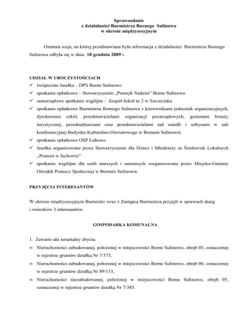Sprawozdanie z działalności Burmistrza Bornego Sulinowa w okresie międzysesyjnym Ostatnia sesja, na której przedstawiana była informacja z działalności Burmistrza Bornego Sulinowa odbyła się w dniu 18 grudnia 2009 r. UDZIAŁ W UROCZYSTOŚCIACH świąteczne Jasełka – DPS Borne Sulinowo spotkanie opłatkowe – Stowarzyszenie „Promyk Nadziei” Borne Sulinowo samorządowe spotkanie wigilijne - Zespół Szkół nr 2 w Szczecinku spotkanie opłatkowe Burmistrza Bornego Sulinowa z kierownikami jednostek organizacyjnych, dyrektorami szkół, przedstawicielami organizacji pozarządowych, gestorami branŜy turystycznej, przedsiębiorcami oraz przedstawicielami rad osiedli i sołtysami w sali konferencyjnej Budynku Kulturalno-Oświatowego w Bornem Sulinowie spotkanie opłatkowe OSP Łubowo Jasełka organizowane przez Stowarzyszenie dla Dzieci i MłodzieŜy ze Środowisk Lokalnych ,,Pomost w Juchowie” spotkanie wigilijne dla osób starszych i samotnych zorganizowane przez Miejsko-Gminny Ośrodek Pomocy Społecznej w Bornem Sulinowie PRZYJĘCIA INTERESANTÓW W okresie międzysesyjnym Burmistrz wraz z Zastępcą Burmistrza przyjęli w sprawach skarg i wniosków 3 interesantów. GOSPODARKA KOMUNALNA 1. Zawarto akt notarialny zbycia: • Nieruchomości zabudowanej, połoŜonej w miejscowości Borne Sulinowo, obręb 05, oznaczonej w rejestrze gruntów działką Nr 7/373, • Nieruchomości zabudowanej, połoŜonej w miejscowości Borne Sulinowo, obręb 06, oznaczonej w rejestrze gruntów działką Nr 89/133, • Nieruchomości niezabudowanej, połoŜonej w miejscowości Borne Sulinowo, obręb 05, oznaczonej w rejestrze gruntów działką Nr 7/385. 2. Zrezygnowano z przysługującego w myśl art. 109 ust. 1 ustawy z dnia 21 sierpnia 1997 r. o gospodarce nieruchomościami, prawa pierwokupu nieruchomości niezabudowanej połoŜonej w miejscowości: • Borne Sulinowo, obręb 04, oznaczonej w ewidencji gruntów działką Nr 9/16 o pow. 0,0949ha, • Borne Sulinowo, obręb 05, oznaczonej w ewidencji gruntów działką Nr 7/109 o pow. 0,0019ha. 3. Podano do publicznej wiadomości poprzez: ogłoszenie w prasie lokalnej, na stronie internetowej, w BIP-e oraz w sposób zwyczajowo przyjęty informację o terminie przetargu na zbycie nieruchomości, który ma się odbyć w dniu 22 stycznia 2010r. 4. Zlecono uprawnionemu rzeczoznawcy majątkowemu sporządzenie wyceny nieruchomości: • oznaczonej działką Nr 7/185, połoŜonej w miejscowości Borne Sulinowo, obręb 05, • oznaczonej działką Nr 7/186, połoŜonej w miejscowości Borne Sulinowo, obręb 05, • oznaczonej działką Nr 256, połoŜonej w miejscowości Silnowo, obręb Silnowo, • oznaczonej działką Nr 89/187, połoŜonej w miejscowości Borne Sulinowo, obręb 06, • oznaczonej działką Nr 147/2, połoŜonej w miejscowości Krągi, obręb Krągi, • oznaczonej działką Nr 148/2, połoŜonej w miejscowości Krągi, obręb Krągi. 5. Zlecono uprawnionemu geodecie wskazanie granic działki Nr 576/10 połoŜonej w Łubowie. 6. Podpisano protokół uzgodnień do zawarcia aktu notarialnego sprzedaŜy nieruchomości niezabudowanej, połoŜonej w Łubowie oznaczonej Nr 576/10 o pow. 0,1005 ha. 7. Sporządzono pięć protokołów po przetargach zakończonych wynikiem negatywnym. 8. Zgodnie z ustawą z dnia 7 września 2007r. o ujawnieniu w księgach wieczystych prawa własności nieruchomości Skarbu Państwa oraz jednostek samorządu terytorialnego (Dz. U z 2007r. Nr 191, poz. 1365) przesłano do Urzędu Wojewódzkiego miesięczne sprawozdanie o realizacji art. 1 w. cytowanej ustawy. 9. Wystąpiono do Sądu Rejonowego w Szczecinku – Wydziału Ksiąg Wieczystych o ujawnienie w księdze wieczystej Nr 31986 nieruchomości, połoŜonej w gminie Borne Sulinowo, obręb 04, miejscowości Borne Sulinowo, oznaczonej w ewidencji gruntów działką Nr 7/3 o pow. 0,6327 ha, 10. Udzielono Starostwu Powiatowego w Szczecinku 33 informacji w sprawie realizacji roszczeń z tyt. pozostawionego mienia poza granicami państwa polskiego poprzez nabycie prawa własności lub uŜytkowania wieczystego nieruchomości Skarbu Państwa na terenie miasta i gminy Borne Sulinowo. 11. Wydano dla rolników zaświadczenia o wielkości posiadanego gospodarstwa rolnego oraz uŜytków rolnych w ilości – 6 szt. 12. Wysłano informację do sołtysów w sprawie polowań zbiorowych organizowanych przez Nadleśnictwo Borne Sulinowo. 13. Wysłano informację do sołtysów w sprawie specjalistycznych targów rolniczych w Poznaniu. 2 14. Podatek akcyzowy a) Wysłano do rolników informację o osobiste stawiennictwo w tut. urzędzie w celu odebrania zwrotu podatku akcyzowego zawartego w cenie oleju napędowego wykorzystywanego do produkcji rolnej za miesiąc wrzesień 2009 r. b) Wysłano do Zachodniopomorskiego Urzędu Wojewódzkiego w Szczecinie okresowe i roczne sprawozdanie rzeczowo-finansowe z realizacji wypłat producentom rolnym zwrotu podatku akcyzowego zawartego w cenie oleju napędowego wykorzystywanego do produkcji rolnej za wrzesień 2009. c) Wysłano do Zachodniopomorskiego Urzędu Wojewódzkiego w Szczecinie okresowe i roczne rozliczenie dotacji celowej z realizacji wypłat producentom rolnym zwrotu podatku akcyzowego zawartego w cenie oleju napędowego wykorzystywanego do produkcji rolnej za wrzesień 2009. 15. Zawarto umowę dzierŜawy na nieruchomość stanowiącą własność Gminy Borne Sulinowo: ● ogródek działkowy nr 56 o powierzchni 0,0250 ha wydzielony z nieruchomości gruntowej, połoŜony na działkach oznaczonych w ewidencji gruntów i budynków nr 147 i nr 148 w miejscowości Krągi, obręb Krągi, gmina Borne Sulinowo. Okres dzierŜawy 10 lat. 16. Sporządzono aneksy do umów zawartych przez Gminę Borne Sulinowo: ● do umowy dzierŜawy Nr 4/2008 z dnia 6 lutego 2008 r. na dzierŜawę 2,5 m2 z nieruchomości oznaczonej w ewidencji gruntów i budynków numerem 87/51, połoŜonej przy ul. Al. Niepodległości w miejscowości Borne Sulinowo, obr