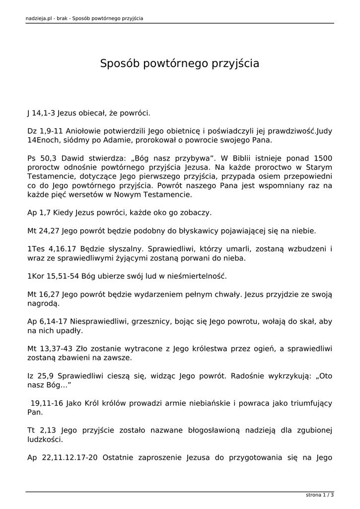nadzieja.pl - brak - Sposób powtórnego przyjścia Sposób powtórnego przyjścia J 14,1-3 Jezus obiecał, że powróci. Dz 1,9-11 Aniołowie potwierdzili Jego obietnicę i poświadczyli jej prawdziwość.Judy 14Enoch, siódmy po Adamie, prorokował o powrocie swojego Pana. Ps 50,3 Dawid stwierdza: „Bóg nasz przybywa”. W Biblii istnieje ponad 1500 proroctw odnośnie powtórnego przyjścia Jezusa. Na każde proroctwo w Starym Testamencie, dotyczące Jego pierwszego przyjścia, przypada osiem przepowiedni co do Jego powtórnego przyjścia. Powrót naszego Pana jest wspomniany raz na każde pięć wersetów w Nowym Testamencie. Ap 1,7 Kiedy Jezus powróci, każde oko go zobaczy. Mt 24,27 Jego powrót będzie podobny do błyskawicy pojawiającej się na niebie. 1Tes 4,16.17 Będzie słyszalny. Sprawiedliwi, którzy umarli, zostaną wzbudzeni i wraz ze sprawiedliwymi żyjącymi zostaną porwani do nieba. 1Kor 15,51-54 Bóg ubierze swój lud w nieśmiertelność. Mt 16,27 Jego powrót będzie wydarzeniem pełnym chwały. Jezus przyjdzie ze swoją nagrodą. Ap 6,14-17 Niesprawiedliwi, grzesznicy, bojąc się Jego powrotu, wołają do skał, aby na nich upadły. Mt 13,37-43 Zło zostanie wytracone z Jego królestwa przez ogień, a sprawiedliwi zostaną zbawieni na zawsze. Iz 25,9 Sprawiedliwi cieszą się, widząc Jego powrót. Radośnie wykrzykują: „Oto nasz Bóg…” 19,11-16 Jako Król królów prowadzi armie niebiańskie i powraca jako triumfujący Pan. Tt 2,13 Jego przyjście zostało nazwane błogosławioną nadzieją dla zgubionej ludzkości. Ap 22,11.12.17-20 Ostatnie zaproszenie Jezusa do przygotowania się na Jego strona 1 / 3 nadzieja.pl - brak - Sposób powtórnego przyjścia rychły powrót. NAJCZĘŚCIEJ STAWIANE PYTANIA DOTYCZĄCE POWTÓRNEGO PRZYJŚCIA JEZUSA: Czy Jezus przyjdzie potajemnie? Czy Biblia nie naucza, że: „Dwóch będzie na roli, jeden będzie wzięty, a drugi zostawiony” Mt 24,4 Biblia bardzo wyraźnie stwierdza, że przyjście Jezusa nie jest tajemniczym wydarzeniem (Ap 1,7; Ps 5,3; 1Tes 4,16.17; Mt 24,27). Kiedy Biblia wspomina o tych, którzy pozostali, nie mówi, że zostaną oni pozostawieni na ziemi. W obszernym fragmencie, w Łk 17,26-37, zostało opisane to wydarzenie w szczegółach. W czasach Noego istniały dwie grupy ludzi: jedni zostali zabrani (zbawieni), drudzy pozostawieni (unicestwieni przez potop — w. 27). W czasach Lota również były dwie grupy: jedni zostali wyprowadzeni z miasta i zbawieni, inni tam pozostawieni i zniszczeni przez ogień. Podobnie będzie w dniu, kiedy przyjdzie Jezus Łk 17,3-37. Jedna grupa zostanie zabrana, druga unicestwiona. W Łk 17,37 jest postawione pytanie: „Gdzie, Panie?”, gdzie są pozostawieni ci ludzie? Odpowiedź biblijna jest prosta: „Gdzie jest padlina, tam zlatują się i sępy”. Ap 19,11-18 wyjaśnia ten problem, opisując, że niesprawiedliwi zostaną unicestwieni w czasie przyjścia Jezusa (zob. także 2Tes 1,7-9; 2,8. Czy Biblia nie naucza, że Jezus przyjdzie jak złodziej? 1Tes 5,2 Każde biblijne odniesienie do powrotu Jezusa, tak niespodziewanego jak przyjście złodzieja, ma związek z niespodziewanym czasem przyjścia Jezusa, a nie ze sposobem Jego przyjścia. Przyjdzie szybko jak złodziej, niespodziewanie jak złodziej, ale w chwalebnym splendorze, jak błyskawica, w chwale triumfu (zob. Mt 24,42-44; 1Tes 5,1-5; Mt 24,27). Czy lud Boży będzie żył w czasie nadchodzącego ucisku, czy może zostanie porwany przed okresem ucisku? Doświadczenia starożytnego Izraela są przykładami danymi przez Boga dla ludzi żyjących w czasie końca. Jak Izrael został wybawiony z niewoli egipskiej po plagach, tak Kościół Boży zostanie ochroniony przez plagi i wybawiony z rąk oprawców 1Kor 10,11; Ps 91;46. Szadrach, Meszach i Abed-Nego poszli w płomienie, ponieważ nie ustąpili w obliczu powszechnego dekretu śmierci ogłoszonego przez babilońskiego króla. Bóg cudownie uratował ich z tych płomieni. Ich wiara, zdolna przeciwstawić się śmierci, dotknęła płomieni Dn 3,16-28. On przychodzi po plagach jak złodziej Ap 16,15. Jaki sens miałoby więc stwierdzenie: „Oto przychodzę jak złodziej” po wylaniu szóstej plagi, skoro On już przyszedł jak złodziej, zanim zostały one wylane? Ap 15,8 dobitnie stwierdza, że nikt nie może wejść do niebiańskiej świątyni, zanim nie dopełnią się plagi. 2Tes 2,1-3 wyjaśnia wprost, że antychryst zostanie objawiony zanim przyjdzie Jezus i zostanie unicestwiony blaskiem Jego przyjścia 2Tes 2,8. strona 2 / 3 nadzieja.pl - brak - Sposób powtórnego przyjścia Czy Biblia nie naucza, że sprawiedliwi otrzymają swoją nagrodę, kiedy zostaną porwani na początku siedmioletniego ucisku, a niesprawiedliwi zostaną zniszczeni na końcu siedmioletniego okresu ucisku? Przypowieści Jezusa wyjaśniają, że Jego powtórne przyjście jest końcowym boskim wydarzeniem — ludzie zostaną albo zbawieni, albo unicestwieni. Nie będzie siedmioletniego okresu na przemyślenie naszego życia. Teraz jest dzień zbawienia 2Kor 6,2. W Mt 13,3 czytamy, że zarówno pszenica, jak i kąkol (sprawiedliwi i bezbożni) rosną razem aż do żniwa. Sprawiedliwi zostaną zbawieni, a niesprawiedliwi zniszczeni. W przypowieści o niewiernym słudze nie ma drugiej szansy. Niewierni są zniszczeni, kiedy niespodziewanie pojawi się pan domu Mt 24,44-51. W przypowieści o owcach i kozłach, mężczyźni i kobiety są w czasie przyjścia Jezusa albo zbawieni, albo unicestwieni Mt 25,31-46. strona 3 / 3 Powered by TCPDF (www.tcpdf.org)