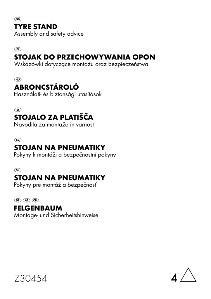 T YRE STAND A ssembly and safety advice S TOJAK DO PRZECHOWYWANIA OPON W skazówki dotyczące montażu oraz bezpieczeństwa ABRONCSTÁROLÓ H asználati- és biztonsági utasítások S TOJALO ZA PLATIŠČA N avodila za montažo in varnost S TOJAN NA PNEUMATIKY P okyny k montáži a bezpečnostní pokyny S TOJAN NA PNEUMATIKY P okyny pre montáž a bezpečnosť FELGENBAUM M ontage- und Sicherheitshinweise Z30454 4 GB PL HU SI CZ SK DE / AT / CH Assembly and safety advice Wskazówki dotyczące montażu oraz bezpieczeństwa Használati- és biztonsági utasítások Navodila za montažo in varnost Pokyny k montáži a bezpečnostní pokyny Pokyny pre montáž a bezpečnosť Montage- und Sicherheitshinweise Page Strona Oldal Stran Strana Strana Seite 5 8 12 15 18 21 24 1 x 1 4 x 2 1 x 3 1 x 4 4 x 9 1 x 10 1 x 11 4 x 5 4 x 6 1 x 7 1 x 12 4x 8 4 x 13 1 x 14 B A 1 5 2 2 5 8 6 4 5 5 3 C D 3 4 E 4 F Table of Contents Introduction Intended use...................................................................................................................Page6 Description of Parts........................................................................................................Page6 Technical data................................................................................................................Page6 Accessories.....................................................................................................................Page6 Safety information.............................................................................................Page6 Assembly....................................................................................................................Page7 Instructions for use of accessories........................................................Page7 Maintenance and care....................................................................................Page7 Disposal.......................................................................................................................Page7 GB 5 Introduction / Safety information Tyre stand Q Technical Q Introduction Please familiarise yourself with the product prior to assembly. Carefully read the following assembly instructions and safety tips. Only use the product as described and for the specified applications. Store these instructions in a safe place. If passing this product on to a third party also include all documents. Q Intended use The tyre stand is intended for the storage of wheel rims with or without tyres. Any use other than the aforementioned or any product modification is prohibited and can lead to injuries and / or product damage. The manufacturer is not liable for any damages caused by any use other than its intended purpose. This product is not intended for commercial use. Children and persons who are unable to operate the equipment safely because of their physical, sensory or mental capacities or their inexperience or lack of knowledge must not use the equipment. Q Description of Parts 1 Central linking piece 2 Screws 3 End rod section (with plug) 4 Down rod section (without plug) 5 Extension legs 6 Pin 7 Storage container (2 parts) 8 Plate 9 Screws 10 Tread depth gauge 11 Air pressure gauge 12 Tyre protection cover 13 Tyre chips, 4 different colours 14 Hexagon wrench 6 GB data Suitable for all currently available car rims up to 18 inches (45.72 cm). Suitable for all common car wheel rims with tyre widths up to 225 mm. Material: steel, aluminium, PP (polypropylene) Total height (without container): ~1,13 m Weight (without accessories): ~2,2 kg Q Accessories Tyre protection cover With Velcro fastening Tyre chips In 4 different colours. Labelling: front left, right front, left rear, right rear Air pressure gauge For easy measurement of air pressure. Measurement range: 0.7 – 3.5 bar / 10 – 50 psi Tread depth gauge Measurement range: 0 – 20 mm; shows statutory minimum tread depth (1.6 mm) and recommended tread depth for winter tyres (4 mm). Storage container For practical storage of assembly equipment. Safety information ✕ Do not tilt the tyre stand! Warning! Potential hazard! Low risk of injury to persons! Danger of tipping! J Place the tyre stand only on a level, flat and solid surface. The base must not slope, as the stability of the rack cannot then be guaranteed. (Use spirit level to check.) J The tyre stand may not be used for any other purpose since this could cause injury. ... / Assembly / Instructions for use of accessories / Maintenance and care / Disposal J T he tyre stand may not be moved when supporting a load (rims + tyres) since there is a danger that it could tip over. J The tyre stand may not be tipped since this could cause injury. J The tyre stand may not be used if damaged since this could cause injury. J Always operate the tyre stand using two hands. J Due to danger of tipping, load tyre stand ONLY from above, in order to avoid injury. ✓ ✕ Q Assembly Decide on the final location for your rim tree before putting the wheels on to it. 1) First of all fit the central linking piece and the extension legs together. Fasten with the screws (Contents: pos. 2) supplied (if necessary a rubber hammer can help with this). Then fit the end stoppers. 2) Insert the down rod section (without plug) into the central linking piece. Put the pin through the lowest hole and fit the plate. 3) Load rim with tyre. Proceed in same sequence for other tyres. 4) Now, put in place end rod section (with stopper). Proceed as described above, until all 4 tyres are properly stored. 5) If you would like to make use the storage container for storing assembly items, carefully remove the stopper from the end rod section (e.g. with the aid of a screwdriver). Place the storage container on the end rod section. Notes: the two individual parts of the storage container must be joined with the corresponding screws (Contents: pos. 9) before being used. For this, please use a crosshead screwdriver, size PH1. Q In