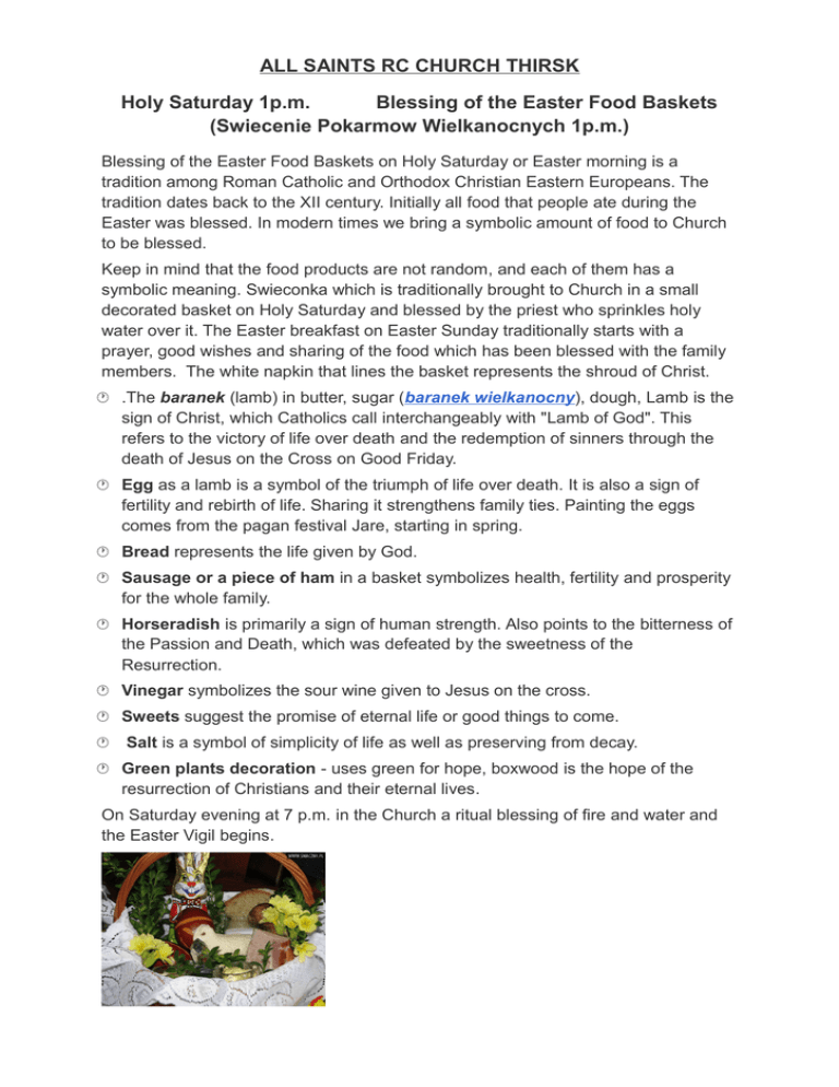 ALL SAINTS RC CHURCH THIRSK Holy Saturday 1p.m. Blessing of the Easter Food Baskets (Swiecenie Pokarmow Wielkanocnych 1p.m.) Blessing of the Easter Food Baskets on Holy Saturday or Easter morning is a tradition among Roman Catholic and Orthodox Christian Eastern Europeans. The tradition dates back to the XII century. Initially all food that people ate during the Easter was blessed. In modern times we bring a symbolic amount of food to Church to be blessed. Keep in mind that the food products are not random, and each of them has a symbolic meaning. Swieconka which is traditionally brought to Church in a small decorated basket on Holy Saturday and blessed by the priest who sprinkles holy water over it. The Easter breakfast on Easter Sunday traditionally starts with a prayer, good wishes and sharing of the food which has been blessed with the family members. The white napkin that lines the basket represents the shroud of Christ. .The baranek (lamb) in butter, sugar (baranek wielkanocny), dough, Lamb is the sign of Christ, which Catholics call interchangeably with "Lamb of God". This refers to the victory of life over death and the redemption of sinners through the death of Jesus on the Cross on Good Friday. Egg as a lamb is a symbol of the triumph of life over death. It is also a sign of fertility and rebirth of life. Sharing it strengthens family ties. Painting the eggs comes from the pagan festival Jare, starting in spring. Bread represents the life given by God. Sausage or a piece of ham in a basket symbolizes health, fertility and prosperity for the whole family. Horseradish is primarily a sign of human strength. Also points to the bitterness of the Passion and Death, which was defeated by the sweetness of the Resurrection. Vinegar symbolizes the sour wine given to Jesus on the cross. Sweets suggest the promise of eternal life or good things to come. Salt is a symbol of simplicity of life as well as preserving from decay. Green plants decoration - uses green for hope, boxwood is the hope of the resurrection of Christians and their eternal lives. On Saturday evening at 7 p.m. in the Church a ritual blessing of fire and water and the Easter Vigil begins. Znaczenie Wielkanocnej Swięconki Błogosławieństwo wielkanocnych koszyków z żywnościa odbywa sie w Wielką Sobotę rano. Tradycja ta zachwala sie wśród katolikow i prawosławnych chrześcijanwschodnich Europejczyków. Tradycja sięga XII wieku. Początkowo błogosławiło sie wszystko to co sie spozywalo w czasie Wielkanocy. Należy pamiętać, że produkty żywnościowe nie są przypadkowe w koszyku Wielkanocnym, każdy z nich ma znaczenie symboliczne. Swieconke która tradycyjnie przynosi sie do kościoła w koszyku jest błogosławiona przez kapłana, który kropi ja święconą wodą. Swieconke spozywamy podczas sniadania wielkanocnego w Wielka Niedzielę tradycyjnie zaczynac od modlitwy i dobrych życzen. Biała serwetka w koszku reprezentuje całun Chrystusa. Baranek to znak Chrystusa, którego katolicy nazywają zamiennie "Barankiem Bożym". Figurka wykonana z ciasta lub chleba odwołuje się do zwycięstwa życia nad śmiercią oraz odkupienia grzeszników przez śmierć Jezusa na krzyżu w Wielki Piątek. Jajko tak jak baranek jest symbolem triumfu życia nad śmiercią. To również oznaka płodności i odradzającego się życia. Dzielenie się nim umacnia rodzinne więzi. Malowanie jaj Wielkanocnych wywodzi się z pogańskiego święta Jare, rozpoczynającego wiosnę. Chleb reprezentuje chleb życia dany przez Boga. Wędlina w koszyczku ma zapewnić zdrowie, płodność i dostatek całej rodzinie Chrzan to przede wszystkim oznaka ludzkiej siły, wskazuje również gorycz męki i śmierci, która została pokonana przez słodycz zmartwychwstania. Ocet symbolizuje kwaśne wino podane Jezusowi na krzyżu. Słodycze symbolizuja obietnicę życia wiecznego lub przyszłych dóbr Sól to symbol prostoty życia. Głównym jej zadaniem jest dodanie potrawom smaku oraz ochrona przed zepsuciem. Posiada również właściwości oczyszczające. Według pradawnych wierzeń odstraszała zło i siły nieczyste. Zielone roslinne ozdoby - zielony kolor odwołuje się do nadzieji, bukszpan to nadzieja chrześcijan na zmartwychwstanie i nieskończoność ich życia. Wierzbowe bazie według pradawnych wierzeń zapewniają nagrodę w Niebie. W sobotę wieczorem przed kościołami jest błogosławieństwo ognia i wody, wtedy to Wigilia Paschalna sie rozpozaczyna.