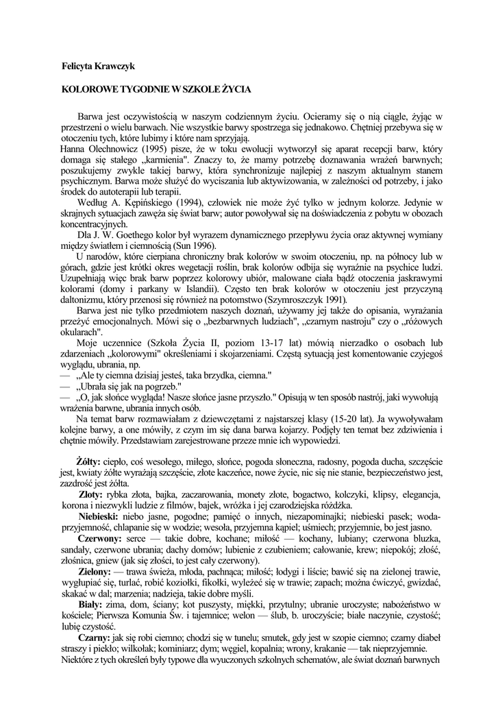 Felicyta Krawczyk KOLOROWE TYGODNIE W SZKOLE ŻYCIA Barwa jest oczywistością w naszym codziennym życiu. Ocieramy się o nią ciągle, żyjąc w przestrzeni o wielu barwach. Nie wszystkie barwy spostrzega się jednakowo. Chętniej przebywa się w otoczeniu tych, które lubimy i które nam sprzyjają. Hanna Olechnowicz (1995) pisze, że w toku ewolucji wytworzył się aparat recepcji barw, który domaga się stałego „karmienia". Znaczy to, że mamy potrzebę doznawania wrażeń barwnych; poszukujemy zwykle takiej barwy, która synchronizuje najlepiej z naszym aktualnym stanem psychicznym. Barwa może służyć do wyciszania lub aktywizowania, w zależności od potrzeby, i jako środek do autoterapii lub terapii. Według A. Kępińskiego (1994), człowiek nie może żyć tylko w jednym kolorze. Jedynie w skrajnych sytuacjach zawęża się świat barw; autor powoływał się na doświadczenia z pobytu w obozach koncentracyjnych. Dla J. W. Goethego kolor był wyrazem dynamicznego przepływu życia oraz aktywnej wymiany między światłem i ciemnością (Sun 1996). U narodów, które cierpiana chroniczny brak kolorów w swoim otoczeniu, np. na północy lub w górach, gdzie jest krótki okres wegetacji roślin, brak kolorów odbija się wyraźnie na psychice ludzi. Uzupełniają więc brak barw poprzez kolorowy ubiór, malowane ciała bądź otoczenia jaskrawymi kolorami (domy i parkany w Islandii). Często ten brak kolorów w otoczeniu jest przyczyną daltonizmu, który przenosi się również na potomstwo (Szymroszczyk 1991). Barwa jest nie tylko przedmiotem naszych doznań, używamy jej także do opisania, wyrażania przeżyć emocjonalnych. Mówi się o „bezbarwnych ludziach", „czarnym nastroju" czy o „różowych okularach". Moje uczennice (Szkoła Życia II, poziom 13-17 lat) mówią nierzadko o osobach lub zdarzeniach „kolorowymi" określeniami i skojarzeniami. Częstą sytuacją jest komentowanie czyjegoś wyglądu, ubrania, np. — „Ale ty ciemna dzisiaj jesteś, taka brzydka, ciemna." — „Ubrała się jak na pogrzeb." — „O, jak słońce wygląda! Nasze słońce jasne przyszło." Opisują w ten sposób nastrój, jaki wywołują wrażenia barwne, ubrania innych osób. Na temat barw rozmawiałam z dziewczętami z najstarszej klasy (15-20 lat). Ja wywoływałam kolejne barwy, a one mówiły, z czym im się dana barwa kojarzy. Podjęły ten temat bez zdziwienia i chętnie mówiły. Przedstawiam zarejestrowane przeze mnie ich wypowiedzi. Żółty: ciepło, coś wesołego, miłego, słońce, pogoda słoneczna, radosny, pogoda ducha, szczęście jest, kwiaty żółte wyrażają szczęście, złote kaczeńce, nowe życie, nic się nie stanie, bezpieczeństwo jest, zazdrość jest żółta. Zloty: rybka złota, bajka, zaczarowania, monety złote, bogactwo, kolczyki, klipsy, elegancja, korona i niezwykli ludzie z filmów, bajek, wróżka i jej czarodziejska różdżka. Niebieski: niebo jasne, pogodne; pamięć o innych, niezapominajki; niebieski pasek; wodaprzyjemność, chlapanie się w wodzie; wesoła, przyjemna kąpiel; uśmiech; przyjemnie, bo jest jasno. Czerwony: serce — takie dobre, kochane; miłość — kochany, lubiany; czerwona bluzka, sandały, czerwone ubrania; dachy domów; lubienie z czubieniem; całowanie, krew; niepokój; złość, złośnica, gniew (jak się złości, to jest cały czerwony). Zielony: — trawa świeża, młoda, pachnąca; miłość; łodygi i liście; bawić się na zielonej trawie, wygłupiać się, turlać, robić koziołki, fikołki, wyleżeć się w trawie; zapach; można ćwiczyć, gwizdać, skakać w dal; marzenia; nadzieja, takie dobre myśli. Biały: zima, dom, ściany; kot puszysty, miękki, przytulny; ubranie uroczyste; nabożeństwo w kościele; Pierwsza Komunia Św. i tajemnice; welon — ślub, b. uroczyście; białe naczynie, czystość; lubię czystość. Czarny: jak się robi ciemno; chodzi się w tunelu; smutek, gdy jest w szopie ciemno; czarny diabeł straszy i piekło; wilkołak; kominiarz; dym; węgiel, kopalnia; wrony, krakanie — tak nieprzyjemnie. Niektóre z tych określeń były typowe dla wyuczonych szkolnych schematów, ale świat doznań barwnych dzieci upośledzonych niczym się nie różnił od naszego. H. Poświatowska (1993) pisała przecież całkiem podobnie: „Kolor wiosny jest zielony, a kolor bólu — ciemny..." Przywołanie wrażeń w odpowiedzi na kolor nie było trudnym zadaniem. Wręcz przeciwnie, dziewczęta angażowały się mimowolnie, mimo że była to zwykle rozmowa w czasie odpoczynku. Być może czuły podobnie jak Poświatowska, gdy w jednym ze swych wierszy pisała: „Lubię tęsknić wspinać się po poręczy dźwięku i koloru..." Bogate wypowiedzi dziewcząt sprowokowały mnie, żeby kolor uczynić tematem pracy szkolnej. Barwa pozostaje w codziennym życiu w zasięgu ręki, a więc umiejętność korzystania z niej jest pożyteczna. Niestety, często barwy służą w pracy z dziećmi w szkole życia głównie jako materiał do ćwiczeń, a następnie do odpytania i zarazem opisywania niedostatków w ich funkcjonowaniu. Istnieje tendencja do skupiania się głównie na wyuczeniu kolorów. Mniej ważne stają się wtedy wrażenia, jakie wywołują barwy i ich oddziaływanie. Pracowałam z klasą przez kilka miesięcy, skupiając się nad kolejnymi barwami. Był to swoisty „trening wrażliwości" w obcowaniu z barwą. Ten cykl tematyczny zaczęłam realizować wiosną, która jest przecież czasem „rodzenia się" barw w naturze. Pojawiające się kolejno barwy stawały się tematem pracy szkolnej. Pora roku nie była najważniejszym argumentem w tej pracy, tylko ułatwieniem. Otoczenie dostarczało różnorodnego materiału. Ogłosiłam pewnego dnia „zielony tydzień". Praca nad tym kolorem i kolejnymi opierała się na podobnym schemacie. Oto przykłady z „obróbki" barwy zielonej. Otaczająca rzeczywistość była zawsze punktem wyjścia. Praca nad daną barwą rozpoczyna