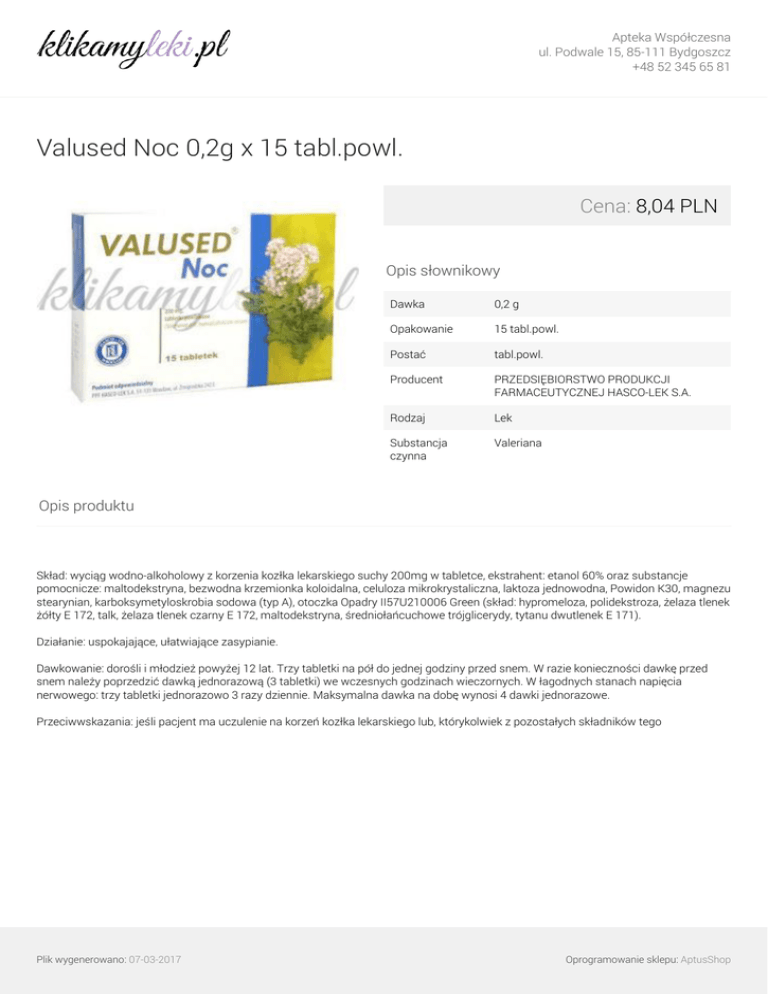 Apteka Współczesna ul. Podwale 15, 85-111 Bydgoszcz +48 52 345 65 81 Valused Noc 0,2g x 15 tabl.powl. Cena: 8,04 PLN Opis słownikowy Dawka 0,2 g Opakowanie 15 tabl.powl. Postać tabl.powl. Producent PRZEDSIĘBIORSTWO PRODUKCJI FARMACEUTYCZNEJ HASCO-LEK S.A. Rodzaj Lek Substancja czynna Valeriana Opis produktu Skład: wyciąg wodno-alkoholowy z korzenia kozłka lekarskiego suchy 200mg w tabletce, ekstrahent: etanol 60% oraz substancje pomocnicze: maltodekstryna, bezwodna krzemionka koloidalna, celuloza mikrokrystaliczna, laktoza jednowodna, Powidon K30, magnezu stearynian, karboksymetyloskrobia sodowa (typ A), otoczka Opadry II57U210006 Green (skład: hypromeloza, polidekstroza, żelaza tlenek żółty E 172, talk, żelaza tlenek czarny E 172, maltodekstryna, średniołańcuchowe trójglicerydy, tytanu dwutlenek E 171). Działanie: uspokajające, ułatwiające zasypianie. Dawkowanie: dorośli i młodzież powyżej 12 lat. Trzy tabletki na pół do jednej godziny przed snem. W razie konieczności dawkę przed snem należy poprzedzić dawką jednorazową (3 tabletki) we wczesnych godzinach wieczornych. W łagodnych stanach napięcia nerwowego: trzy tabletki jednorazowo 3 razy dziennie. Maksymalna dawka na dobę wynosi 4 dawki jednorazowe. Przeciwwskazania: jeśli pacjent ma uczulenie na korzeń kozłka lekarskiego lub, którykolwiek z pozostałych składników tego Plik wygenerowano: 07-03-2017 Powered by TCPDF (www.tcpdf.org) Oprogramowanie sklepu: AptusShop
