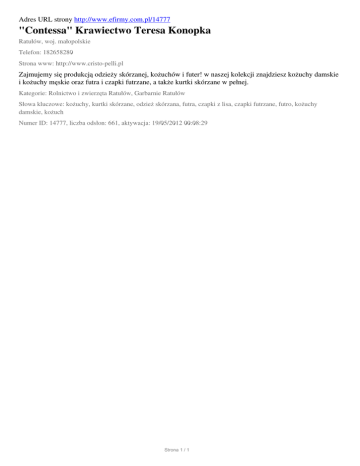 Adres URL strony http://www.efirmy.com.pl/14777 "Contessa" Krawiectwo Teresa Konopka Ratułów, woj. małopolskie Telefon: 182658280 Strona www: http://www.cristo-pelli.pl Zajmujemy się produkcją odzieży skórzanej, kożuchów i futer! w naszej kolekcji znajdziesz kożuchy damskie i kożuchy męskie oraz futra i czapki futrzane, a także kurtki skórzane w pełnej. Kategorie: Rolnictwo i zwierzęta Ratułów, Garbarnie Ratułów Słowa kluczowe: kożuchy, kurtki skórzane, odzież skórzana, futra, czapki z lisa, czapki futrzane, futro, kożuchy damskie, kożuch Numer ID: 14777, liczba odsłon: 661, aktywacja: 19/05/2012 00:08:29 Strona 1 / 1
