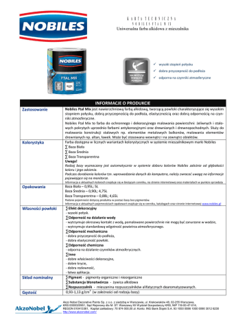 KARTA TECHNICZNA NOBILES FTAL MIX Uniwersalna farba alkidowa z mieszalnika ü wysoki stopień połysku ü dobra przyczepność do podłoża ü odporna na czynniki atmosferyczne INFORMACJE O PRODUKCIE Zastosowanie Kolorystyka Nobiles Ftal Mix jest nawierzchniową farbą alkidową, tworzącą powłoki charakteryzujące się wysokim stopniem połysku, dobrą przyczepnością do podłoża, elastycznością oraz dobrą odpornością na czynniki atmosferyczne. Nobiles Ftal Mix to farba do ochronnego i dekoracyjnego malowania powierzchni: żeliwnych i stalowych pokrytych uprzednio farbami antykorozyjnymi oraz drewnianych i drewnopochodnych. Służy do malowania konstrukcji stalowych np. elementów metalowych balkonów, malowania elementów drewnianych np. altan, ławek. Może być stosowana wewnątrz i na zewnątrz obiektów. Farba dostępna w licznych wariantach kolorystycznych w systemie mieszalnikowym marki Nobiles · Baza Biała · Baza Średnia · Baza Transparentna Uwaga! Rodzaj bazy wyznaczany jest automatycznie w systemie doboru kolorów Nobiles zależnie od głębokości koloru i jego odcienia. Podczas dorabiania kolorów tzn. wprowadzania danych do komputera, należy zwracać uwagę na informacje pojawiające się na monitorze. Informacja o aktualnych kolorach znajduje się w bieżącym cenniku, na stronie internetowej oraz materiałach w punkcie sprzedaży Opakowania Baza Biała – 0,95L; 5L Baza Średnia – 0,90L; 4,75L Baza Transparentna – 0,88L; 4,65L Podane pojemności dotyczą produktu w postaci bazy bez pigmentów. Informacja o aktualnych pojemnościach opakowań znajduje się w cenniku, katalogach oraz stronie internetowej www.nobiles.pl Własności powłoki · Efekt dekoracyjny - wysoki połysk. · Odporność na działanie wody - wytrzymuje okresowy kontakt z wodą, pomalowane powierzchnie nie mogą być zanurzone w wodzie, - wytrzymuje standardową wilgotność powietrza atmosferycznego. · Odporność mechaniczna - dobra przyczepność do podłoża, - dobra elastyczność powłoki. · Odporność chemiczna - odporna na działanie czynników atmosferycznych. · Inne - dobre właściwości dekoracyjne, - dobre krycie, - dobra rozlewność, - łatwa aplikacja. Skład nominalny Gęstość · Pigment - pigmenty organiczne i nieorganiczne · Substancja błonotwórcza - żywica alkidowa · Rozpuszczalnik - mieszanina rozpuszczalników alifatycznych dearomatyzowanych. 0,93-1,13 g/cm3 (w zależności od rodzaju bazy) Akzo Nobel Decorative Paints Sp. z o.o. z siedzibą w Warszawie, ul. Krakowiaków 48, 02-255 Warszawa, KRS 0000020951, Sąd Rejonowy dla M. ST. Warszawy XII Wydział Gospodarczy KRS, NIP 118-00-47-014, REGON 010413361, Kapitał zakładowy: 70 874 000,00 zł. Konto: ING Bank Śląski S.A. 93 1050 0086 1000 0090 3012 6230 http://www.akzonobel.com/ KARTA TECHNICZNA NOBILES FTAL MIX Uniwersalna farba alkidowa z mieszalnika LZO Schnięcie Limit zawartości LZO (kat.:A/d): 300g/l (2010). Produkt zawiera max 299g/l LZO Dla pojedynczej warstwy, w temperaturze ok.+230C i wilgotności względnej ok. 50%, przy dobrej wentylacji: - do schnięcia powierzchniowego – 5 godzin - do nakładania następnej warstwy – 18 godzin Ostrożne użytkowanie wymalowanej powierzchni można dopuścić po 24 godzinach. Obniżenie temperatury i/lub wzrost wilgotności może wydłużyć czas schnięcia. Ilość warstw Wydajność Rozcieńczalnik Okres ważności 2 warstwy Do 12 m2/l przy jednokrotnym malowaniu na gładkiej, równej i odpowiednio przygotowanej powierzchni podłoża. Nobiles Rozcieńczalnik do farb i emalii ogólnego stosowania. Okres przydatności: 2 lata od daty produkcji. Dane identyfikujące wyrób oraz termin upływu ważności wyrobu podawany jest na opakowaniu jednostkowym. STOSOWANIE PRODUKTU Przygotowanie wyrobu Przygotowanie podłoża Nie rozcieńczać emalii. Nie dodawać obcych składników. Przed użyciem farbę dokładnie wymieszać. Podłoża stalowe i żeliwne: Podłoże przed malowaniem musi być: - suche, - czyste i odtłuszczone (bez zabrudzeń – kurzu, piasku, plam, nalotów organicznych itp.), - wolne od wszelkiego wadliwego materiału (oleju, smaru, słabo przyczepnych powłok farb, zgorzeliny, luźnej rdzy itp.), - podłoża wcześniej nie malowane należy zagruntować podkładem Nobiles Nobikor. Warstwę podkładową należy przeszlifować drobnoziarnistym papierem ściernym, usunąć powstały pył i kurz. Podłoża drewniane: Podłoże przed malowaniem musi być: - suche, - czyste i odtłuszczone (bez zabrudzeń – kurzu, piasku, plam, nalotów organicznych itp.), - wolne od wszelkiego wadliwego materiału (oleju, smaru, słabo przyczepnych powłok farb), - elementy drewniane narażone na działanie czynników atmosferycznych zabezpieczyć impregnatem technicznym, - nowe niemalowane wcześniej powierzchnie zagruntuj odpowiednią farba podkładową lub farbą Nobiles Ftal Mix poprzez mocne wtarcie pędzlem w podłoże. Podłoża poddane renowacji: - usunąć resztki starej, łuszczącej się i skorodowanej powłoki, - powierzchnię przeszlifować drobnoziarnistym papierem ściernym, odpylić i odtłuścić - ubytki i spękania uzupełnić zgodnie ze sztuką budowlaną, - odsłonięte fragmenty podłoża zagruntować odpowiednim podkładem. Uwaga! Na podłożach uprzednio malowanych wykonaj na małej powierzchni wymalowanie próbne. Jeżeli po wyschnięciu farby powstanie niepożądany efekt należy stare powłoki całkowicie usunąć i na nowo przygotować podłoże zgodnie z powyższymi wskazówkami. Szlifowanie na sucho powoduje powstawanie kurzu i pyłu. Zalecamy stosować odpowiednie środki ochrony dróg oddechowych. Malowanie · Warunki malowania - temperatura otoczenia i malowanej powierzchni powinna być pomiędzy +50C a +300C - wilgotność względna powietrza powinna być niższa niż 80% - nie malować w wilgotnych warunkach(np. w czasie lub kiedy istnieje prawdopodobieństwo deszczu, mgły, śniegu), w upalne popołudnia oraz przy silnym w